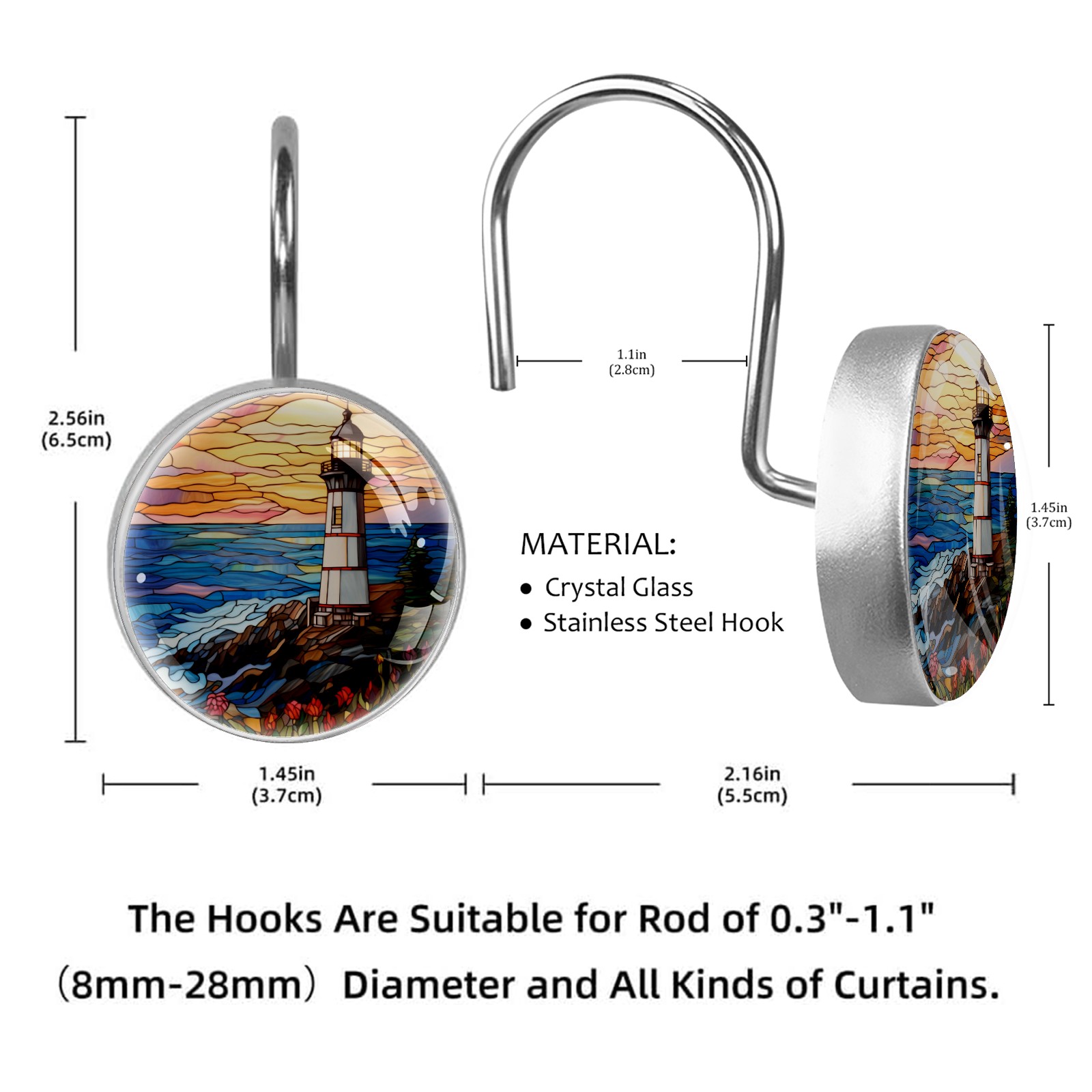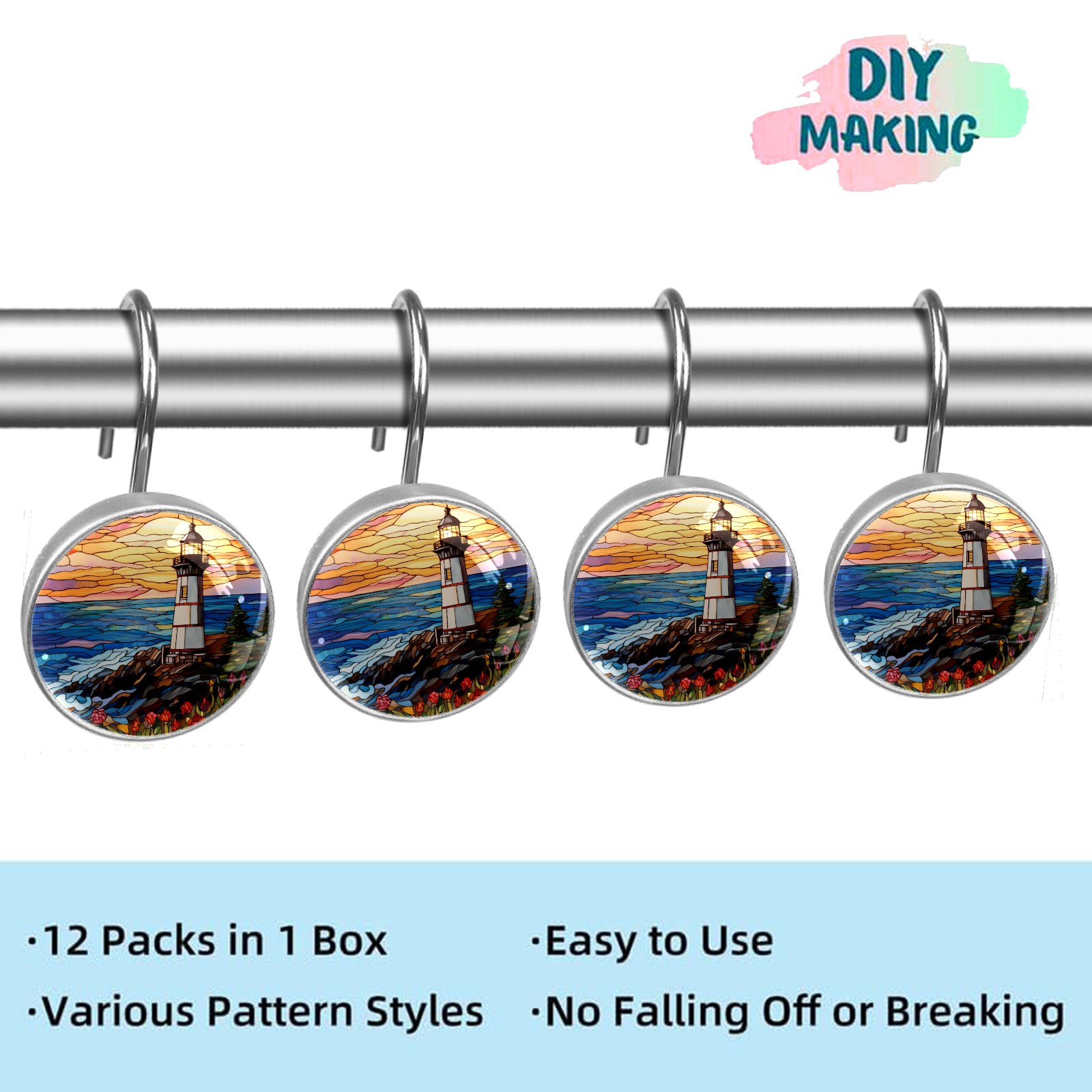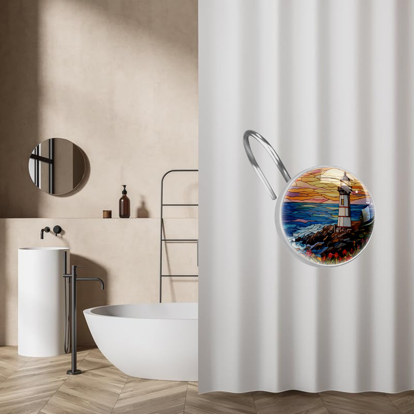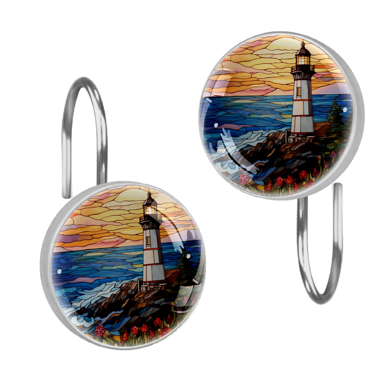 Decorative Stained Glass Lighthouse Shower Curtain Hooks 12pcs Crystal Glass Rustproof Shower Hooks for Bathroom Home Decor Stainless Steel Resin Shower Curtain Rings