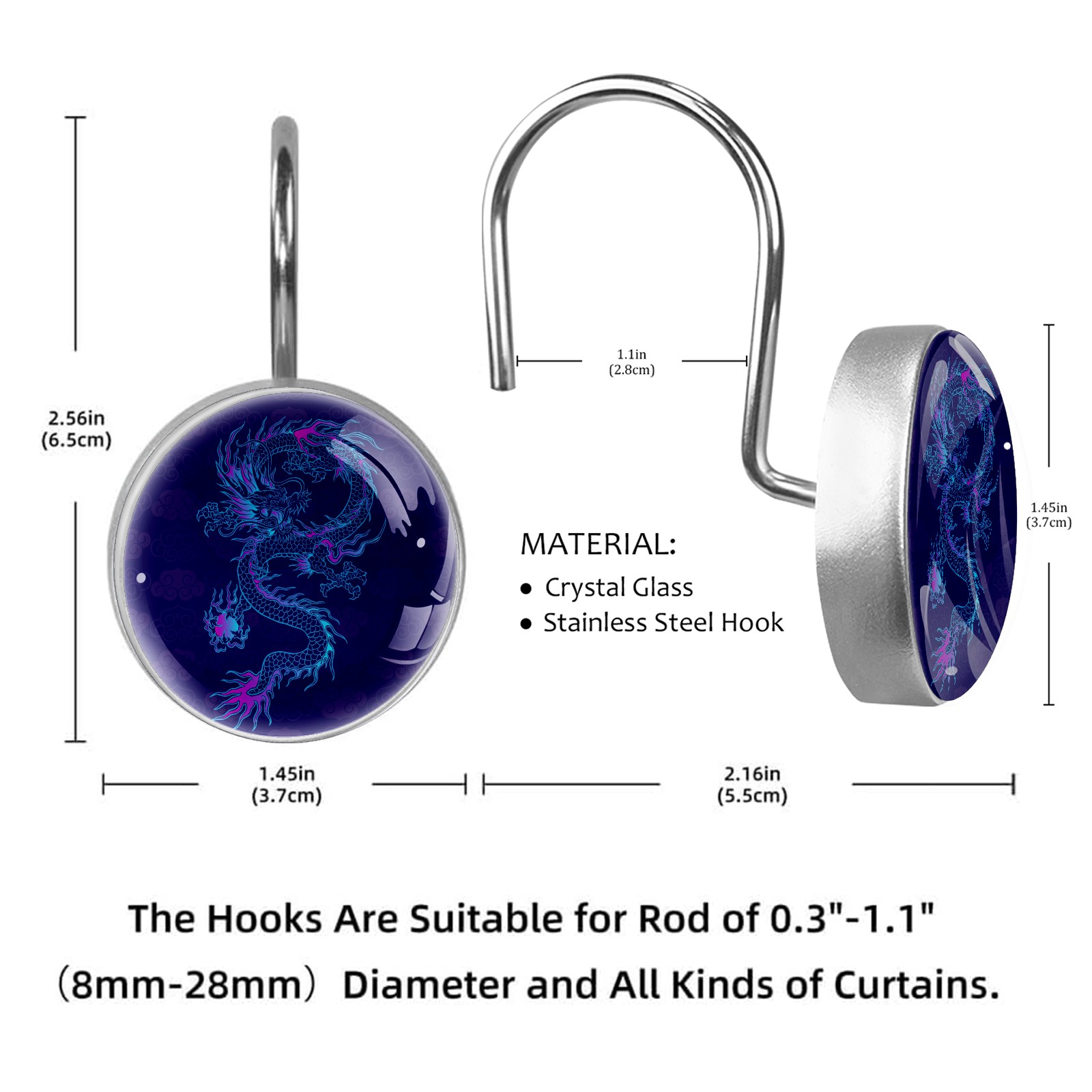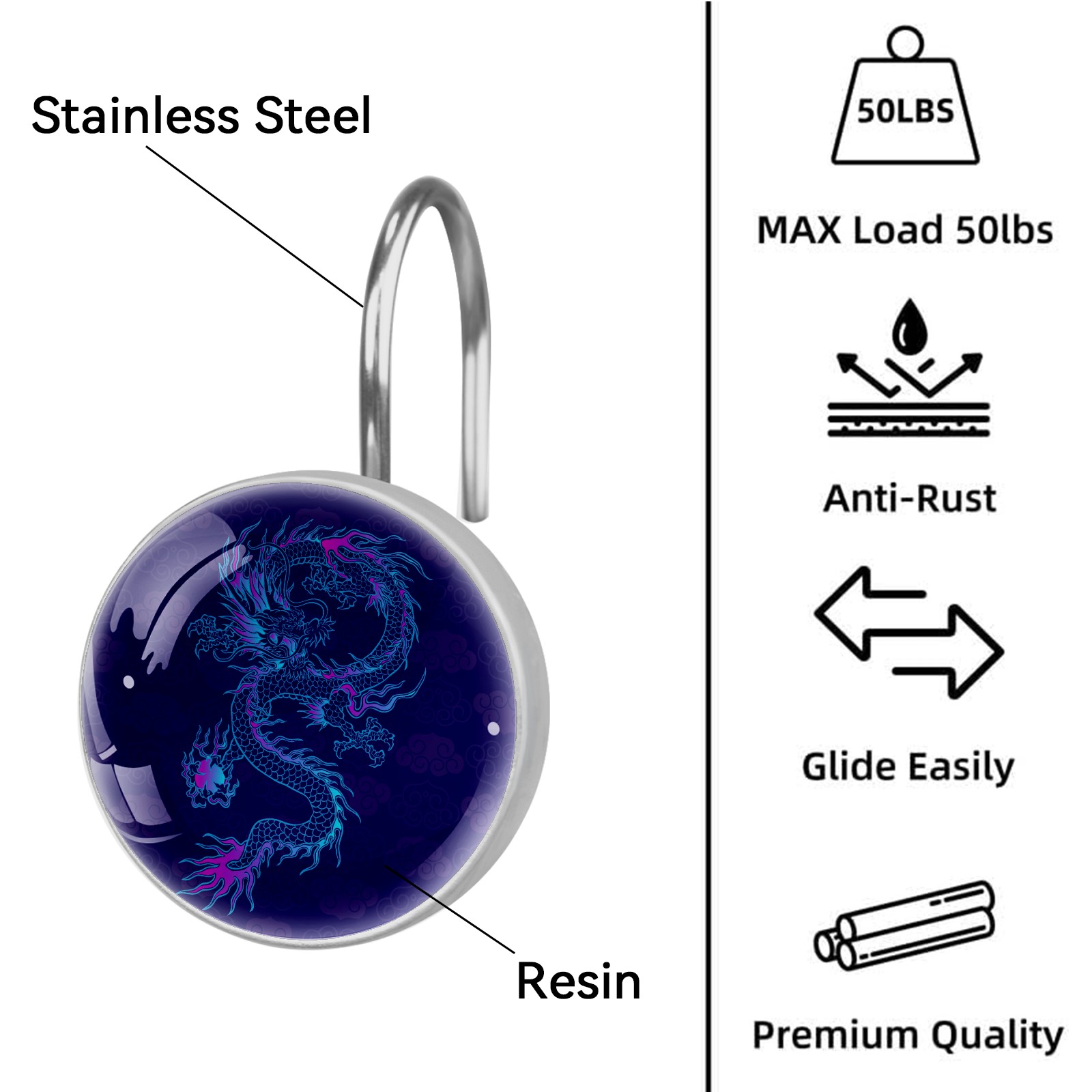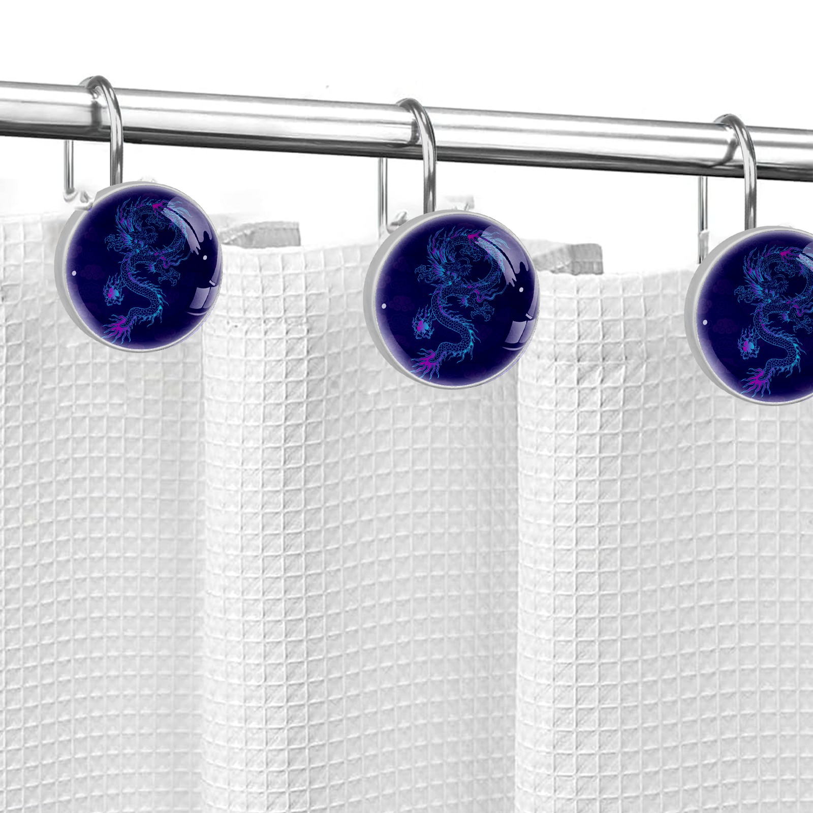 Decorative Vinatge Navy Blue Dragon Shower Curtain Hooks 12pcs Crystal Glass Rustproof Shower Hooks for Bathroom Home Decor Stainless Steel Resin Shower Curtain Rings