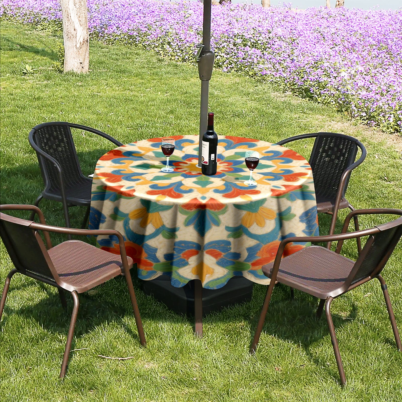 • <p>Constructed with heavy-duty polyester fabric, this tablecloth withstands outdoor wear while maintaining a clean appearance. The adjustable zipper hole accommodates umbrella poles of varying thickness, allowing installation without disassembling the umbrella stand.</p> <p>Ideal for backyard BBQs or cafe patios, this tablecloth elevates table presentation instantly. Available in two classic sizes, the precision circular cut ensures full table coverage. </p> <p>Machine washable in cold water without color fading or shape distortion. The lightweight fabric folds compactly for space-efficient storage between uses.</p>