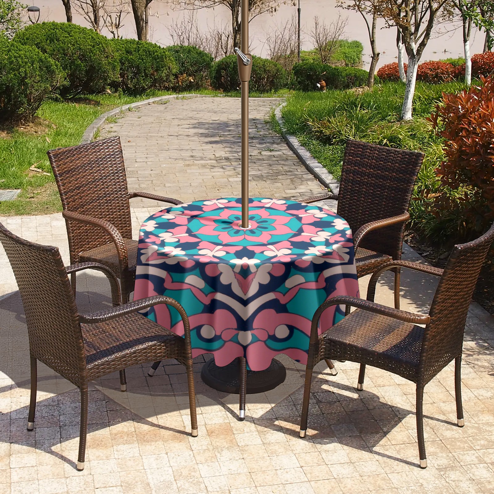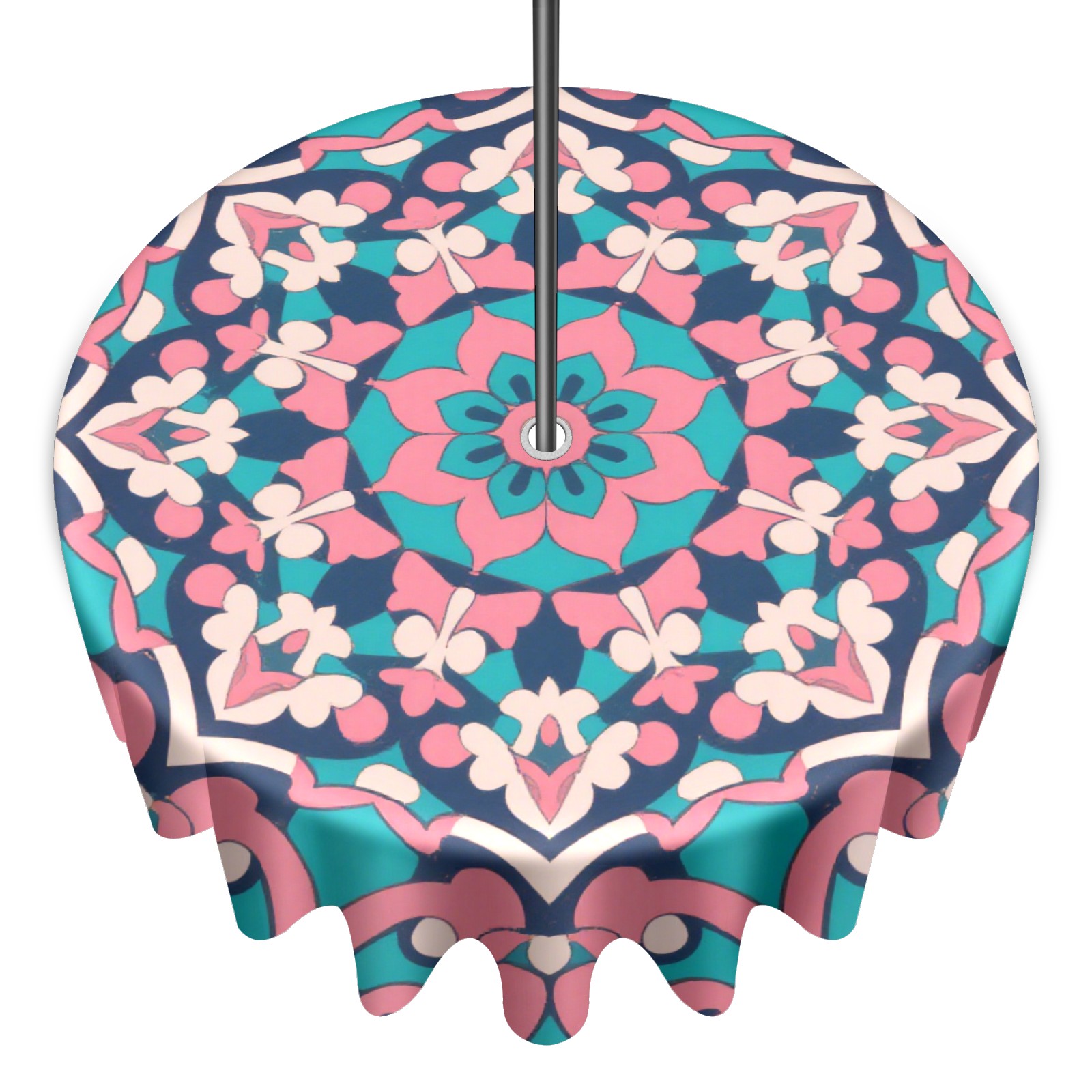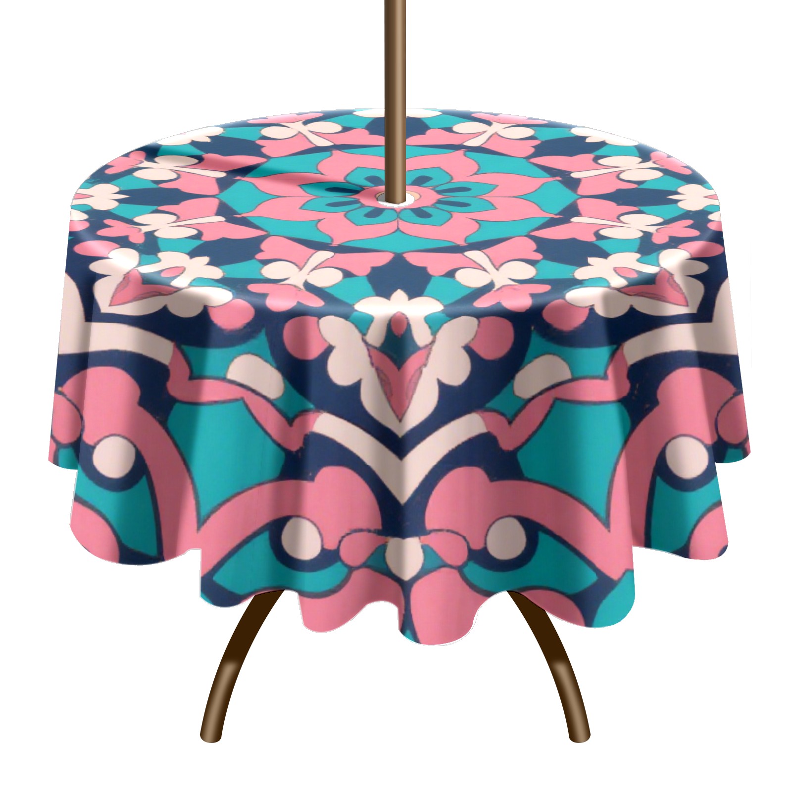 Round Tablecloth with Adjustable Zippered Hole - Durable Polyester for Patio, Restaurant & Outdoor Dining Pink Green Symmetrical Pattern (60in)