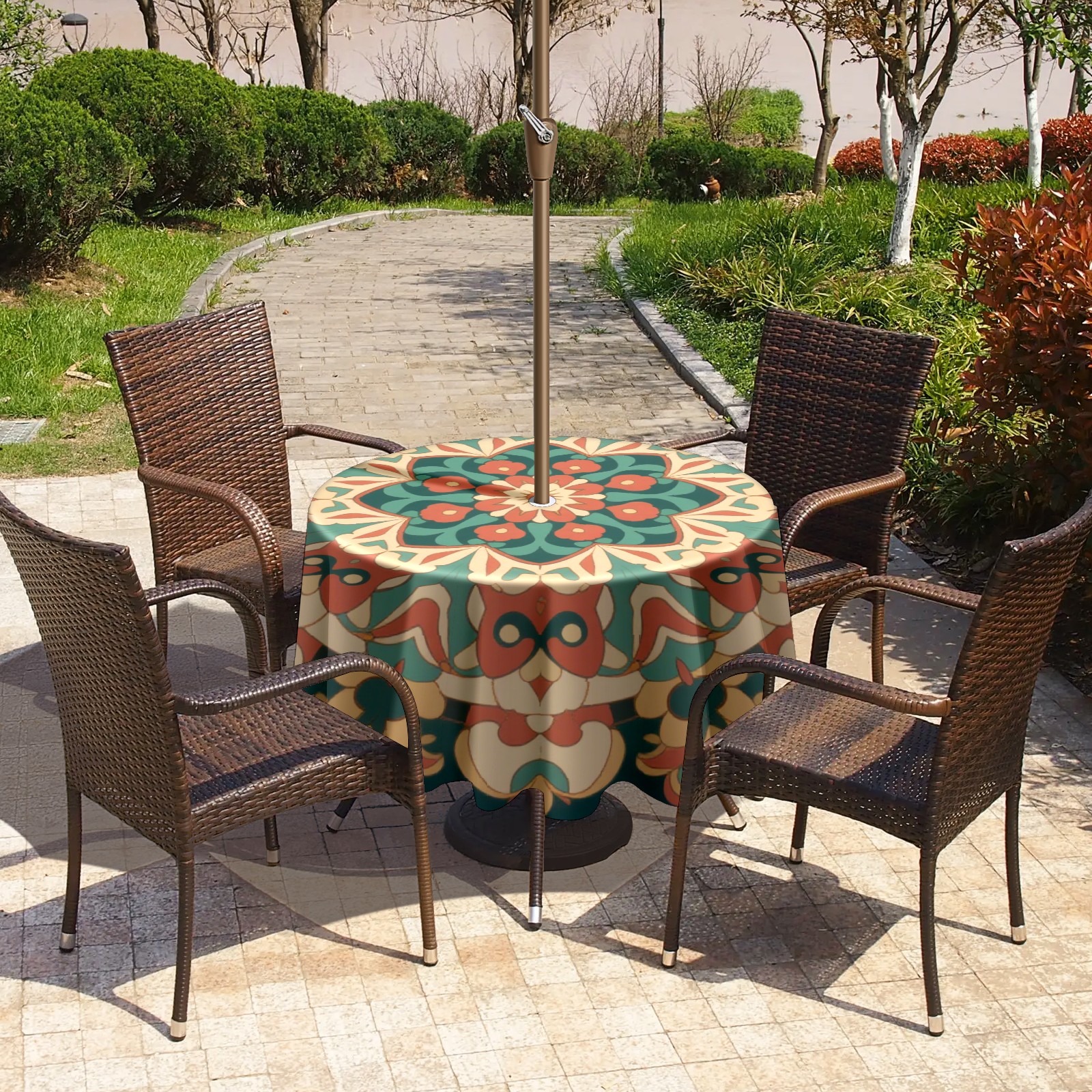• <p>Constructed with heavy-duty polyester fabric, this tablecloth withstands outdoor wear while maintaining a clean appearance. The adjustable zipper hole accommodates umbrella poles of varying thickness, allowing installation without disassembling the umbrella stand.</p> <p>Ideal for backyard BBQs or cafe patios, this tablecloth elevates table presentation instantly. Available in two classic sizes, the precision circular cut ensures full table coverage. </p> <p>Machine washable in cold water without color fading or shape distortion. The lightweight fabric folds compactly for space-efficient storage between uses.</p>