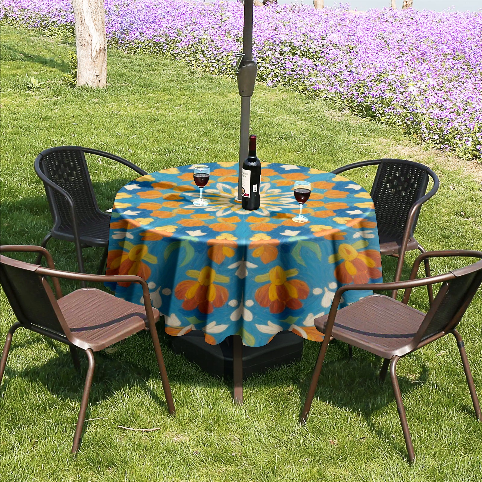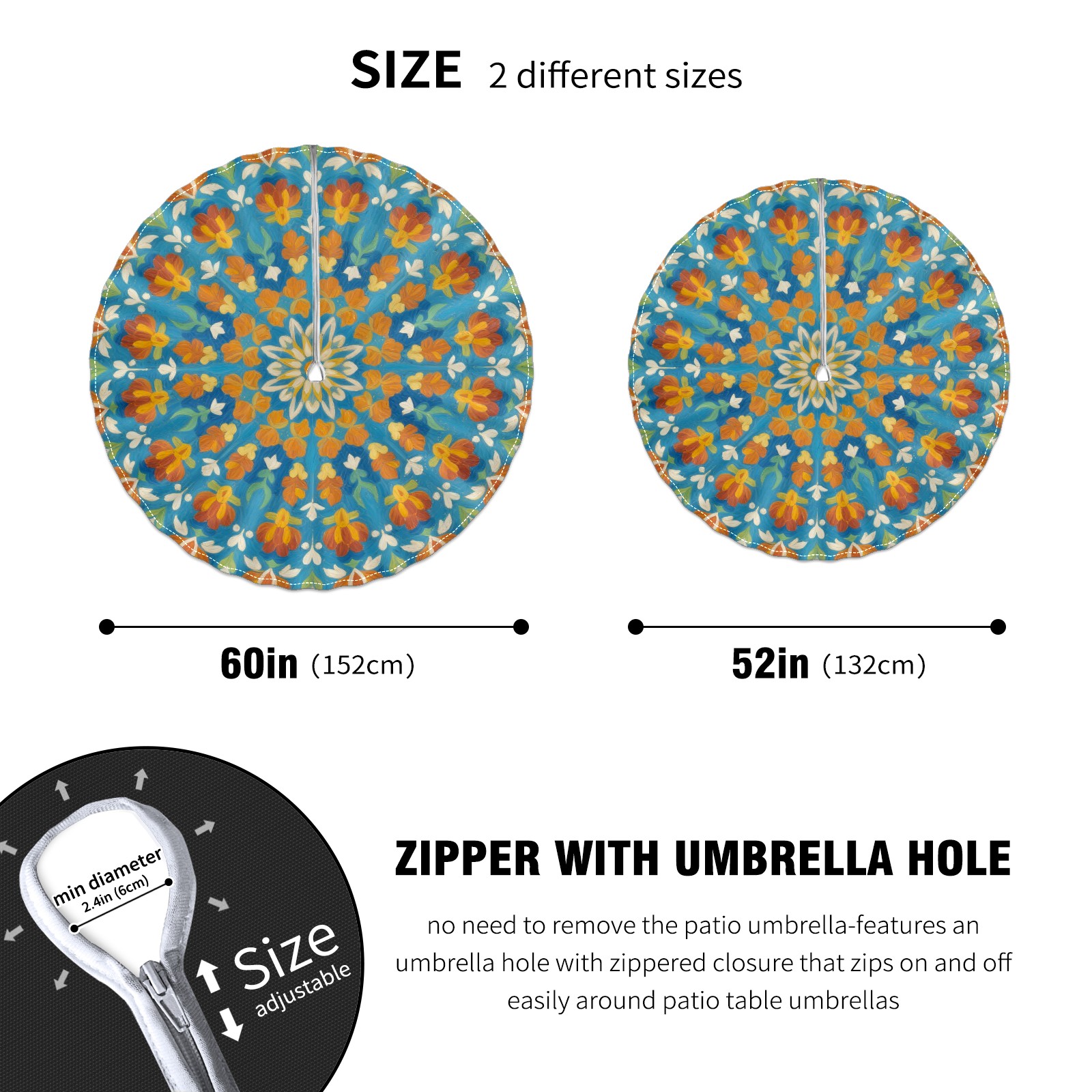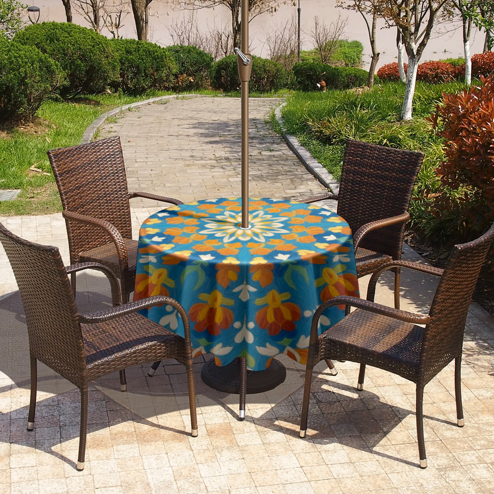 • <p>Constructed with heavy-duty polyester fabric, this tablecloth withstands outdoor wear while maintaining a clean appearance. The adjustable zipper hole accommodates umbrella poles of varying thickness, allowing installation without disassembling the umbrella stand.</p> <p>Ideal for backyard BBQs or cafe patios, this tablecloth elevates table presentation instantly. Available in two classic sizes, the precision circular cut ensures full table coverage. </p> <p>Machine washable in cold water without color fading or shape distortion. The lightweight fabric folds compactly for space-efficient storage between uses.</p>
