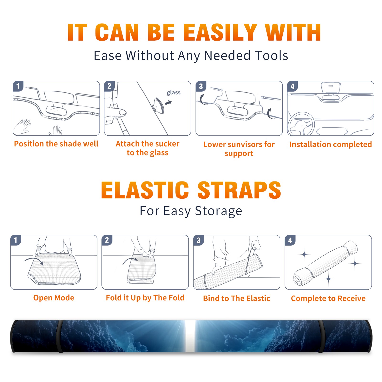<p><b>Foldable Car Sun Shade for Windshield | UV Protection &amp; Heat Blocking | Universal Windshield Sun Shade Fit for Cars,Trucks,SUVs</b></p> <p><b>Reflective Aluminum Core</b></p> <p>The 3-layer construction (aluminum foil + double-layer bubble + 420D polyester) blocks UV rays and keeps the temperature of the car down compared to exposed vehicles on hot days.</p> <p><b>Electronics &amp; Interior Safeguard</b></p> <p>This car sunshade for windshield offers excellent reflection, preventing LCD screen glare, GPS malfunctions, and leather upholstery cracks caused by prolonged solar exposure.</p> <p><b>Wide Compatibility for Various Vehicle Types</b></p> <p>Crafted at 55"L x 30"W (140x76 cm), this windshield sunshade is designed to fit most cars, SUVs, and trucks, ensuring full coverage without adding bulk. Our UV-resistant and tear-resistant car sunshade is easy to install without tools. Its foldable design makes it convenient to adjust and store, taking up minimal space in your vehicle.</p> <p><b>Ideal For</b></p> <p>Daily commuters needing heat reduction from a car sunshade for windshield.</p> <p>RV and overlanding enthusiasts requiring sturdy&nbsp;front windshield sunshades.</p> <p>Luxury car owners need to prevent the fading of the car's interior.</p>