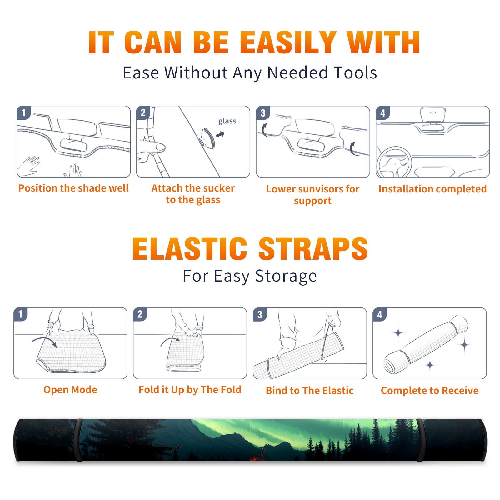 <p><b>Foldable Car Sun Shade for Windshield | UV Protection &amp; Heat Blocking | Universal Windshield Sun Shade Fit for Cars,Trucks,SUVs</b></p> <p><b>Reflective Aluminum Core</b></p> <p>The 3-layer construction (aluminum foil + double-layer bubble + 420D polyester) blocks UV rays and keeps the temperature of the car down compared to exposed vehicles on hot days.</p> <p><b>Electronics &amp; Interior Safeguard</b></p> <p>This car sunshade for windshield offers excellent reflection, preventing LCD screen glare, GPS malfunctions, and leather upholstery cracks caused by prolonged solar exposure.</p> <p><b>Wide Compatibility for Various Vehicle Types</b></p> <p>Crafted at 55"L x 30"W (140x76 cm), this windshield sunshade is designed to fit most cars, SUVs, and trucks, ensuring full coverage without adding bulk. Our UV-resistant and tear-resistant car sunshade is easy to install without tools. Its foldable design makes it convenient to adjust and store, taking up minimal space in your vehicle.</p> <p><b>Ideal For</b></p> <p>Daily commuters needing heat reduction from a car sunshade for windshield.</p> <p>RV and overlanding enthusiasts requiring sturdy&nbsp;front windshield sunshades.</p> <p>Luxury car owners need to prevent the fading of the car's interior.</p>