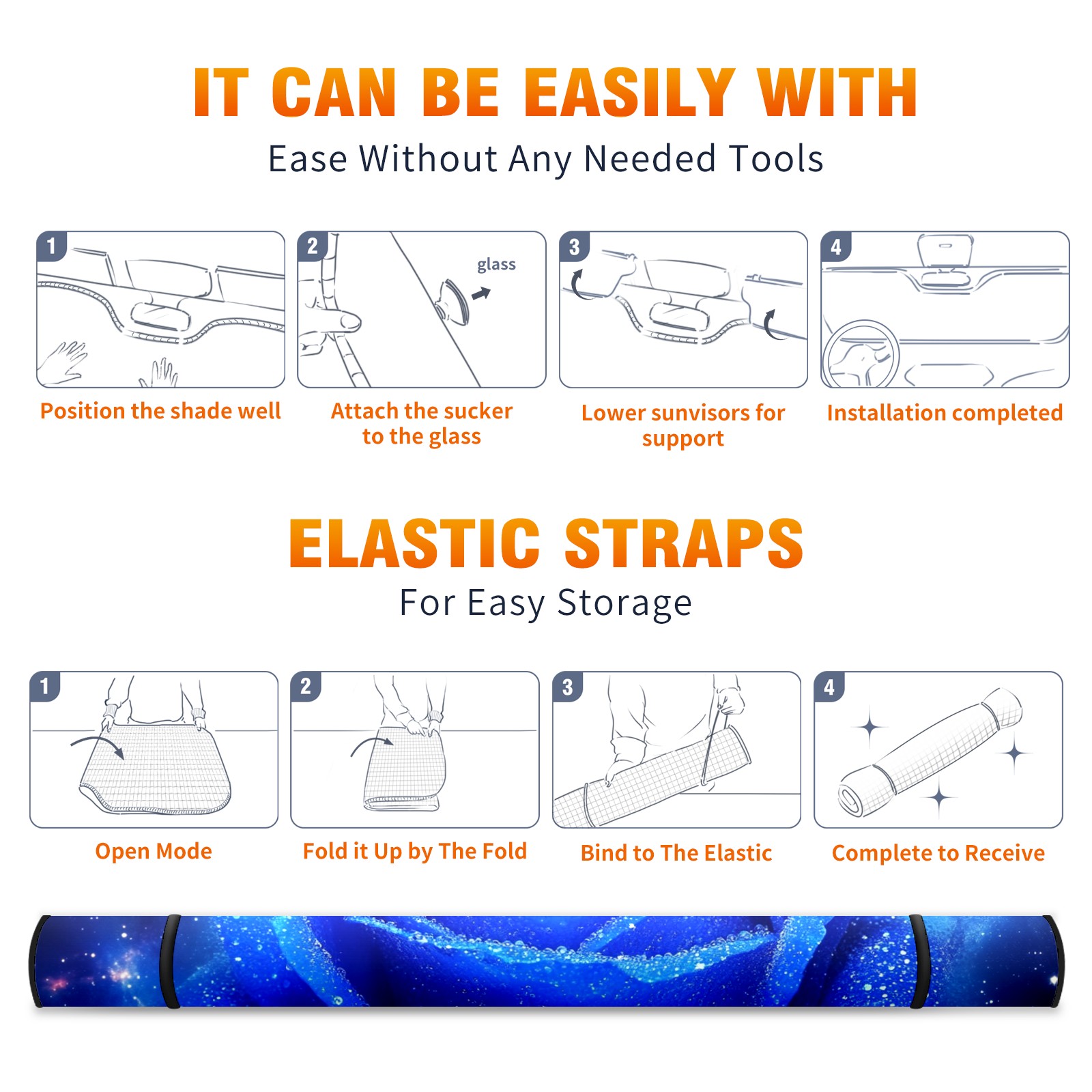 <p><b>Foldable Car Sun Shade for Windshield | UV Protection &amp; Heat Blocking | Universal Windshield Sun Shade Fit for Cars,Trucks,SUVs</b></p> <p><b>Reflective Aluminum Core</b></p> <p>The 3-layer construction (aluminum foil + double-layer bubble + 420D polyester) blocks UV rays and keeps the temperature of the car down compared to exposed vehicles on hot days.</p> <p><b>Electronics &amp; Interior Safeguard</b></p> <p>This car sunshade for windshield offers excellent reflection, preventing LCD screen glare, GPS malfunctions, and leather upholstery cracks caused by prolonged solar exposure.</p> <p><b>Wide Compatibility for Various Vehicle Types</b></p> <p>Crafted at 55"L x 30"W (140x76 cm), this windshield sunshade is designed to fit most cars, SUVs, and trucks, ensuring full coverage without adding bulk. Our UV-resistant and tear-resistant car sunshade is easy to install without tools. Its foldable design makes it convenient to adjust and store, taking up minimal space in your vehicle.</p> <p><b>Ideal For</b></p> <p>Daily commuters needing heat reduction from a car sunshade for windshield.</p> <p>RV and overlanding enthusiasts requiring sturdy&nbsp;front windshield sunshades.</p> <p>Luxury car owners need to prevent the fading of the car's interior.</p>