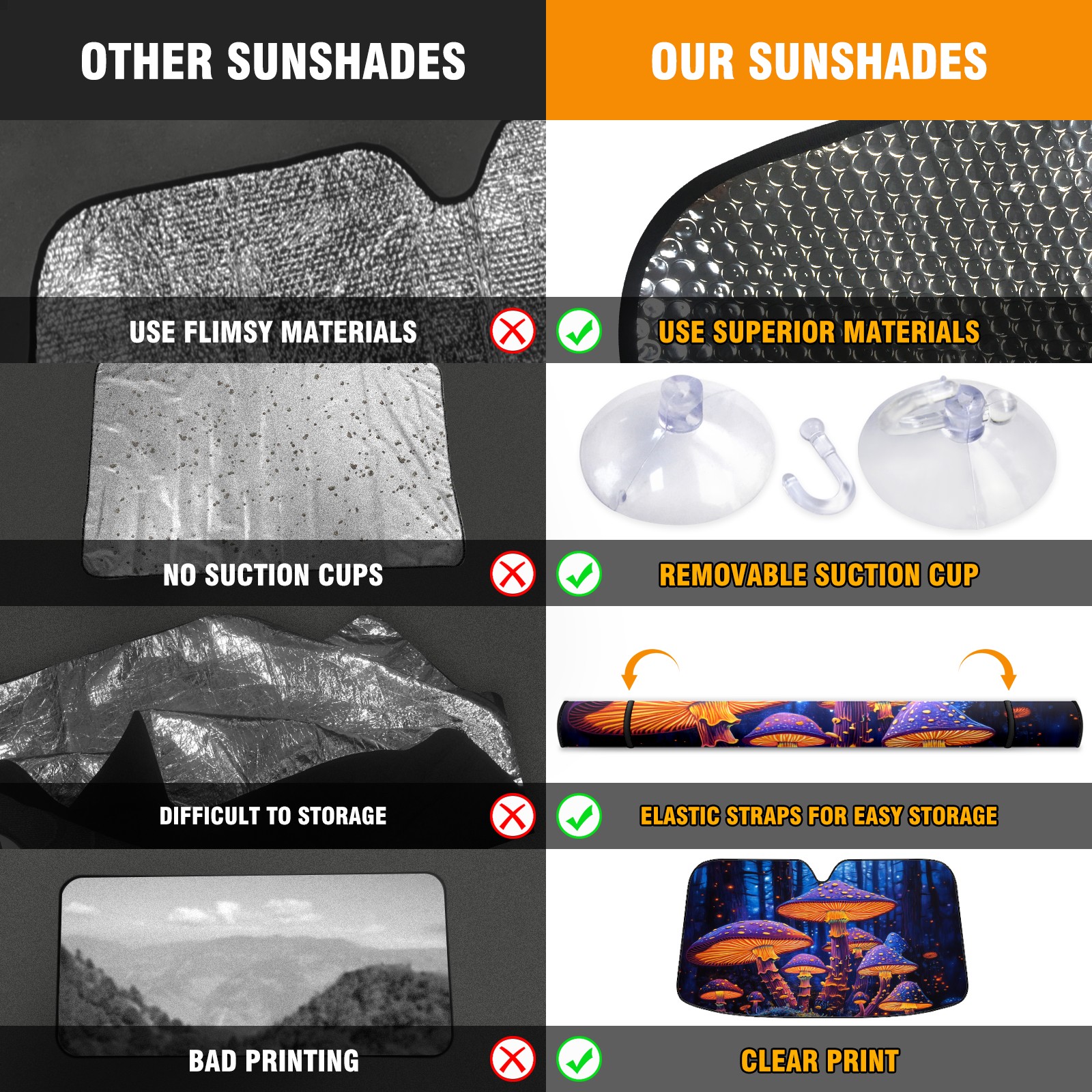 <p><b>Foldable Car Sun Shade for Windshield | UV Protection &amp; Heat Blocking | Universal Windshield Sun Shade Fit for Cars,Trucks,SUVs</b></p> <p><b>Reflective Aluminum Core</b></p> <p>The 3-layer construction (aluminum foil + double-layer bubble + 420D polyester) blocks UV rays and keeps the temperature of the car down compared to exposed vehicles on hot days.</p> <p><b>Electronics &amp; Interior Safeguard</b></p> <p>This car sunshade for windshield offers excellent reflection, preventing LCD screen glare, GPS malfunctions, and leather upholstery cracks caused by prolonged solar exposure.</p> <p><b>Wide Compatibility for Various Vehicle Types</b></p> <p>Crafted at 55"L x 30"W (140x76 cm), this windshield sunshade is designed to fit most cars, SUVs, and trucks, ensuring full coverage without adding bulk. Our UV-resistant and tear-resistant car sunshade is easy to install without tools. Its foldable design makes it convenient to adjust and store, taking up minimal space in your vehicle.</p> <p><b>Ideal For</b></p> <p>Daily commuters needing heat reduction from a car sunshade for windshield.</p> <p>RV and overlanding enthusiasts requiring sturdy&nbsp;front windshield sunshades.</p> <p>Luxury car owners need to prevent the fading of the car's interior.</p>