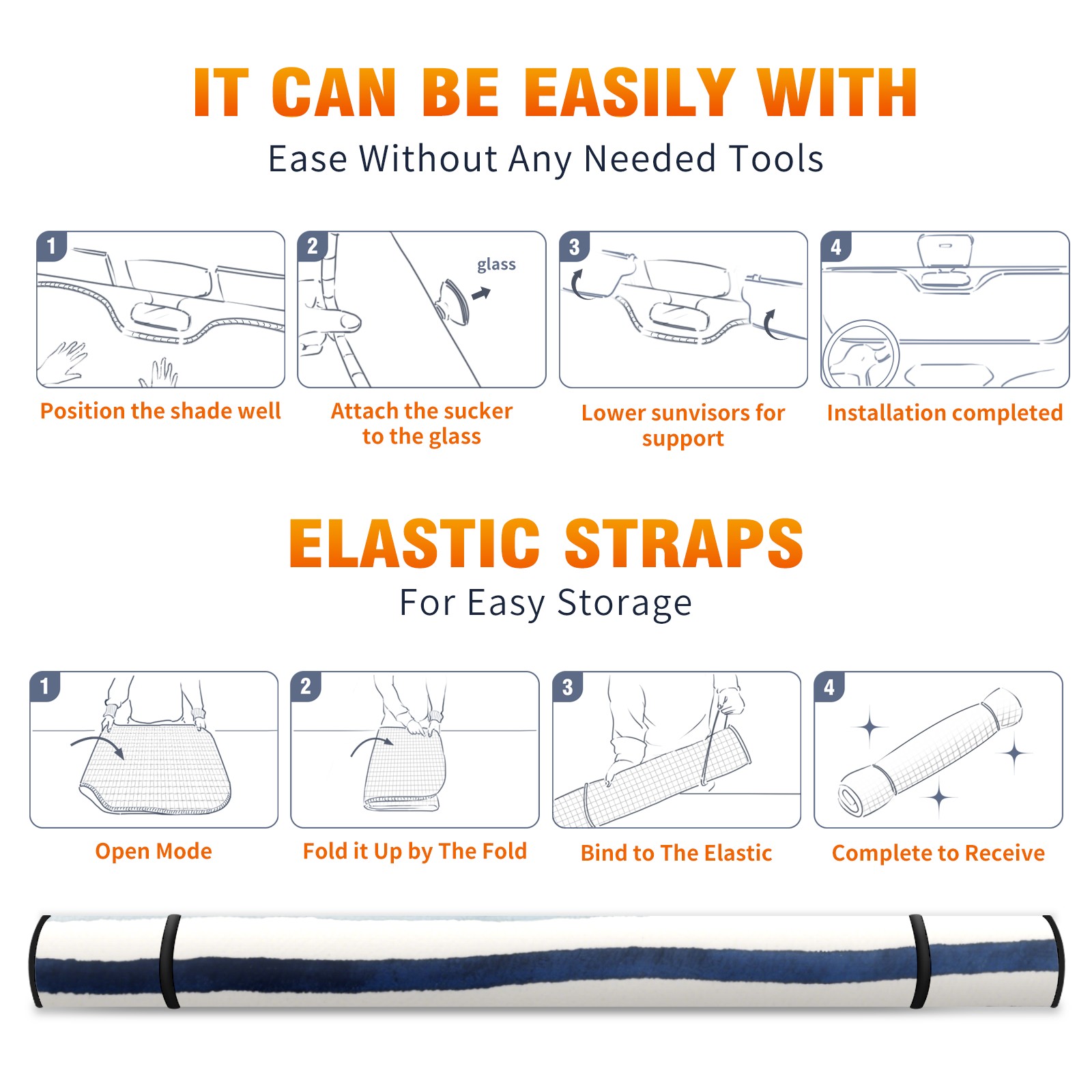 • <p><b>Foldable Premium Car Windshield Sunshade is your great solution to reduce your car’s interior temperature dramatically! This is definitely a must-have item for your summer travel!</b></p><p><b>【Precision Fit, Stylish Protection】</b></p><p>55"x30" (140x76cm) universal size with 3cm flexible margins fits curved windshields of most sedans/SUVs.</p><p><b>【Blocking Uv Rays &amp; Heat Insulation】</b></p><p>Our vehicle sunshade provides effective UV, sun, and summer heat protection, preventing leather fading and plastic cracking to keep your car interior pristine.</p><p><b>【Zero-Mark Installation &amp; Space-Saving】</b></p><p>Equipped with dual scratch-free silicone suction cups + adjustable straps: Medical-grade silicone cups hold firmly yet remove cleanly. Folds to A3 size (42x30cm x &lt;2cm thick), tucks discreetly into glove compartments or door pockets.&nbsp;</p>