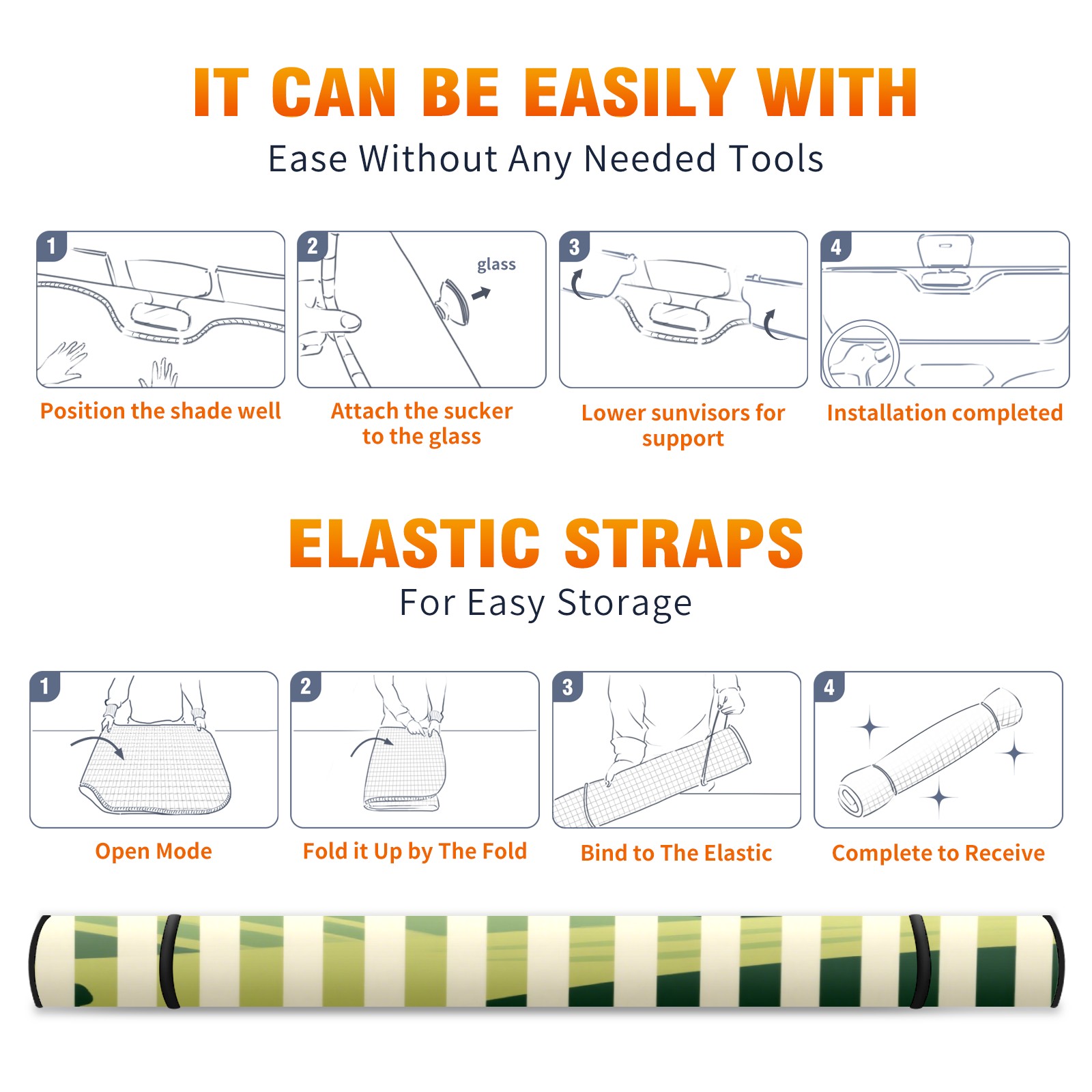 <p><b>Foldable Premium Car Windshield Sunshade is your great solution to reduce your car’s interior temperature dramatically! This is definitely a must-have item for your summer travel!</b></p><p><b>【Precision Fit, Stylish Protection】</b></p><p>55"x30" (140x76cm) universal size with 3cm flexible margins fits curved windshields of most sedans/SUVs.</p><p><b>【Blocking Uv Rays &amp; Heat Insulation】</b></p><p>Our vehicle sunshade provides effective UV, sun, and summer heat protection, preventing leather fading and plastic cracking to keep your car interior pristine.</p><p><b>【Zero-Mark Installation &amp; Space-Saving】</b></p><p>Equipped with dual scratch-free silicone suction cups + adjustable straps: Medical-grade silicone cups hold firmly yet remove cleanly. Folds to A3 size (42x30cm x &lt;2cm thick), tucks discreetly into glove compartments or door pockets.&nbsp;</p>