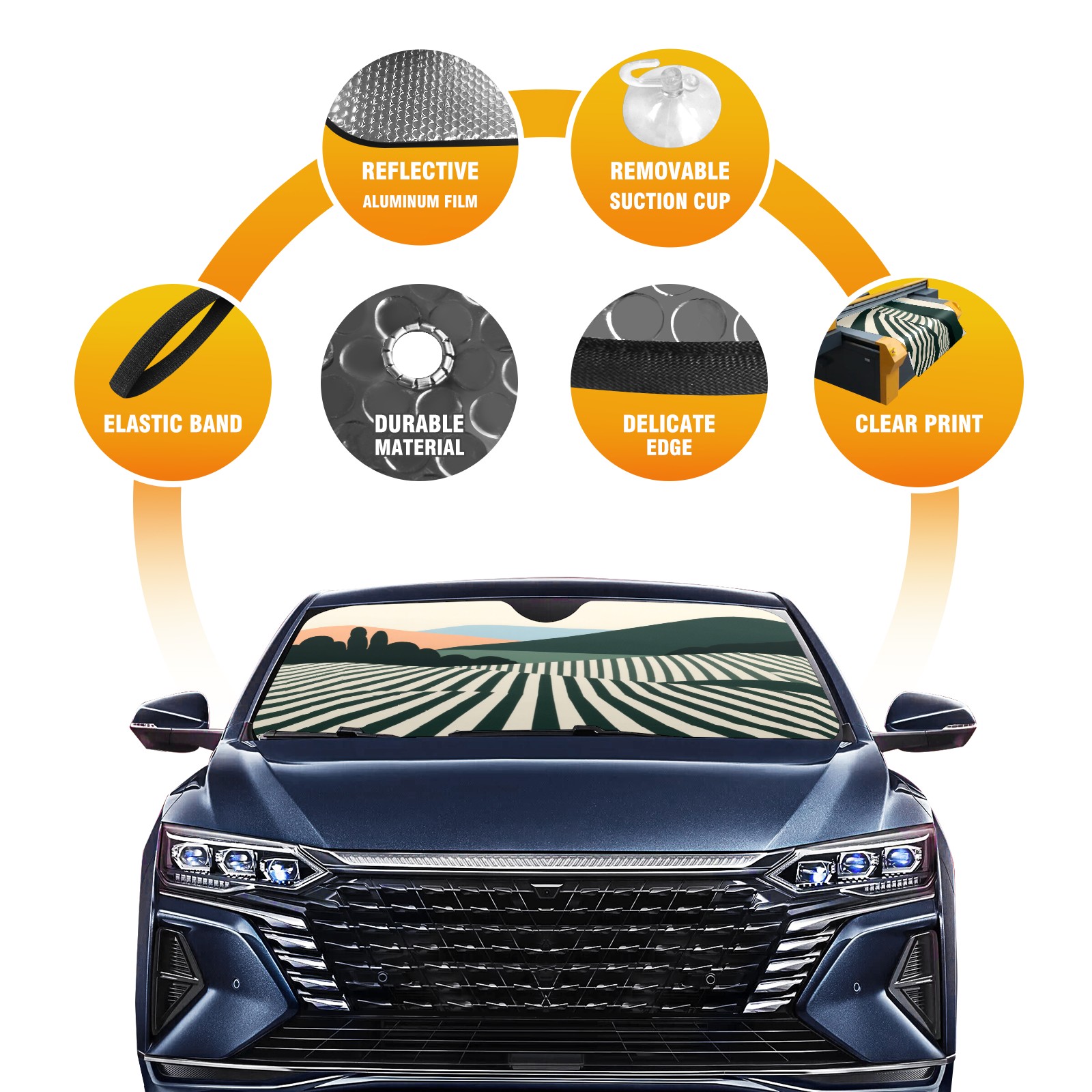 • <p><b>Foldable Premium Car Windshield Sunshade is your great solution to reduce your car’s interior temperature dramatically! This is definitely a must-have item for your summer travel!</b></p><p><b>【Precision Fit, Stylish Protection】</b></p><p>55"x30" (140x76cm) universal size with 3cm flexible margins fits curved windshields of most sedans/SUVs.</p><p><b>【Blocking Uv Rays &amp; Heat Insulation】</b></p><p>Our vehicle sunshade provides effective UV, sun, and summer heat protection, preventing leather fading and plastic cracking to keep your car interior pristine.</p><p><b>【Zero-Mark Installation &amp; Space-Saving】</b></p><p>Equipped with dual scratch-free silicone suction cups + adjustable straps: Medical-grade silicone cups hold firmly yet remove cleanly. Folds to A3 size (42x30cm x &lt;2cm thick), tucks discreetly into glove compartments or door pockets.&nbsp;</p>