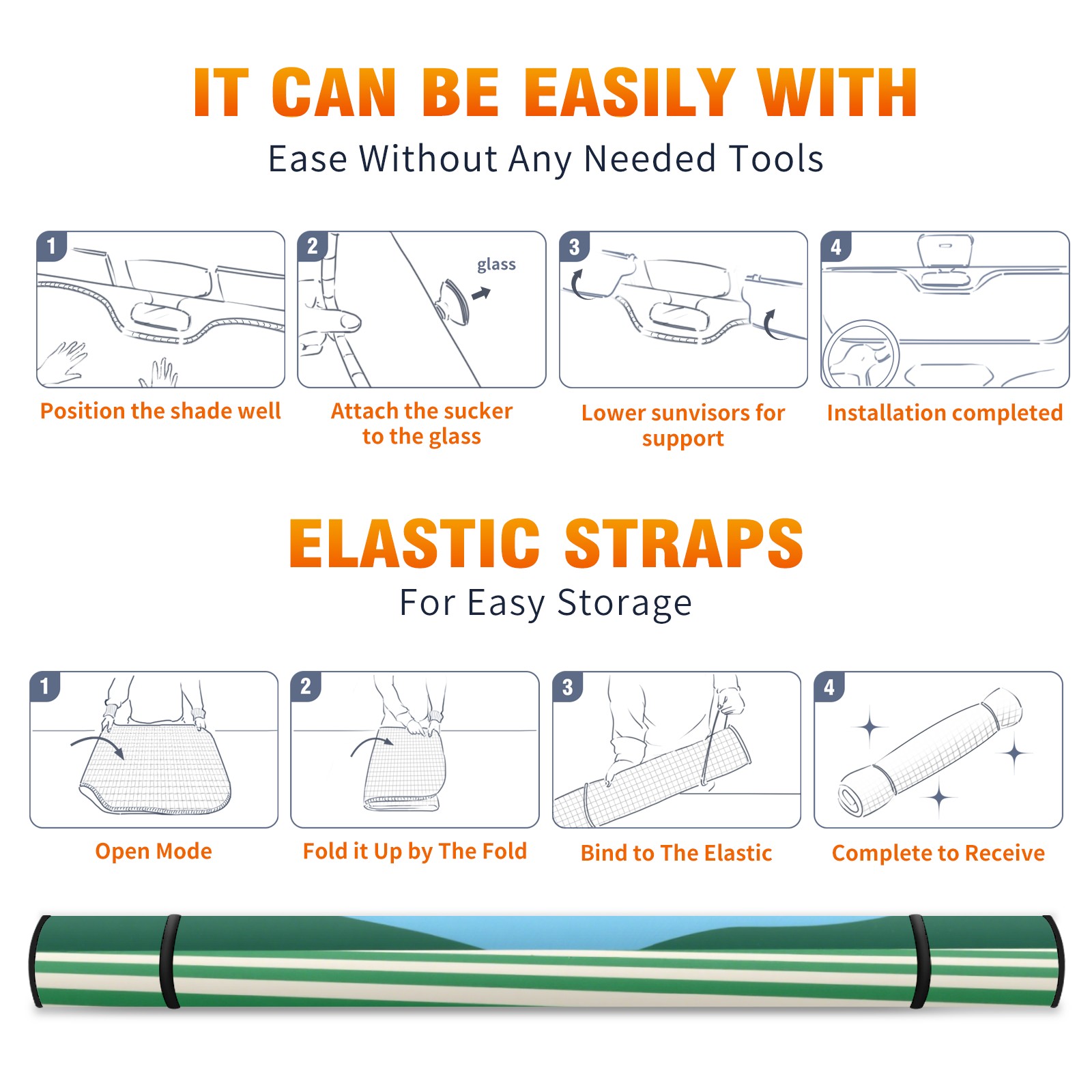 <p><b>Foldable Premium Car Windshield Sunshade is your great solution to reduce your car’s interior temperature dramatically! This is definitely a must-have item for your summer travel!</b></p><p><b>【Precision Fit, Stylish Protection】</b></p><p>55"x30" (140x76cm) universal size with 3cm flexible margins fits curved windshields of most sedans/SUVs.</p><p><b>【Blocking Uv Rays &amp; Heat Insulation】</b></p><p>Our vehicle sunshade provides effective UV, sun, and summer heat protection, preventing leather fading and plastic cracking to keep your car interior pristine.</p><p><b>【Zero-Mark Installation &amp; Space-Saving】</b></p><p>Equipped with dual scratch-free silicone suction cups + adjustable straps: Medical-grade silicone cups hold firmly yet remove cleanly. Folds to A3 size (42x30cm x &lt;2cm thick), tucks discreetly into glove compartments or door pockets.&nbsp;</p>