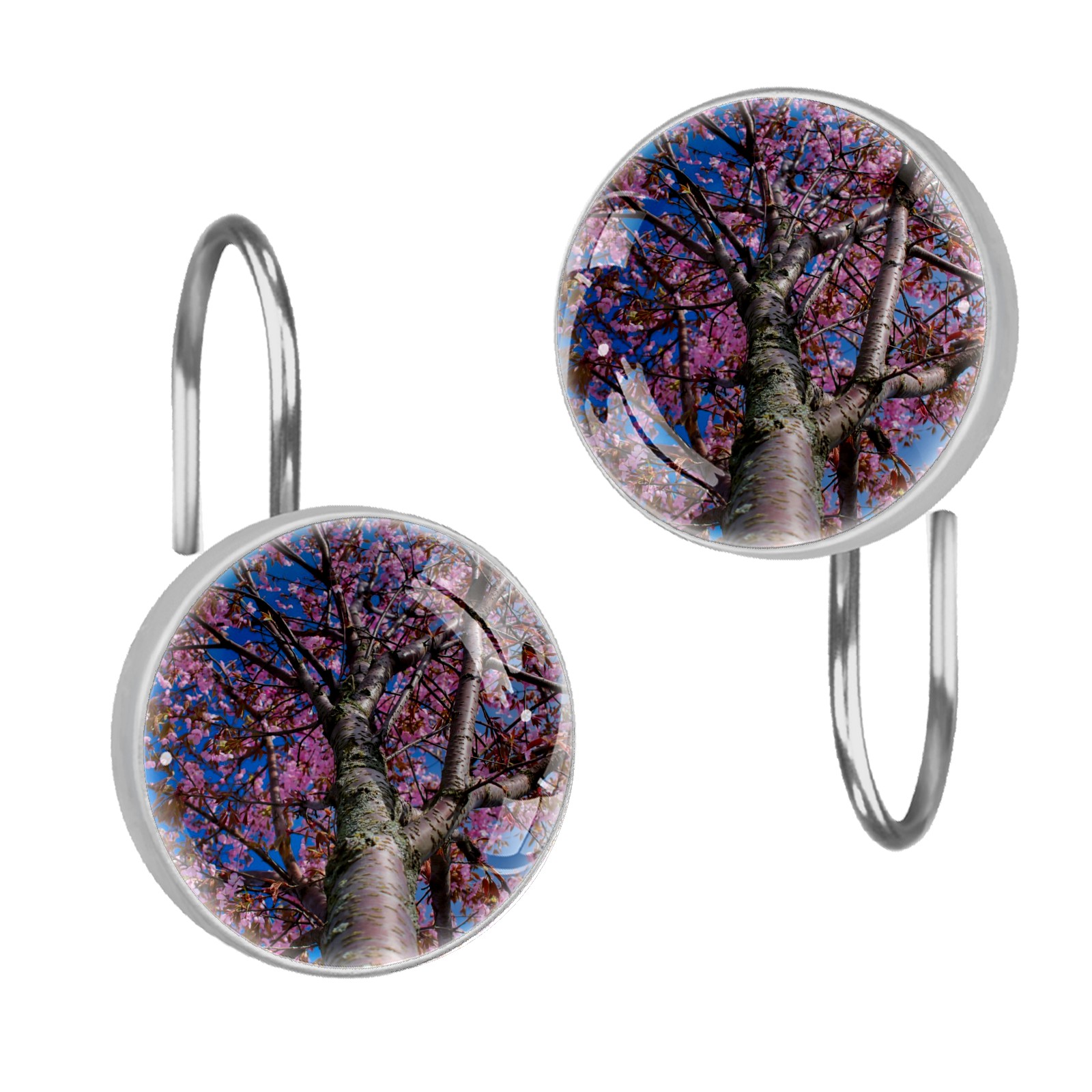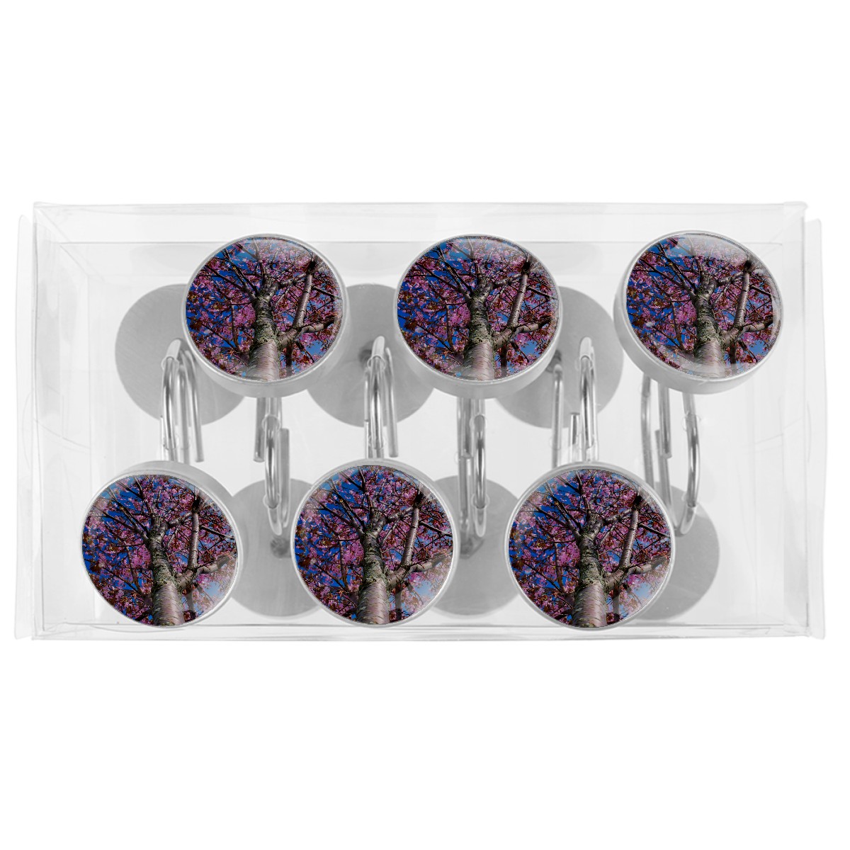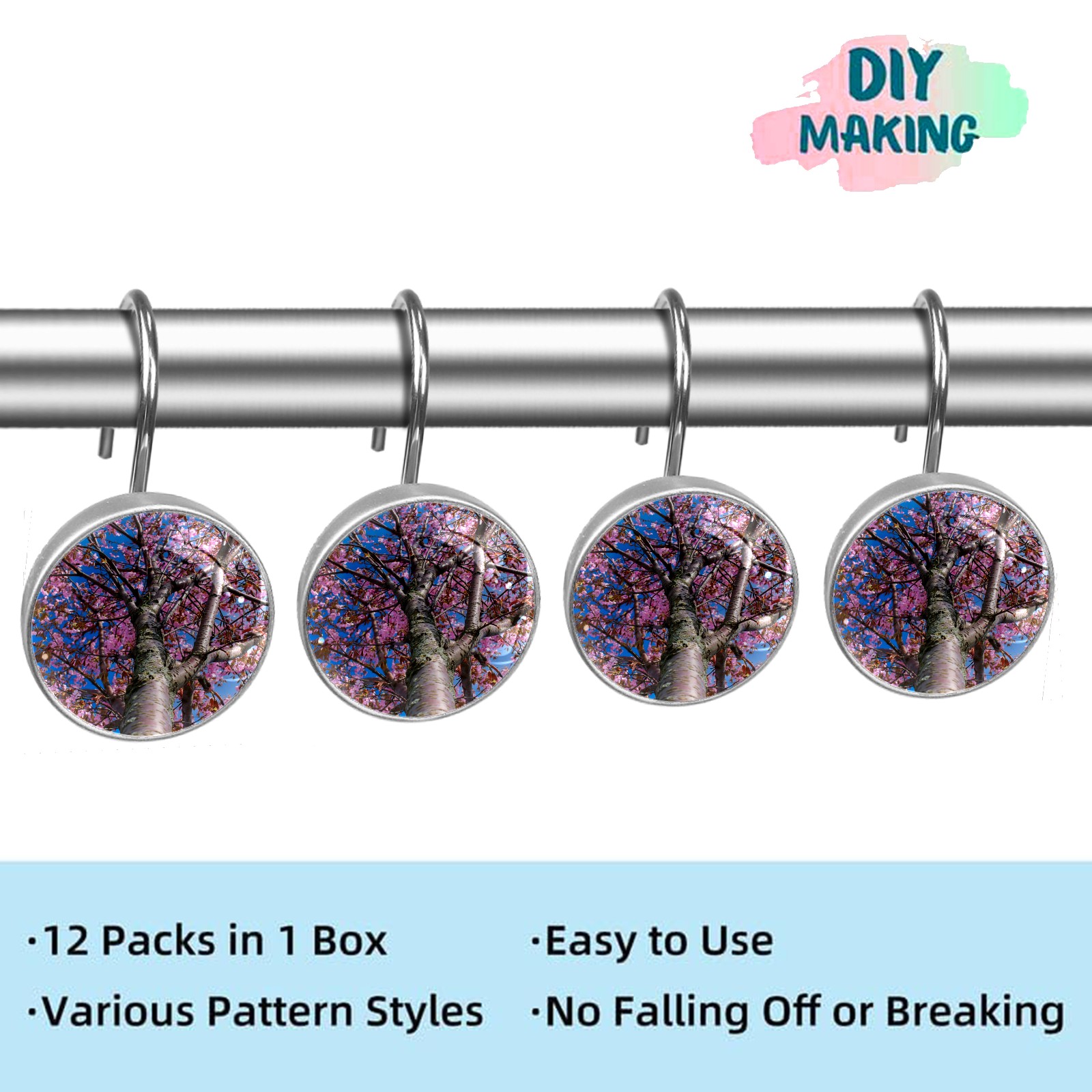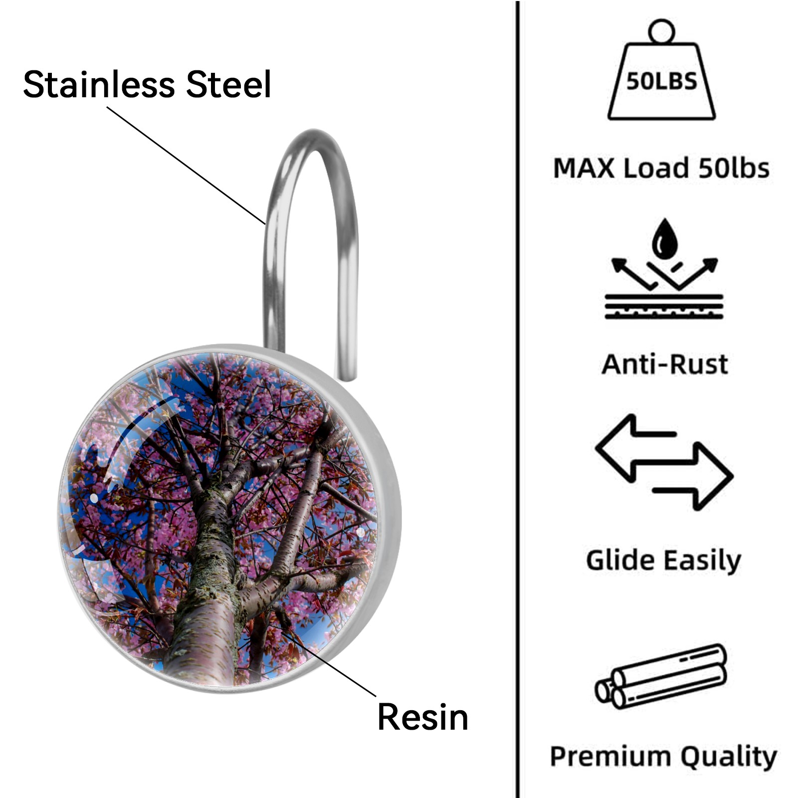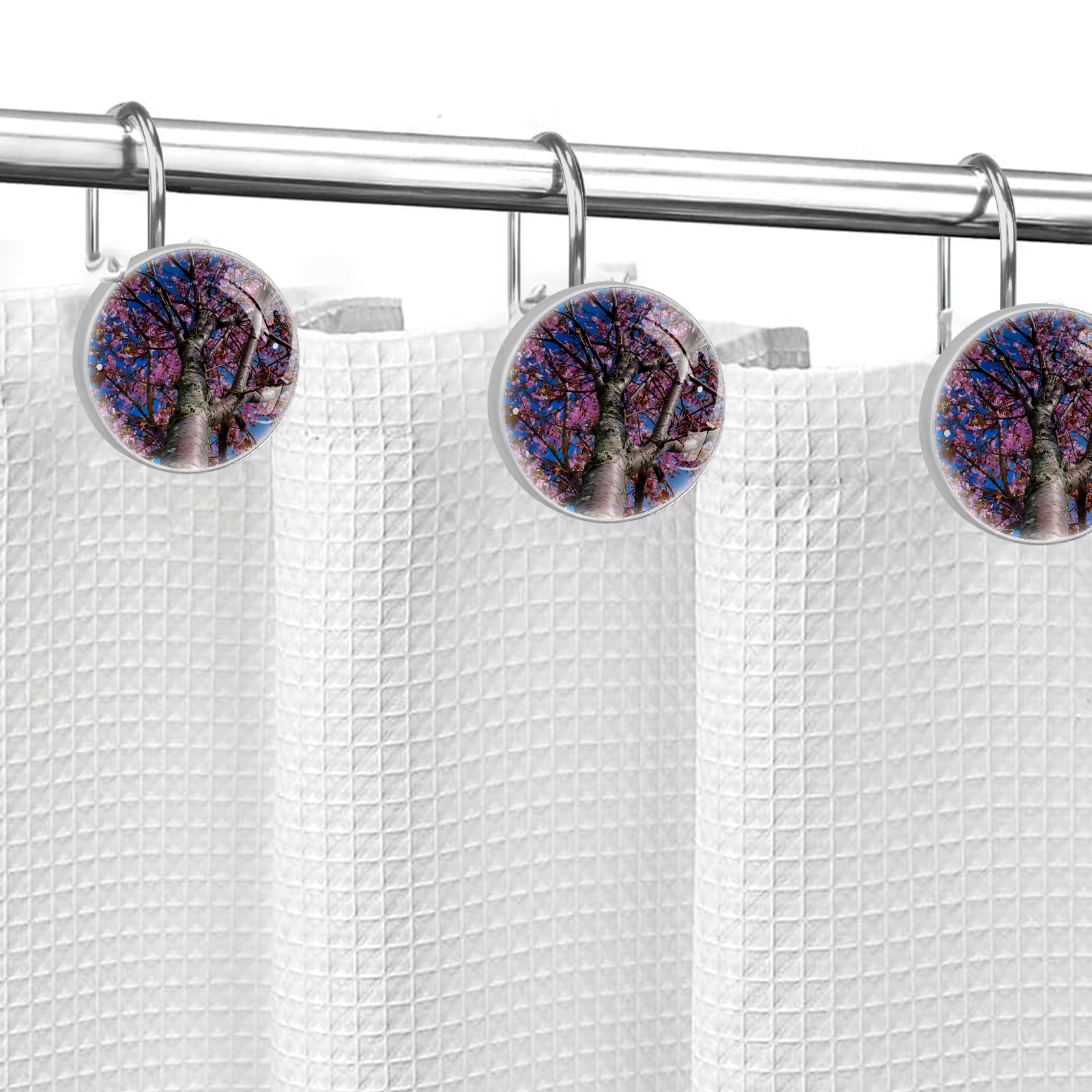 Decorative Cherry Blossom Tree Pink Floral Blue Sky Shower Curtain Hooks 12pcs Crystal Glass Rustproof Shower Hooks for Bathroom Home Decor Stainless Steel Resin Shower Curtain Rings