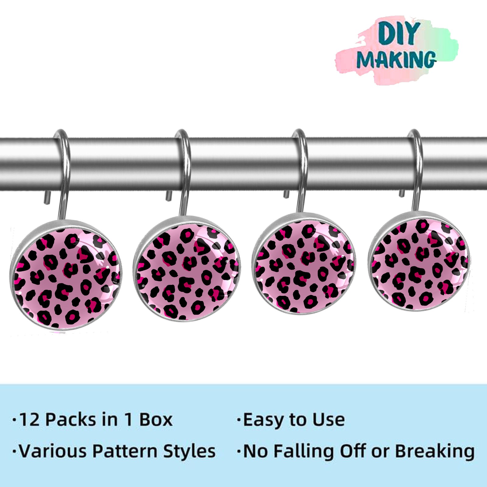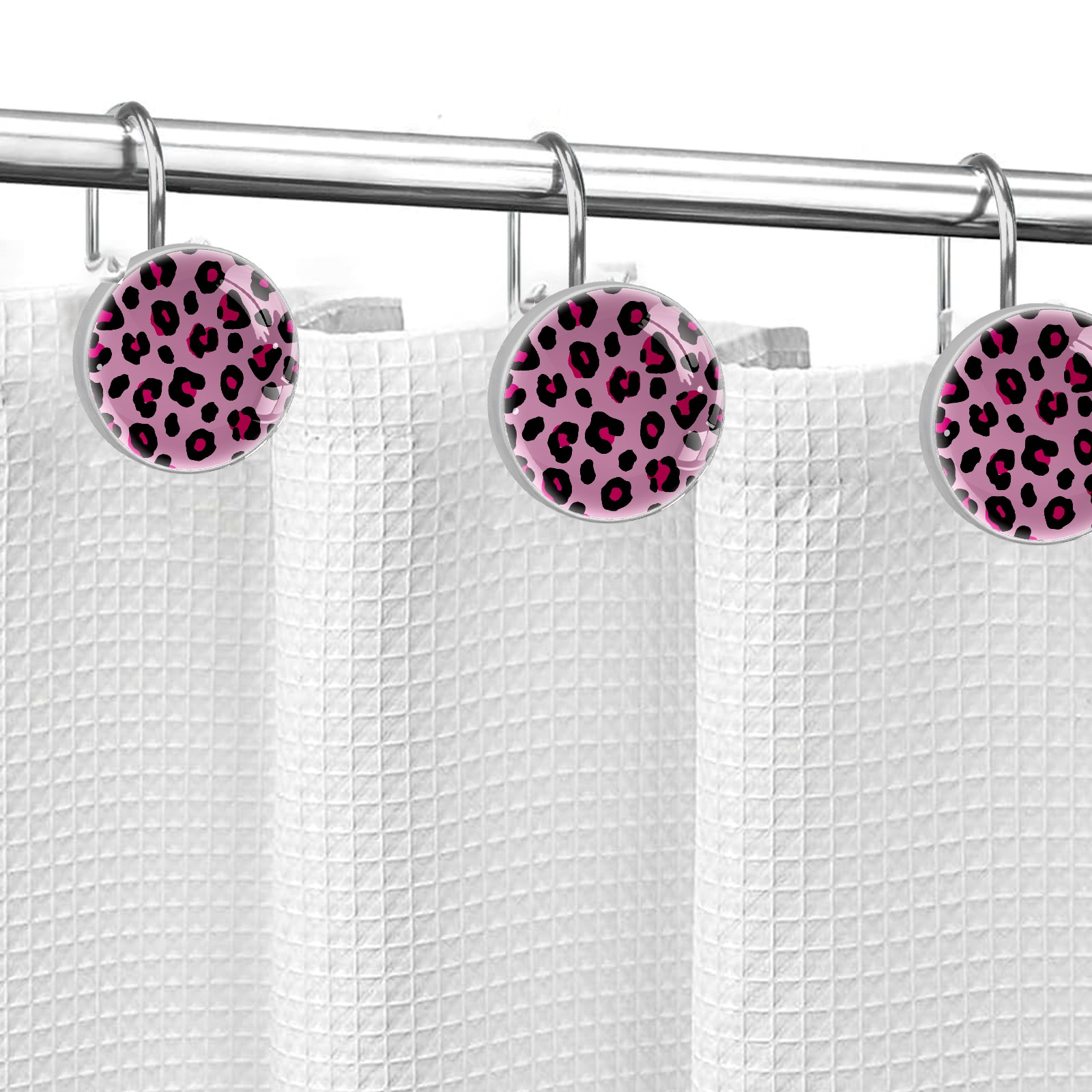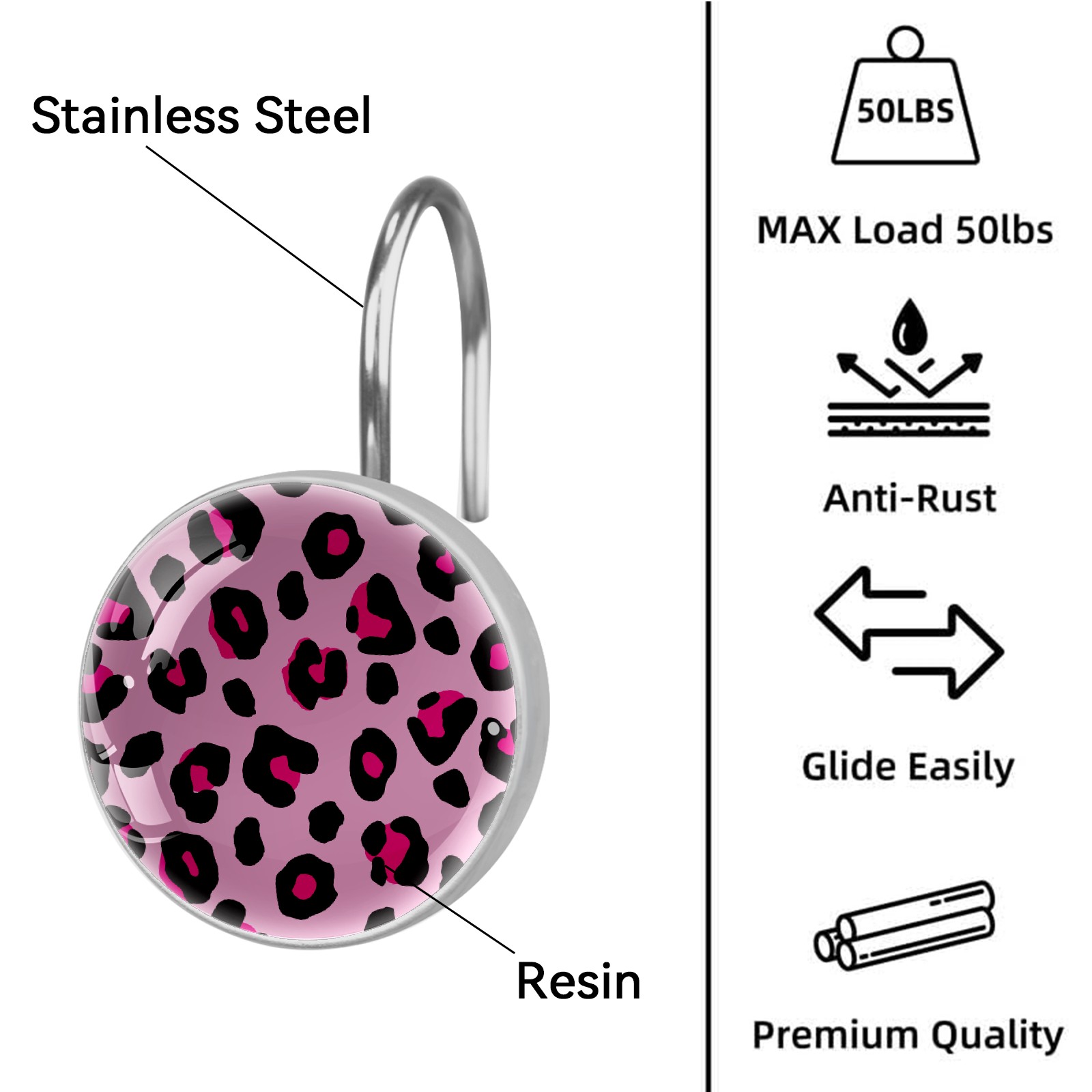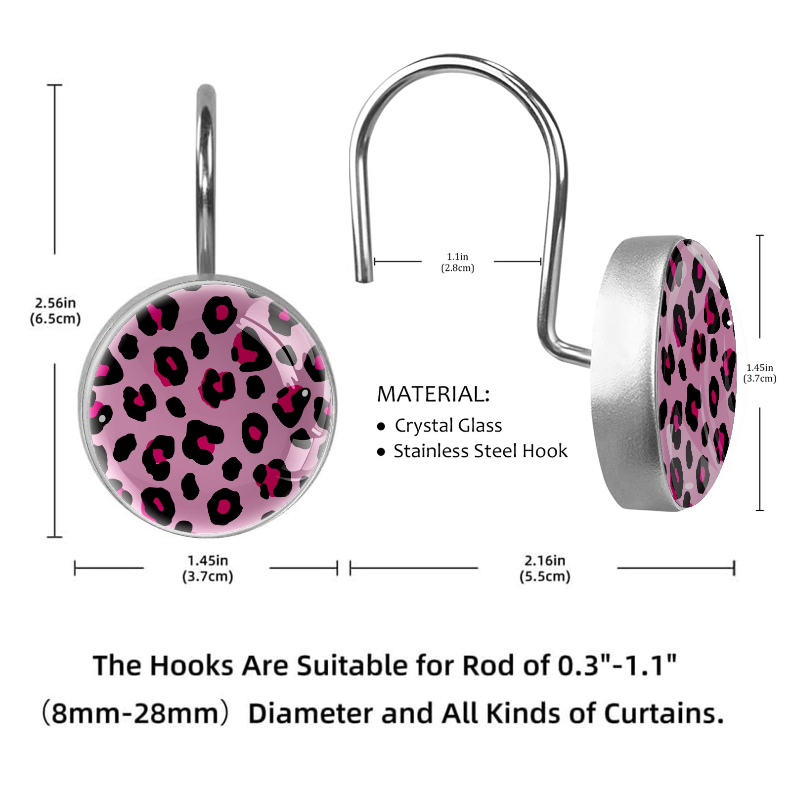 Decorative Pink Leopard Skin Texture Shower Curtain Hooks 12pcs Crystal Glass Rustproof Shower Hooks for Bathroom Home Decor Stainless Steel Resin Shower Curtain Rings