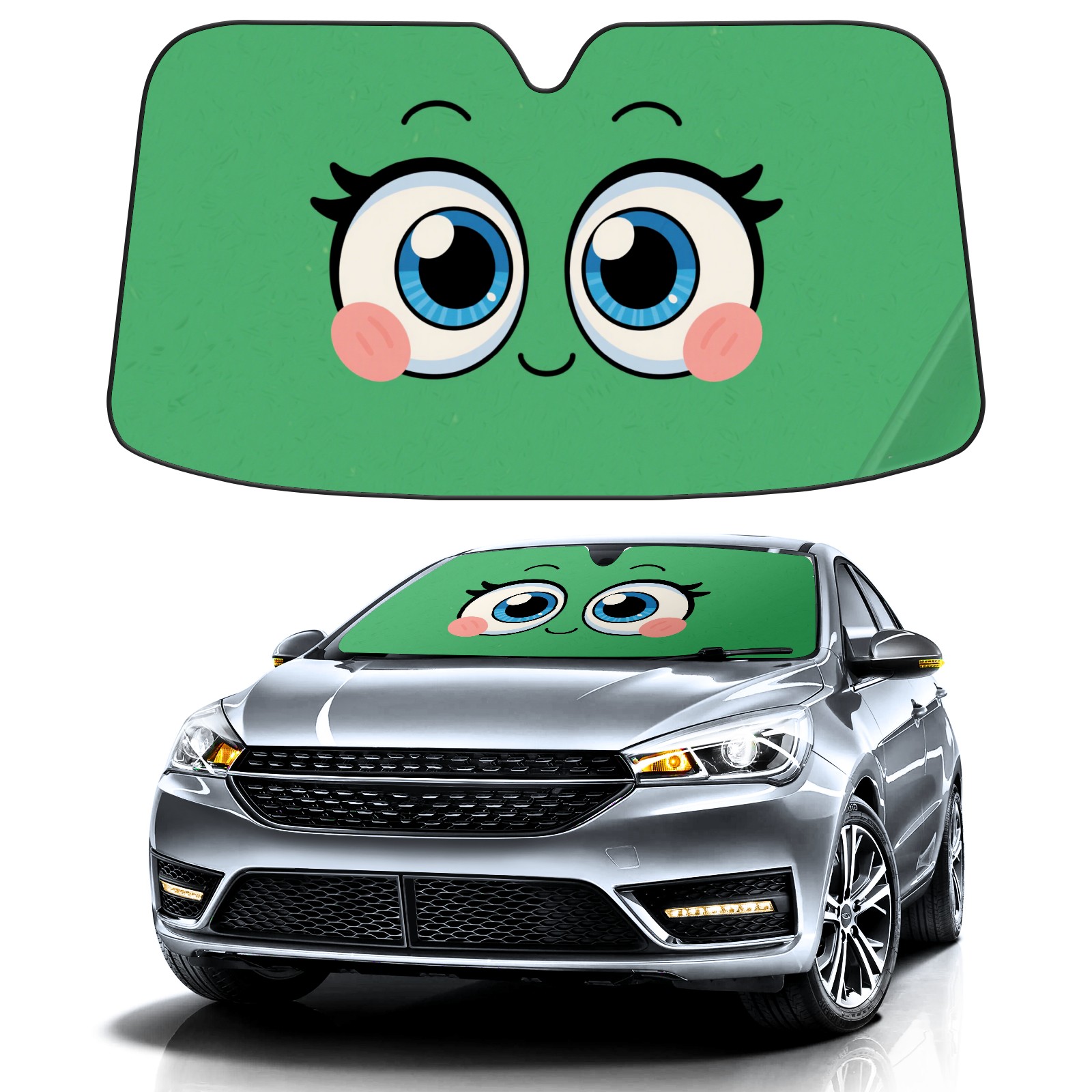Green Smiling Face Car Sun Shade UV Protection Foldable Sunshade for Windshield Heat Insulation Portable Sun Shield for Car Interior Protection Automotive Window Protector