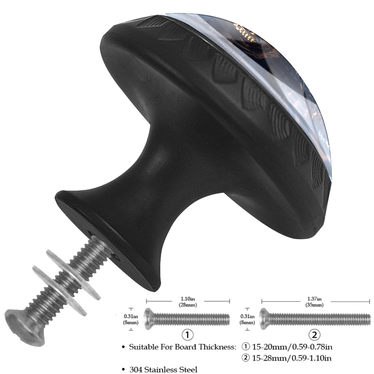 <p><b>Package Includes:</b></p> <p>Drawer Knobs x 4</p> <p>1.10 Inches Mounting Screws x 4</p> <p>1.37 Inches Mounting Screws x 4</p> <p><br></p> <p></p> <p>Crystal Glass Diameter: 1.37 inches (35mm)</p> <p>Knob Height: 1.10 inches (28mm)</p> <p>Base Diameter: 0.66 inches (17mm)</p> <p><b>Practical and Aesthetic:</b></p> <p>The knobs for kitchen cabinets and drawers combine the durability of an ABS base with the high transparency of glass, enhanced by unique patterns that add decoration and cuteness. It’s both practical and visually appealing.</p> <p><b>Pattern Design:</b></p> <p>Clear patterns add decoration and personalization. Cabinet knobs and pulls enhance visual appeal and can match different home styles, meeting diverse design needs.</p> <p><b>Easy Installation:</b></p> <p>Equipped with mounting screws, the ABS base can be securely attached to the drawer with ease.</p> <p><b>Easy Cleaning:</b></p> <p>The smooth surface of the round glass drawer knobs resists dust and stains, making it easy to clean with just a damp cloth.</p> <p><b>Wear-Resistant:</b></p> <p>The bathroom cabinet knobs are designed to resist scratches and fading, maintaining their good appearance over long-term use.</p>