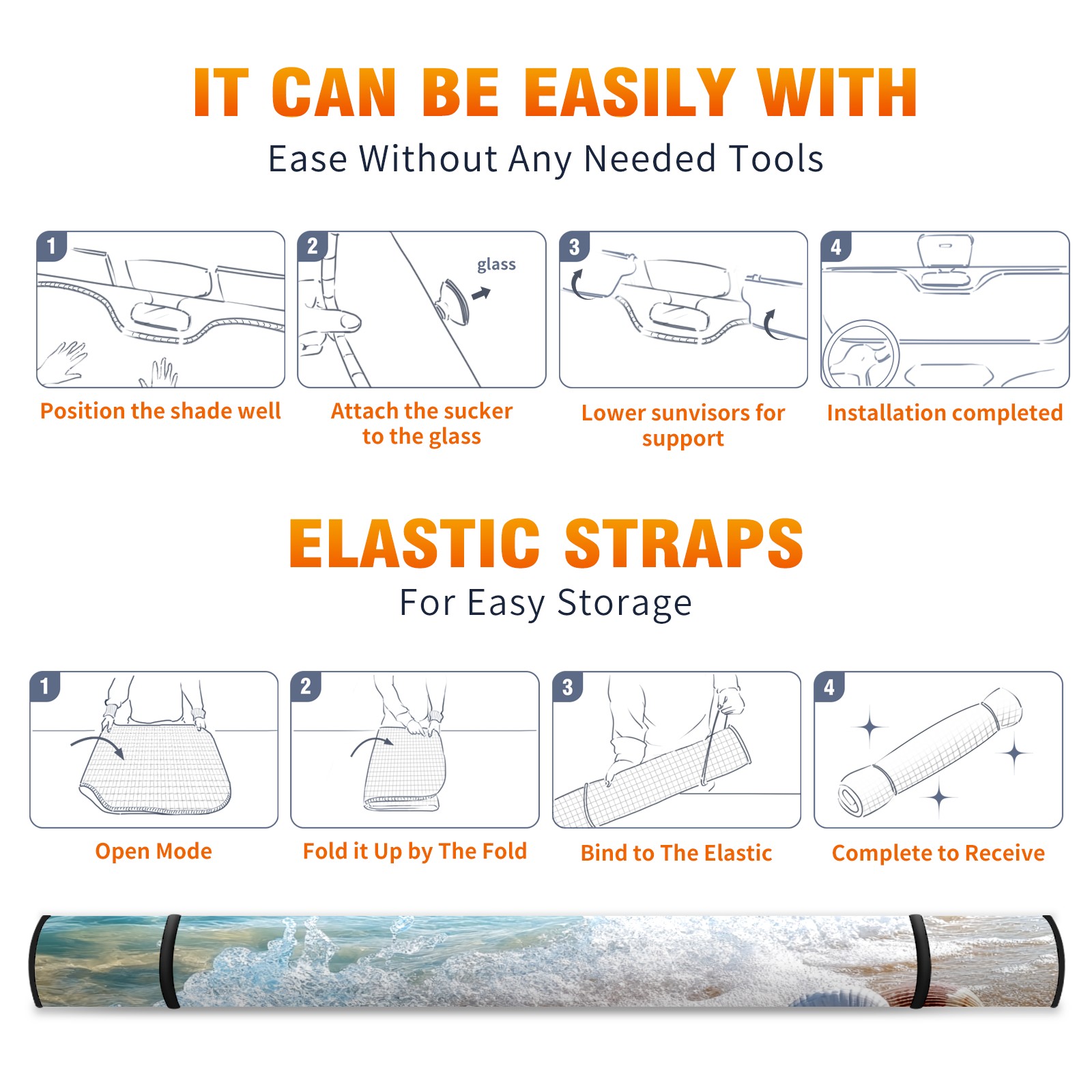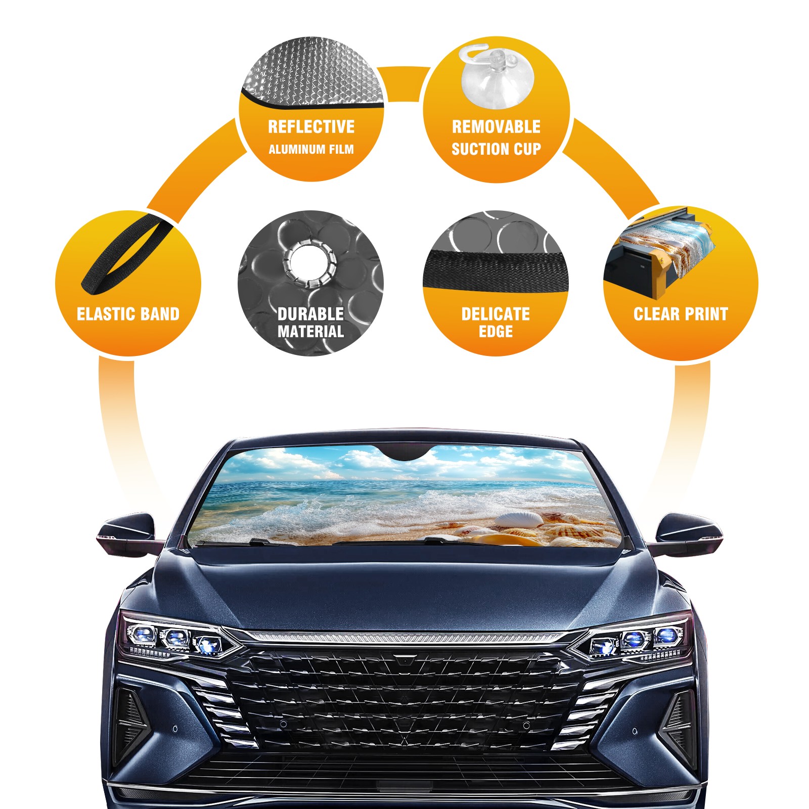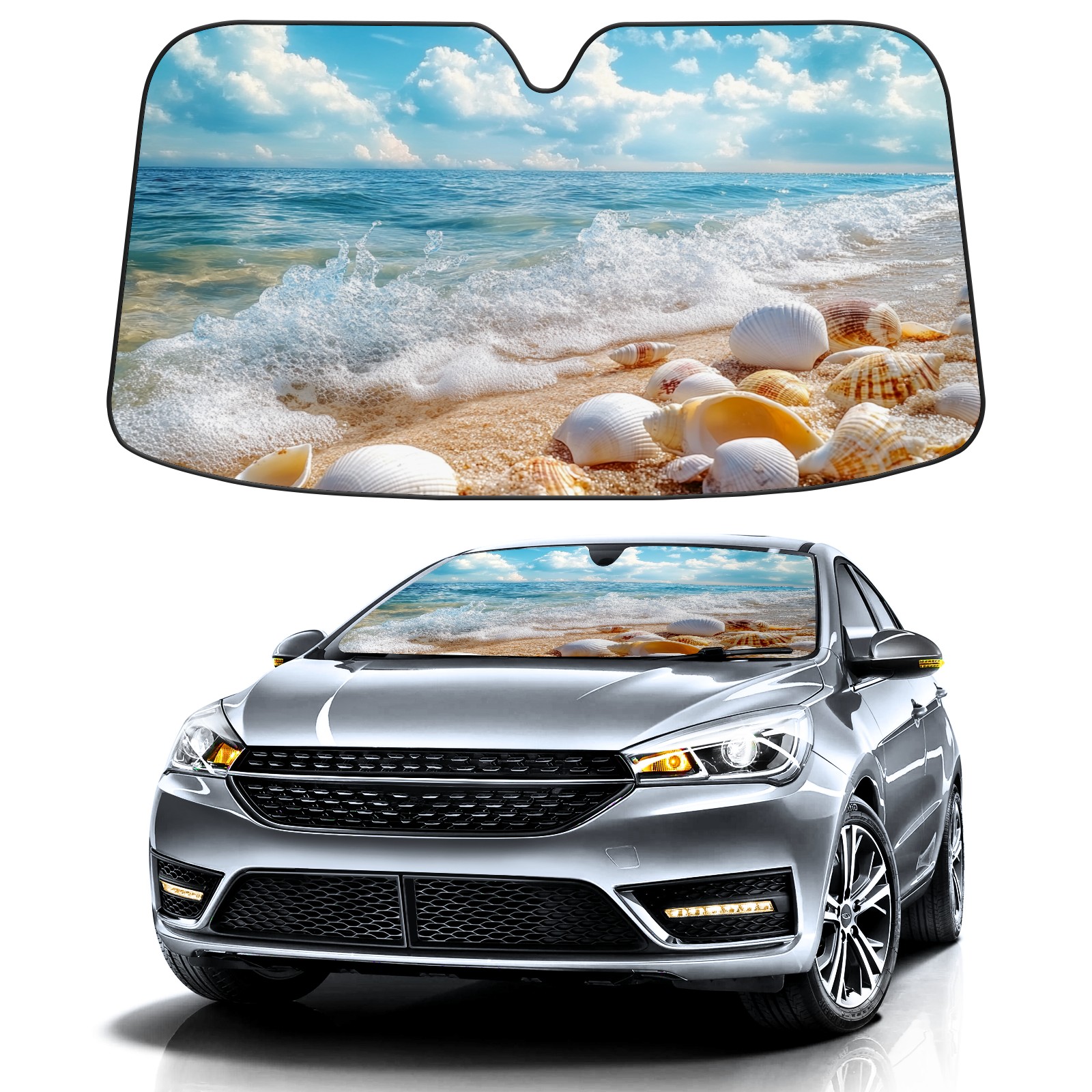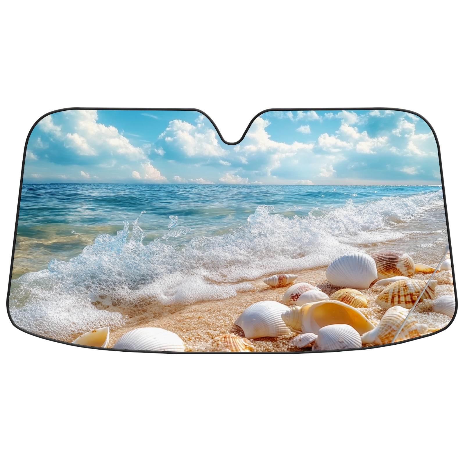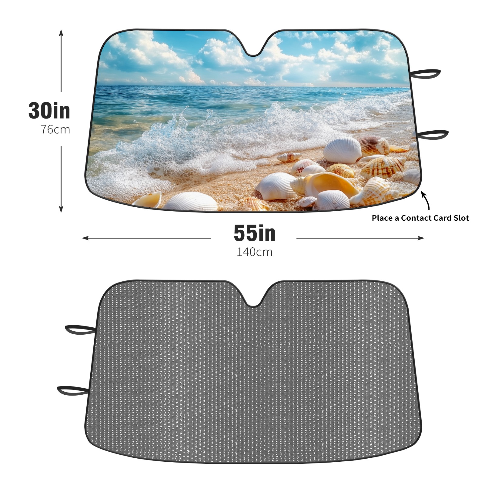 Car Windshield Sun Shade Foldable-Universal Fit Sunshade for Front Windows, UV Protection Heat Shield for Most Vehicles (55x30in)-Sun Visor Extender, Dashboard Cover(Beach With White Shells)