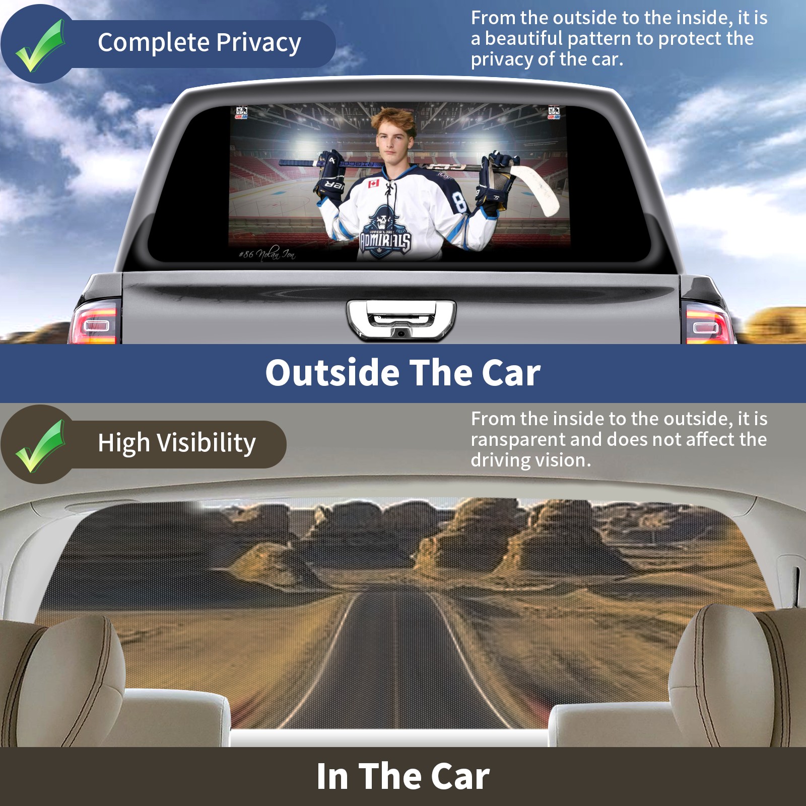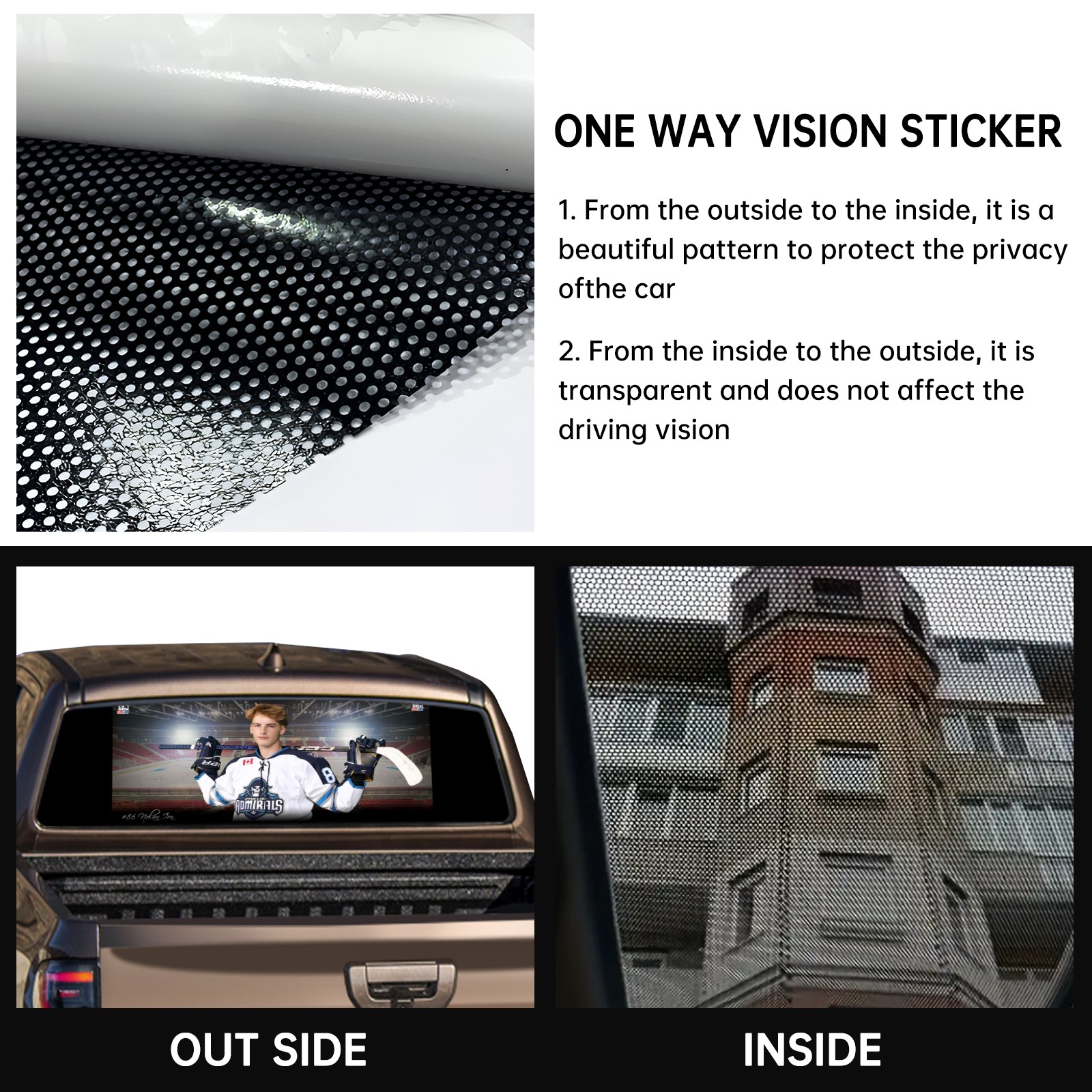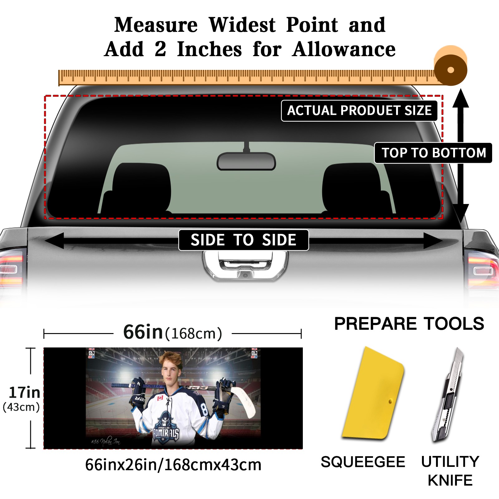 <p><strong>Truck Rear Window Graphics Decals Pickup Trucks Back Window Film Stickers 66" x 22" Perforated Vinyl Wrap Stickers Decorations for Car Rear Window</strong></p><p><strong><br /></strong></p><p><strong>Features :</strong></p><p>- Size of the rear window decals for trucks is 66x22 Inches (168x56cm).</p><p>- High quality perforated vinyl window film, one way vision sticker.</p><p>- Perforated is see through from the inside but not from outside.</p><p>- Clear printing, waterproof and durable.</p><p>- The car back window graphics stickers fits most truck and makes your vehicle more beautiful.&nbsp;</p><p><br /></p><p><strong>【Installation Instructions】</strong></p><p><strong>1. CLEAN SURFACE -</strong> Clean the rear window thoroughly and make sure the surface clean.</p><p><strong>2. STICK THE DECALS -</strong> Tear off the paper on the back and stick the decal on the window.</p><p><strong>3. SCRAPE OFF AIR BUBBLES -</strong> Use a squeegee or other card to scrape off the excess air bubbles.</p><p><strong>4. TRIM THE EXCESS -</strong> Use a knife to cut off the excess stickers of the window, finally complete.</p><p><br /></p><p>1. Please measure the size before purchasing, back window graphics decal for truck can be cut to your desired size.</p><p>2.The graphics stickers for truck back window is a great gift for yourself also can as a birthday / halloween / christmas gift for your friends and family.</p>