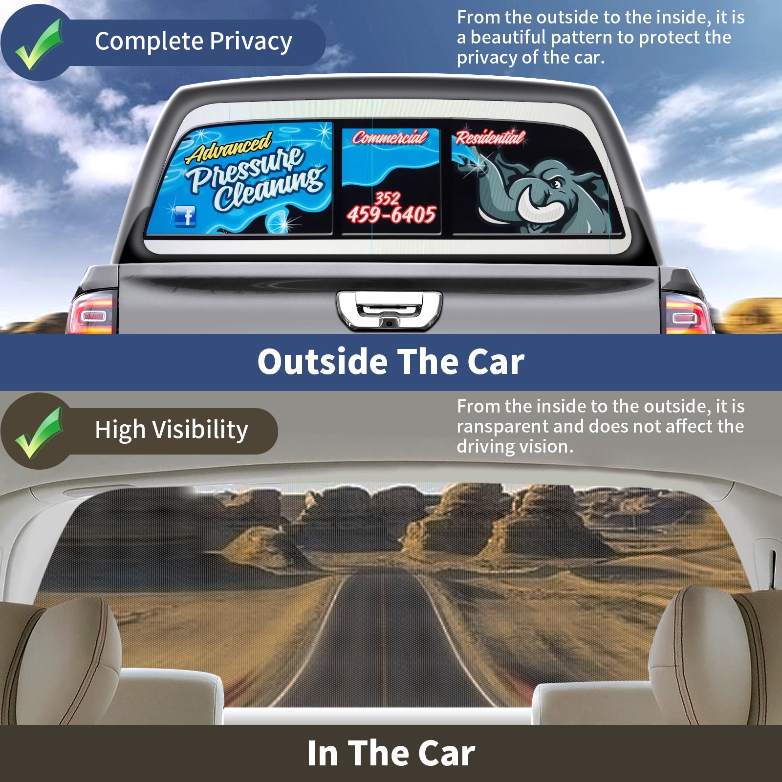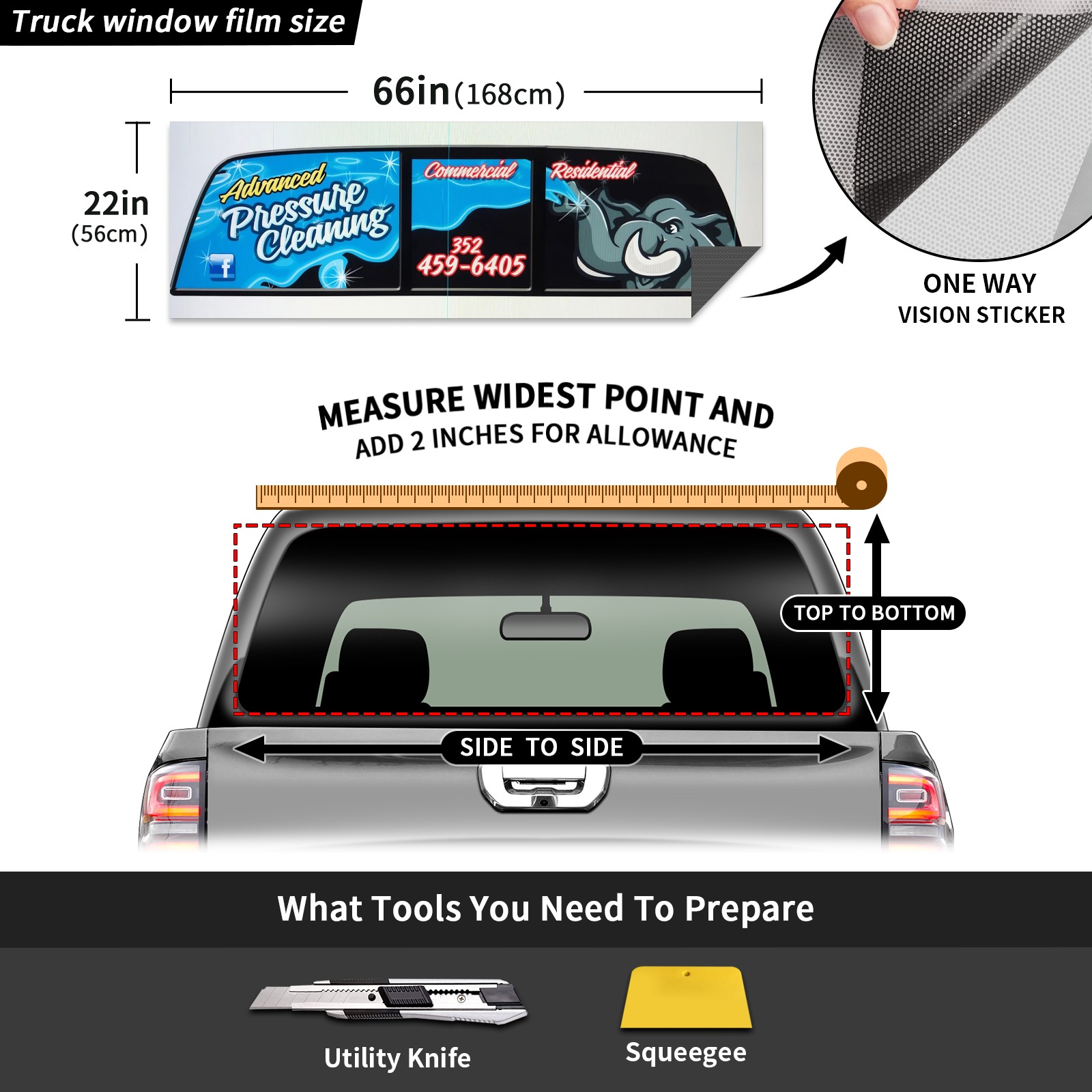 <p><strong>Truck Rear Window Graphics Decals Pickup Trucks Back Window Film Stickers 66" x 22" Perforated Vinyl Wrap Stickers Decorations for Car Rear Window</strong></p><p><strong><br /></strong></p><p><strong>Features :</strong></p><p>- Size of the rear window decals for trucks is 66x22 Inches (168x56cm).</p><p>- High quality perforated vinyl window film, one way vision sticker.</p><p>- Perforated is see through from the inside but not from outside.</p><p>- Clear printing, waterproof and durable.</p><p>- The car back window graphics stickers fits most truck and makes your vehicle more beautiful.&nbsp;</p><p><br /></p><p><strong>【Installation Instructions】</strong></p><p><strong>1. CLEAN SURFACE -</strong> Clean the rear window thoroughly and make sure the surface clean.</p><p><strong>2. STICK THE DECALS -</strong> Tear off the paper on the back and stick the decal on the window.</p><p><strong>3. SCRAPE OFF AIR BUBBLES -</strong> Use a squeegee or other card to scrape off the excess air bubbles.</p><p><strong>4. TRIM THE EXCESS -</strong> Use a knife to cut off the excess stickers of the window, finally complete.</p><p><br /></p><p>1. Please measure the size before purchasing, back window graphics decal for truck can be cut to your desired size.</p><p>2.The graphics stickers for truck back window is a great gift for yourself also can as a birthday / halloween / christmas gift for your friends and family.</p>