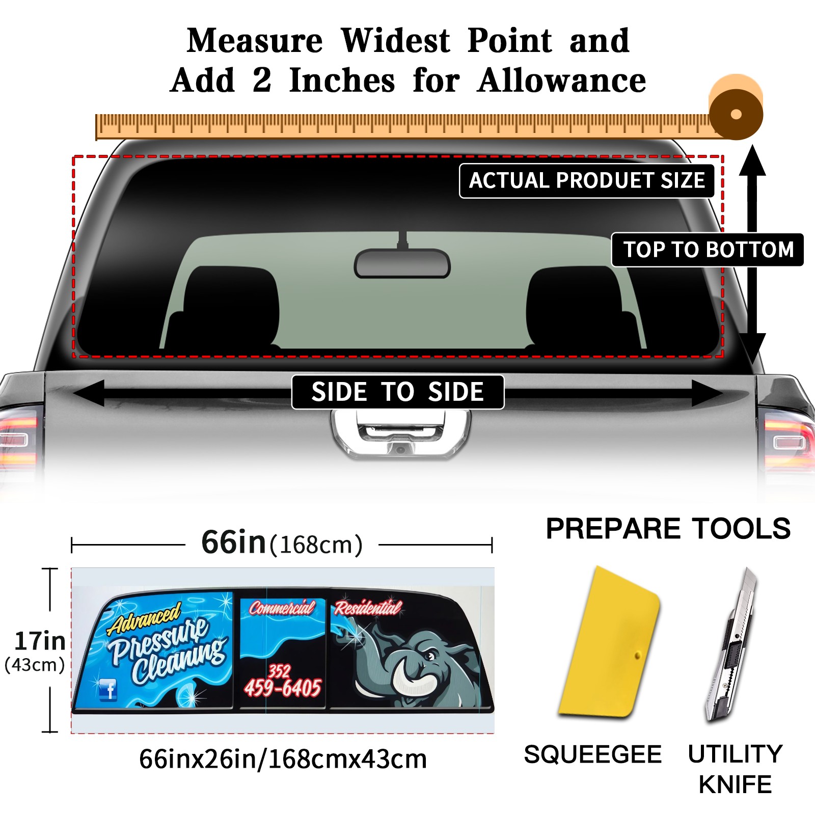 <p><strong>Truck Rear Window Graphics Decals Pickup Trucks Back Window Film Stickers 66" x 22" Perforated Vinyl Wrap Stickers Decorations for Car Rear Window</strong></p><p><strong><br /></strong></p><p><strong>Features :</strong></p><p>- Size of the rear window decals for trucks is 66x22 Inches (168x56cm).</p><p>- High quality perforated vinyl window film, one way vision sticker.</p><p>- Perforated is see through from the inside but not from outside.</p><p>- Clear printing, waterproof and durable.</p><p>- The car back window graphics stickers fits most truck and makes your vehicle more beautiful.&nbsp;</p><p><br /></p><p><strong>【Installation Instructions】</strong></p><p><strong>1. CLEAN SURFACE -</strong> Clean the rear window thoroughly and make sure the surface clean.</p><p><strong>2. STICK THE DECALS -</strong> Tear off the paper on the back and stick the decal on the window.</p><p><strong>3. SCRAPE OFF AIR BUBBLES -</strong> Use a squeegee or other card to scrape off the excess air bubbles.</p><p><strong>4. TRIM THE EXCESS -</strong> Use a knife to cut off the excess stickers of the window, finally complete.</p><p><br /></p><p>1. Please measure the size before purchasing, back window graphics decal for truck can be cut to your desired size.</p><p>2.The graphics stickers for truck back window is a great gift for yourself also can as a birthday / halloween / christmas gift for your friends and family.</p>