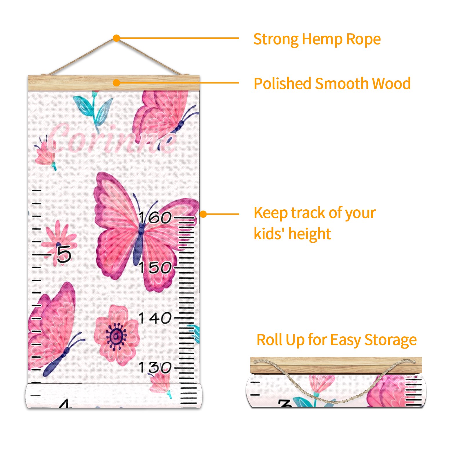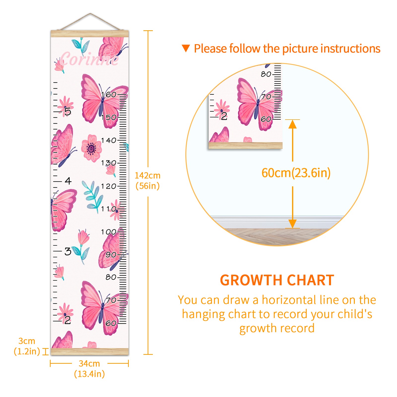 <p><b>Features:</b></p> <p>Rope for Hanging</p> <p>Material: Linen + Wood</p> <p>Dimensions: 13.4x56 inches</p> <p>Package Included: 1 * Baby Growth Chart</p> <p><b>Baby height growth chart can be used anywhere</b></p> <p>Ideal for kids nursery decoration, kids bedroom, interior walls or windows, playroom, living room, homedecoration.Add name and make the growth chart special!</p> <p><b>Easy to fold and carry</b></p> <p>With rope at the top of the growth chart, it is easy to install and remove.You can fold it and unfold any time any where.</p> <p><b>Perfect Gift Idea for Kids</b></p> <p>Environmental and non-toxic for kids use, it must be a perfect gift for baby, kids, girls, and boys.This is a best choice for your friend who have kids or baby as a popular gift.</p> <p><b>Easy to read</b></p> <p>Measurement accrate with 2 scales, Centimeters and feet. The letters are big enough, very easy to read.</p> <p><b>60cm(23.6inch) Over Ground Design</b></p> <p>Not only can protect from dust and other damage, but also will not interfere in floor cleaning.</p>
