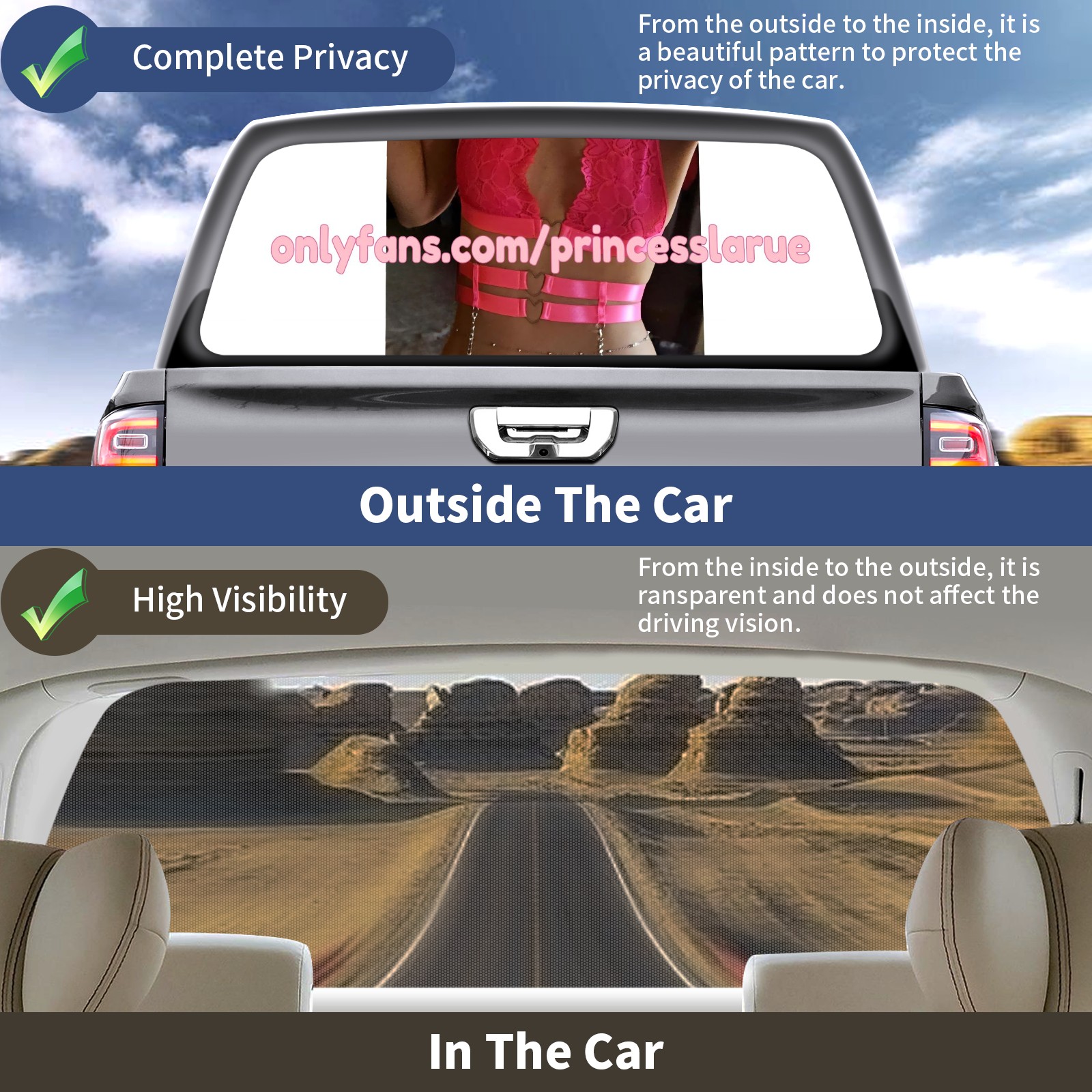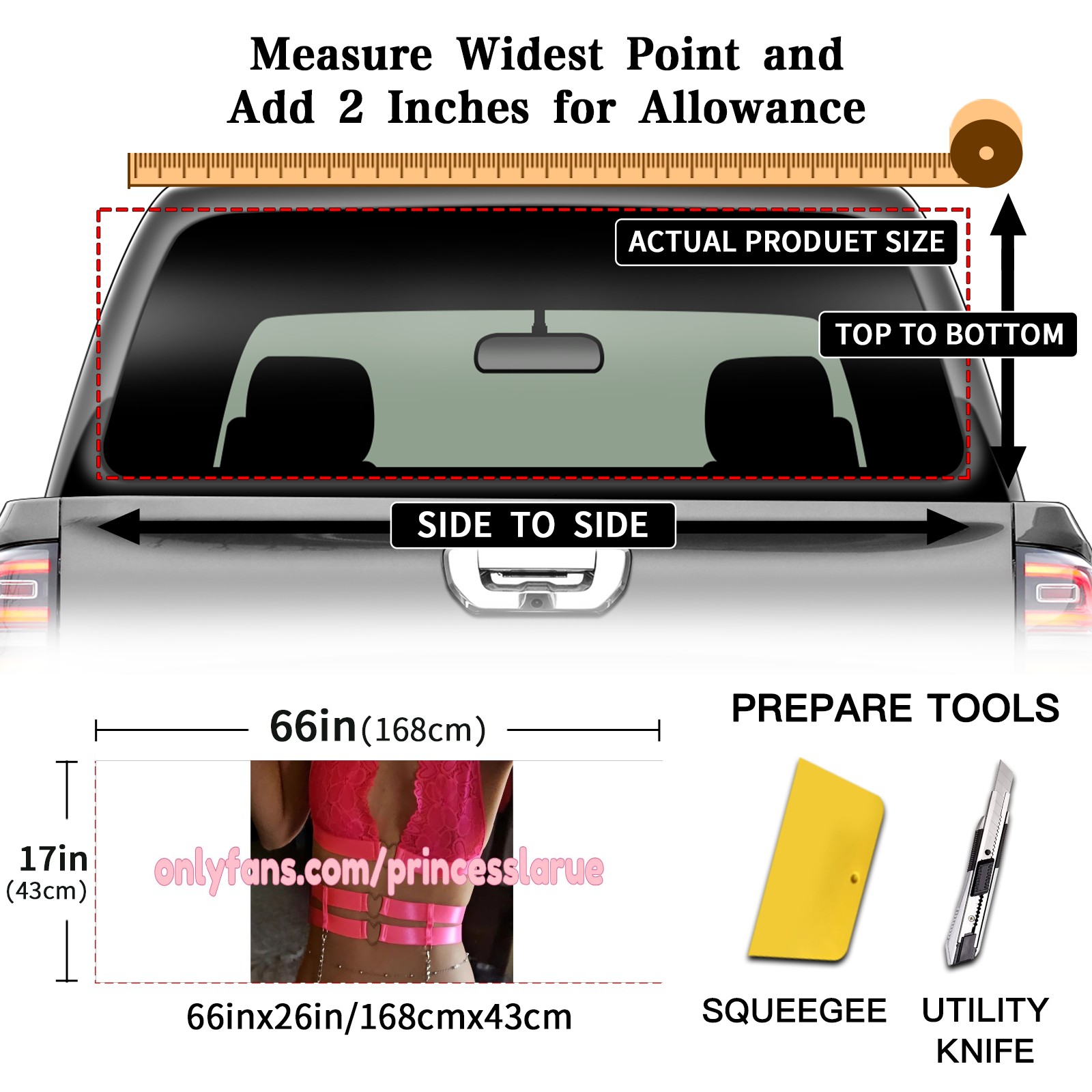 <p><strong>Truck Rear Window Graphics Decals Pickup Trucks Back Window Film Stickers 66" x 22" Perforated Vinyl Wrap Stickers Decorations for Car Rear Window</strong></p><p><strong><br /></strong></p><p><strong>Features :</strong></p><p>- Size of the rear window decals for trucks is 66x22 Inches (168x56cm).</p><p>- High quality perforated vinyl window film, one way vision sticker.</p><p>- Perforated is see through from the inside but not from outside.</p><p>- Clear printing, waterproof and durable.</p><p>- The car back window graphics stickers fits most truck and makes your vehicle more beautiful.&nbsp;</p><p><br /></p><p><strong>【Installation Instructions】</strong></p><p><strong>1. CLEAN SURFACE -</strong> Clean the rear window thoroughly and make sure the surface clean.</p><p><strong>2. STICK THE DECALS -</strong> Tear off the paper on the back and stick the decal on the window.</p><p><strong>3. SCRAPE OFF AIR BUBBLES -</strong> Use a squeegee or other card to scrape off the excess air bubbles.</p><p><strong>4. TRIM THE EXCESS -</strong> Use a knife to cut off the excess stickers of the window, finally complete.</p><p><br /></p><p>1. Please measure the size before purchasing, back window graphics decal for truck can be cut to your desired size.</p><p>2.The graphics stickers for truck back window is a great gift for yourself also can as a birthday / halloween / christmas gift for your friends and family.</p>