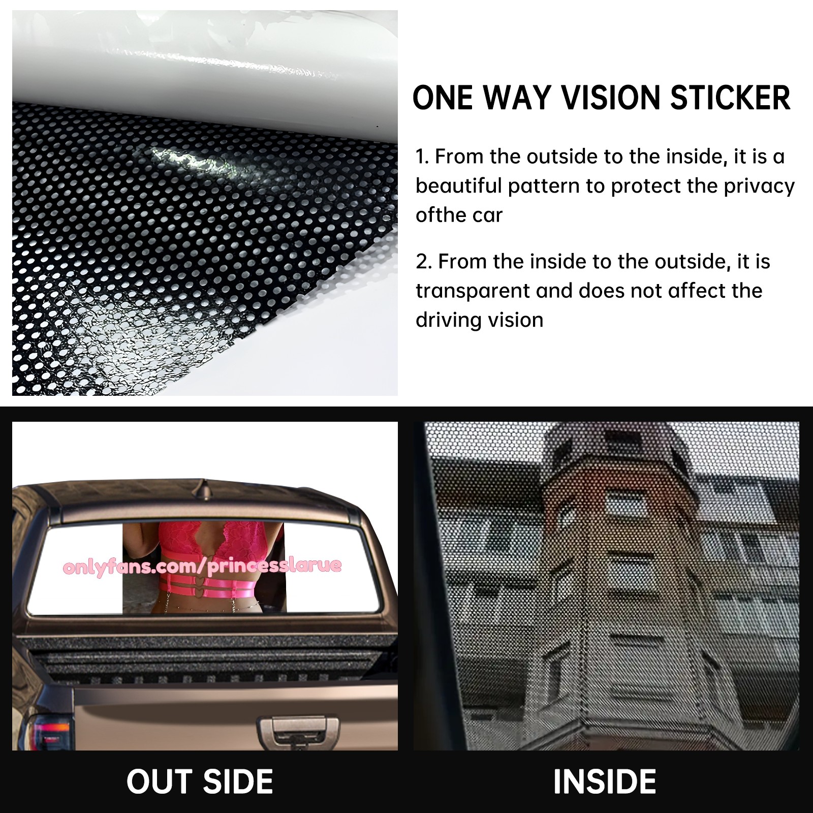 • <p><strong>Truck Rear Window Graphics Decals Pickup Trucks Back Window Film Stickers 66" x 22" Perforated Vinyl Wrap Stickers Decorations for Car Rear Window</strong></p><p><strong><br /></strong></p><p><strong>Features :</strong></p><p>- Size of the rear window decals for trucks is 66x22 Inches (168x56cm).</p><p>- High quality perforated vinyl window film, one way vision sticker.</p><p>- Perforated is see through from the inside but not from outside.</p><p>- Clear printing, waterproof and durable.</p><p>- The car back window graphics stickers fits most truck and makes your vehicle more beautiful.&nbsp;</p><p><br /></p><p><strong>【Installation Instructions】</strong></p><p><strong>1. CLEAN SURFACE -</strong> Clean the rear window thoroughly and make sure the surface clean.</p><p><strong>2. STICK THE DECALS -</strong> Tear off the paper on the back and stick the decal on the window.</p><p><strong>3. SCRAPE OFF AIR BUBBLES -</strong> Use a squeegee or other card to scrape off the excess air bubbles.</p><p><strong>4. TRIM THE EXCESS -</strong> Use a knife to cut off the excess stickers of the window, finally complete.</p><p><br /></p><p>1. Please measure the size before purchasing, back window graphics decal for truck can be cut to your desired size.</p><p>2.The graphics stickers for truck back window is a great gift for yourself also can as a birthday / halloween / christmas gift for your friends and family.</p>