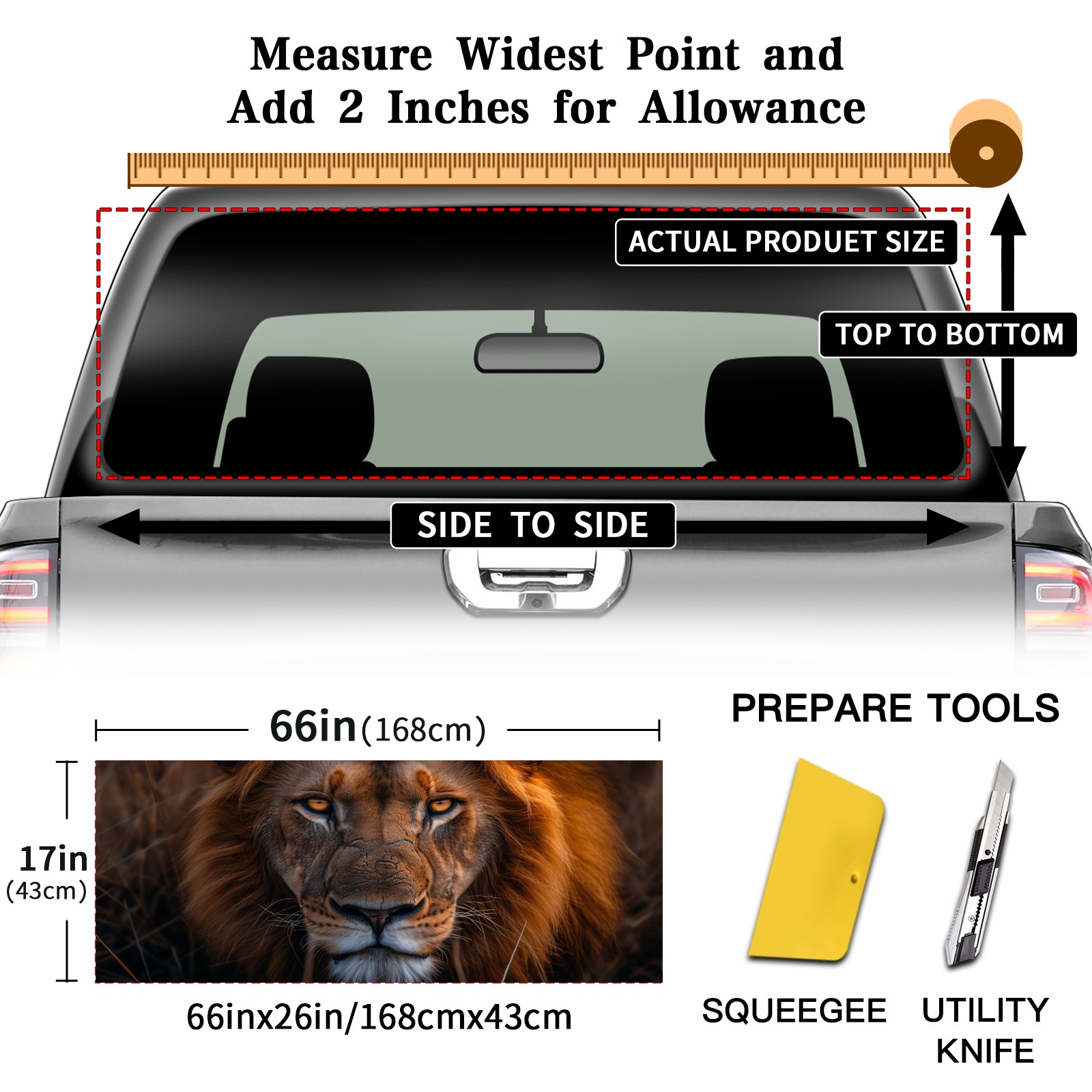 <p><strong>Truck Rear Window Graphics Decals Pickup Trucks Back Window Film Stickers 66" x 22" Perforated Vinyl Wrap Stickers Decorations for Car Rear Window</strong></p><p><strong><br /></strong></p><p><strong>Features :</strong></p><p>- Size of the rear window decals for trucks is 66x22 Inches (168x56cm).</p><p>- High quality perforated vinyl window film, one way vision sticker.</p><p>- Perforated is see through from the inside but not from outside.</p><p>- Clear printing, waterproof and durable.</p><p>- The car back window graphics stickers fits most truck and makes your vehicle more beautiful.&nbsp;</p><p><br /></p><p><strong>【Installation Instructions】</strong></p><p><strong>1. CLEAN SURFACE -</strong> Clean the rear window thoroughly and make sure the surface clean.</p><p><strong>2. STICK THE DECALS -</strong> Tear off the paper on the back and stick the decal on the window.</p><p><strong>3. SCRAPE OFF AIR BUBBLES -</strong> Use a squeegee or other card to scrape off the excess air bubbles.</p><p><strong>4. TRIM THE EXCESS -</strong> Use a knife to cut off the excess stickers of the window, finally complete.</p><p><br /></p><p>1. Please measure the size before purchasing, back window graphics decal for truck can be cut to your desired size.</p><p>2.The graphics stickers for truck back window is a great gift for yourself also can as a birthday / halloween / christmas gift for your friends and family.</p>