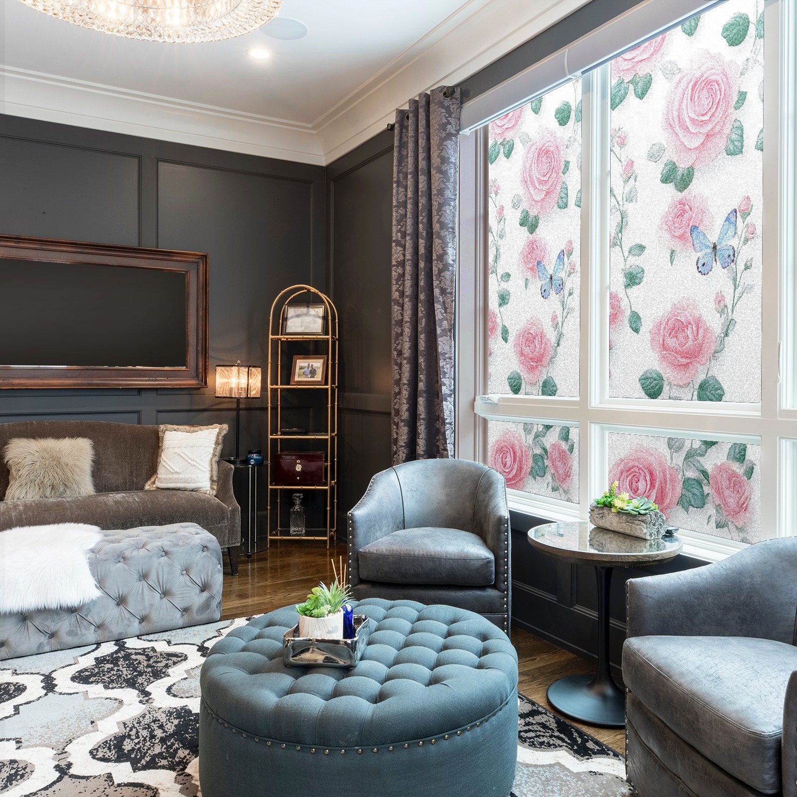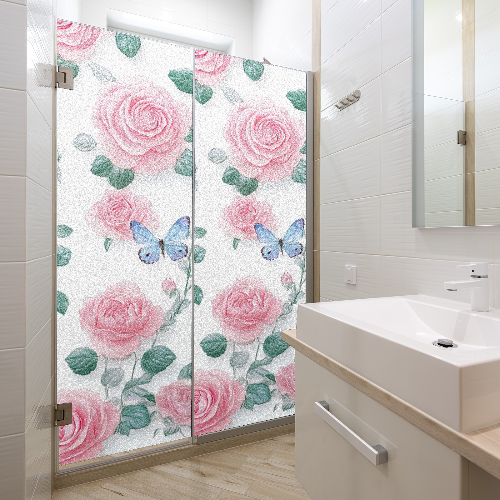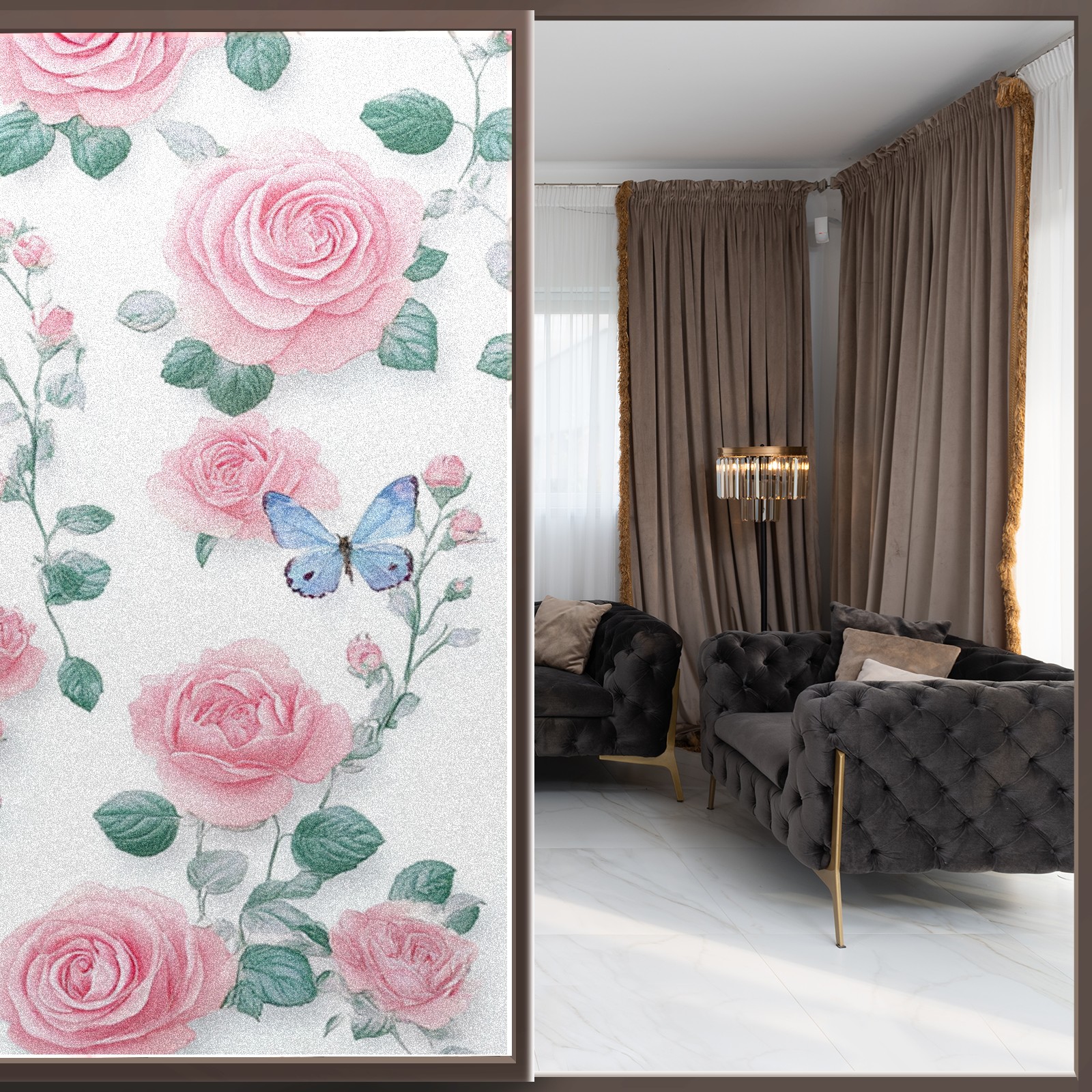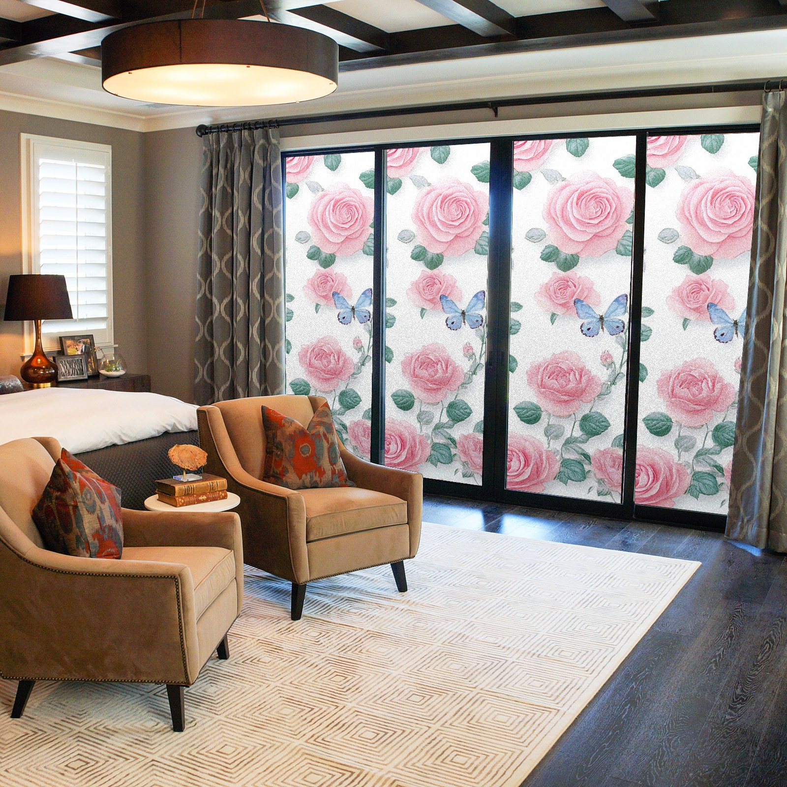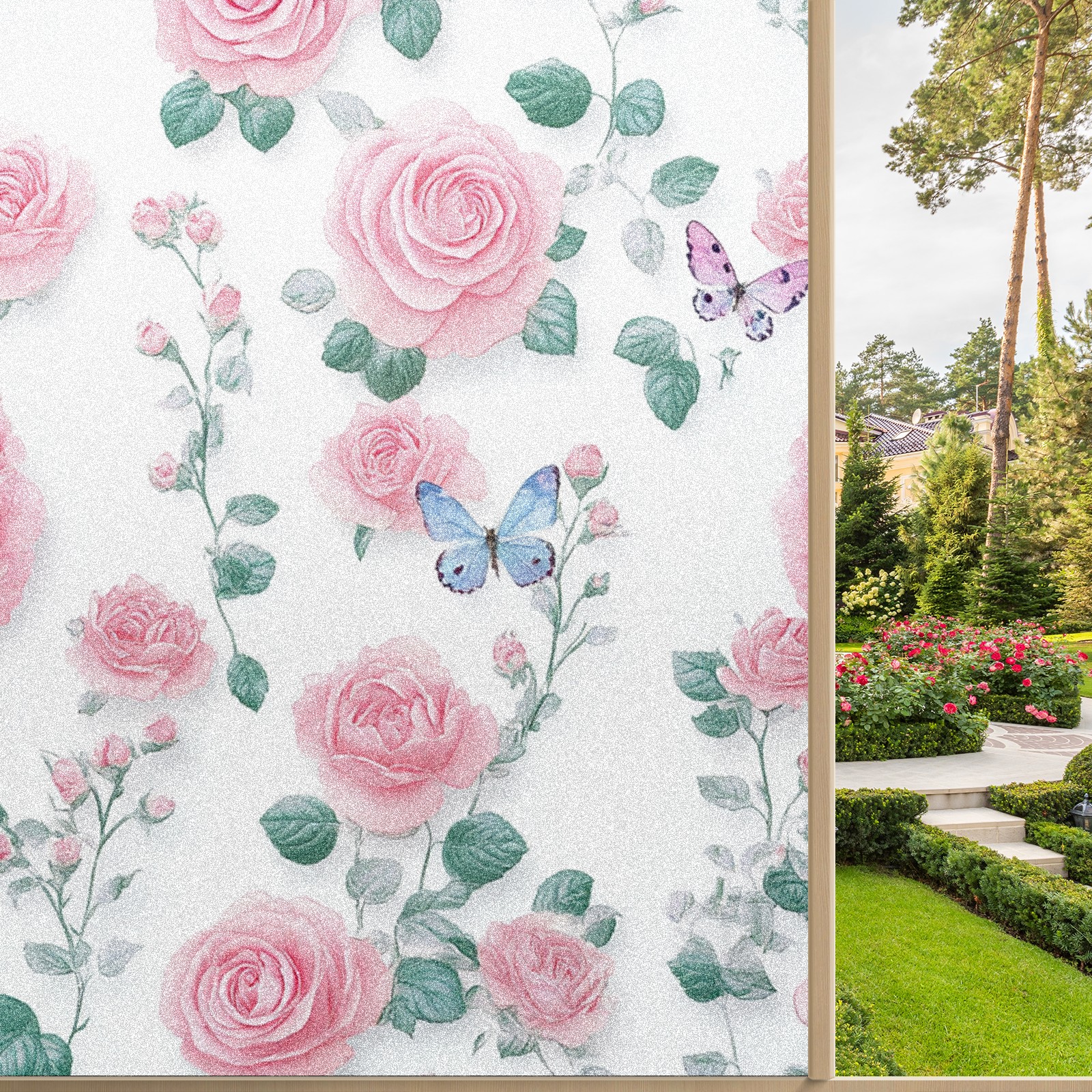 Stained Glass Window Film - Decorative Privacy Film for Windows, Peel and Stick Window Film for Bathroom/Office/Shower, Reusable and Easy to Cut 17.7"x23.6" (Pink Green Small Roses)