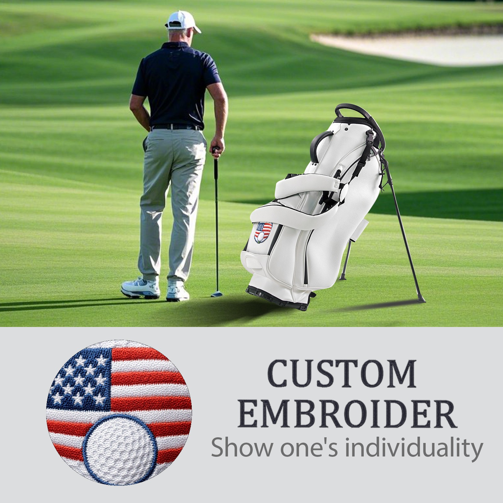<p>The Golf Stand Bag, designed specifically for golf enthusiasts, offers a choice of 5 - way and 14 - way top dividers. Its 5/14 - compartment design with independent full - size club compartments safeguards clubs from collisions. Equipped with a rain cover, waterproof zippered pockets (tested to resist moderate to heavy rain), and a high - performance cooler pouch that can keep drinks cold for hours, it ensures a convenient golfing experience. The bag features thickened, breathable neoprene shoulder straps and an adjustable chest buckle, reducing shoulder fatigue by 35% compared to regular bags, and its automatic aluminum alloy stand provides stable support on various terrains. Crafted from top - tier, water - resistant litchi - grain PU leather, with double - stitched edges, reliable zippers tested for over 15,000 cycles, and anti - abrasion bottom studs, it guarantees durability. You can personalize it with embroidery on the front pocket and rain cover side (15*15cm area), and it comes in classic black and white, with a matte finish and litchi - grain texture that combines business and leisure styles. Measuring 130 cm in height, 37 cm in width, and 31 cm in depth (including rain cover) and 90 cm x 31 cm x 37 cm (excluding rain cover), it strikes a balance between storage and portability, capable of holding 14 standard - sized clubs and other essentials, and it also includes a dust cover. It's truly the perfect choice for golfers.<br></p>