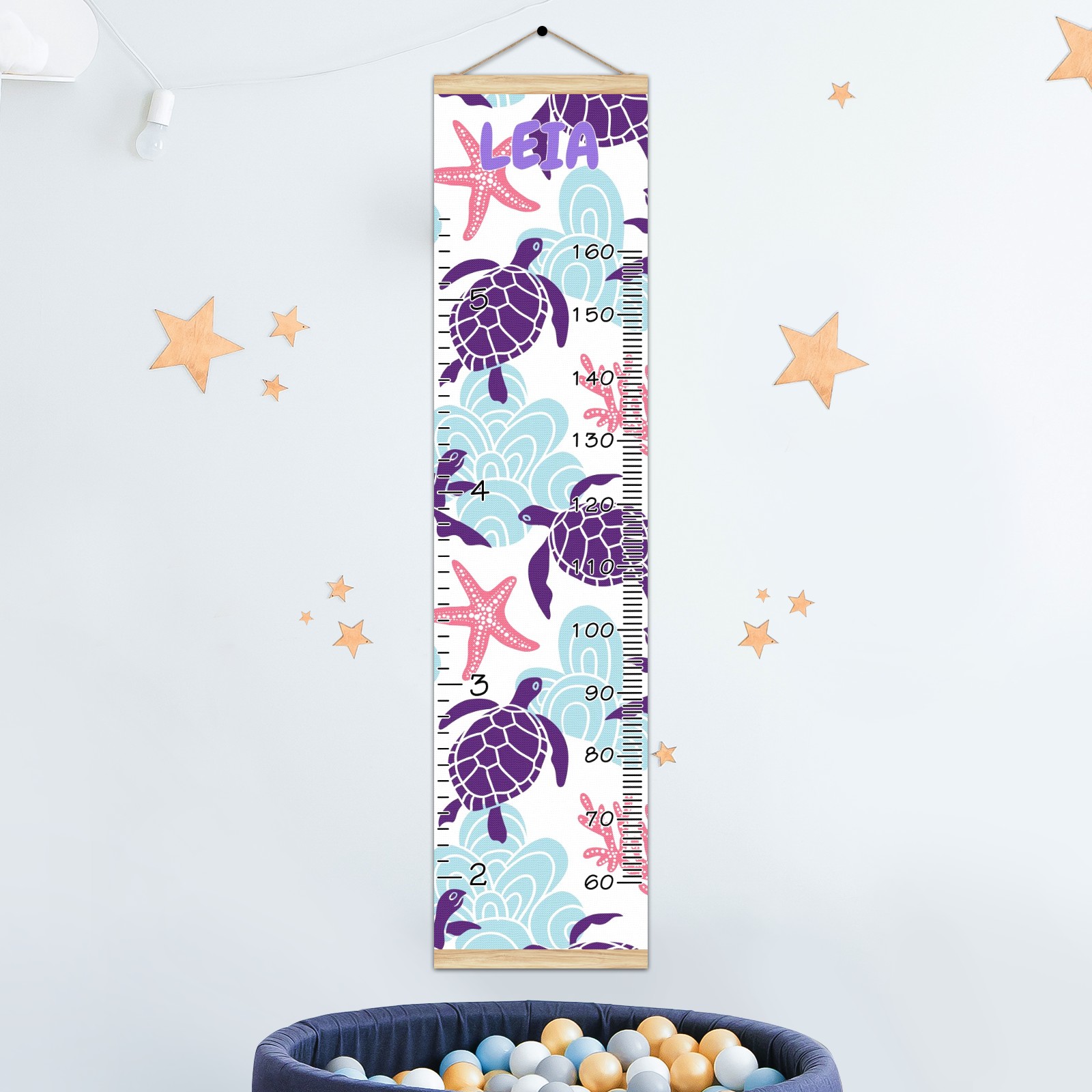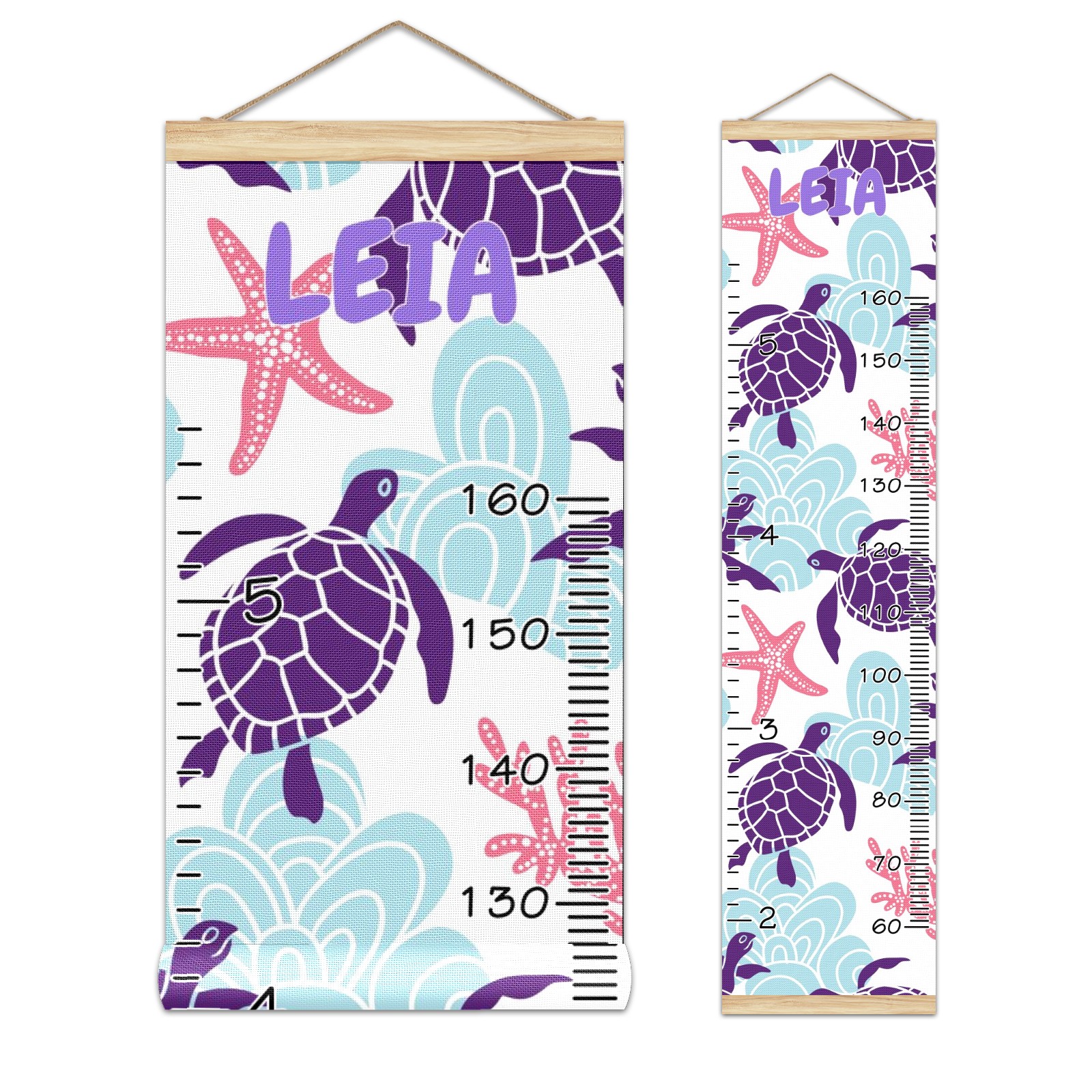 Personalized Kids Name Growth Chart Ruler for Wall Wood Frame Canvas Height Measure Chart 13.4x56 in Hanging Growth Chart Sea Turtle Starfish Coral4.24 Boys Girls Room Decor