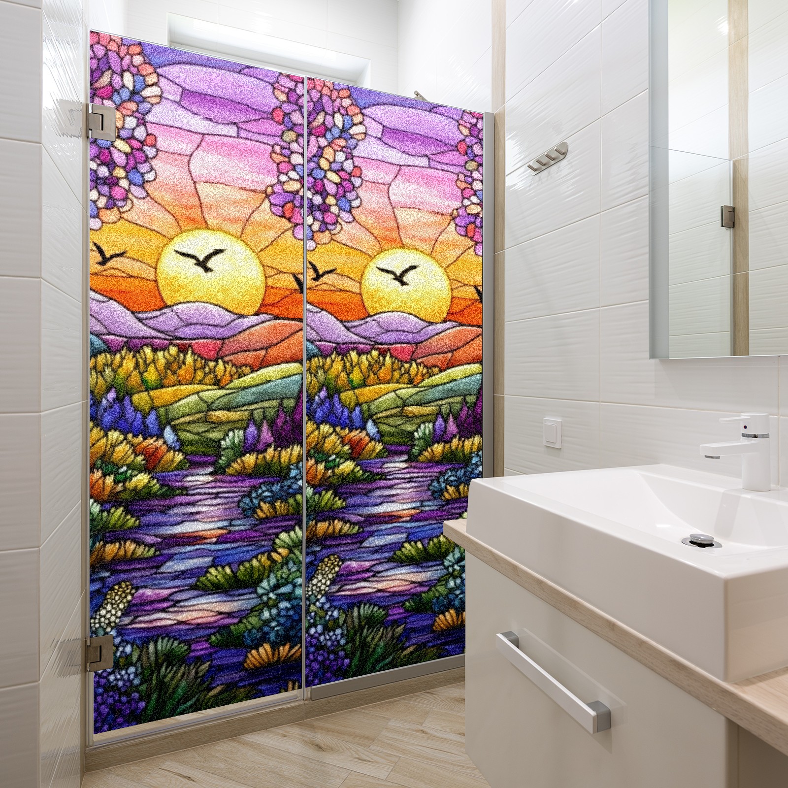 Stained Glass Window Film - Decorative Privacy Film for Windows, Peel and Stick Window Film for Bathroom/Office/Shower, Reusable and Easy to Cut 17.7"x23.6" (Colorful Forest Scene)