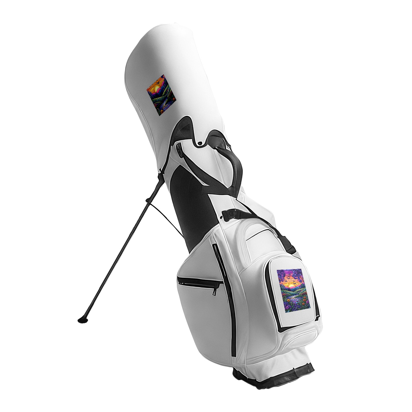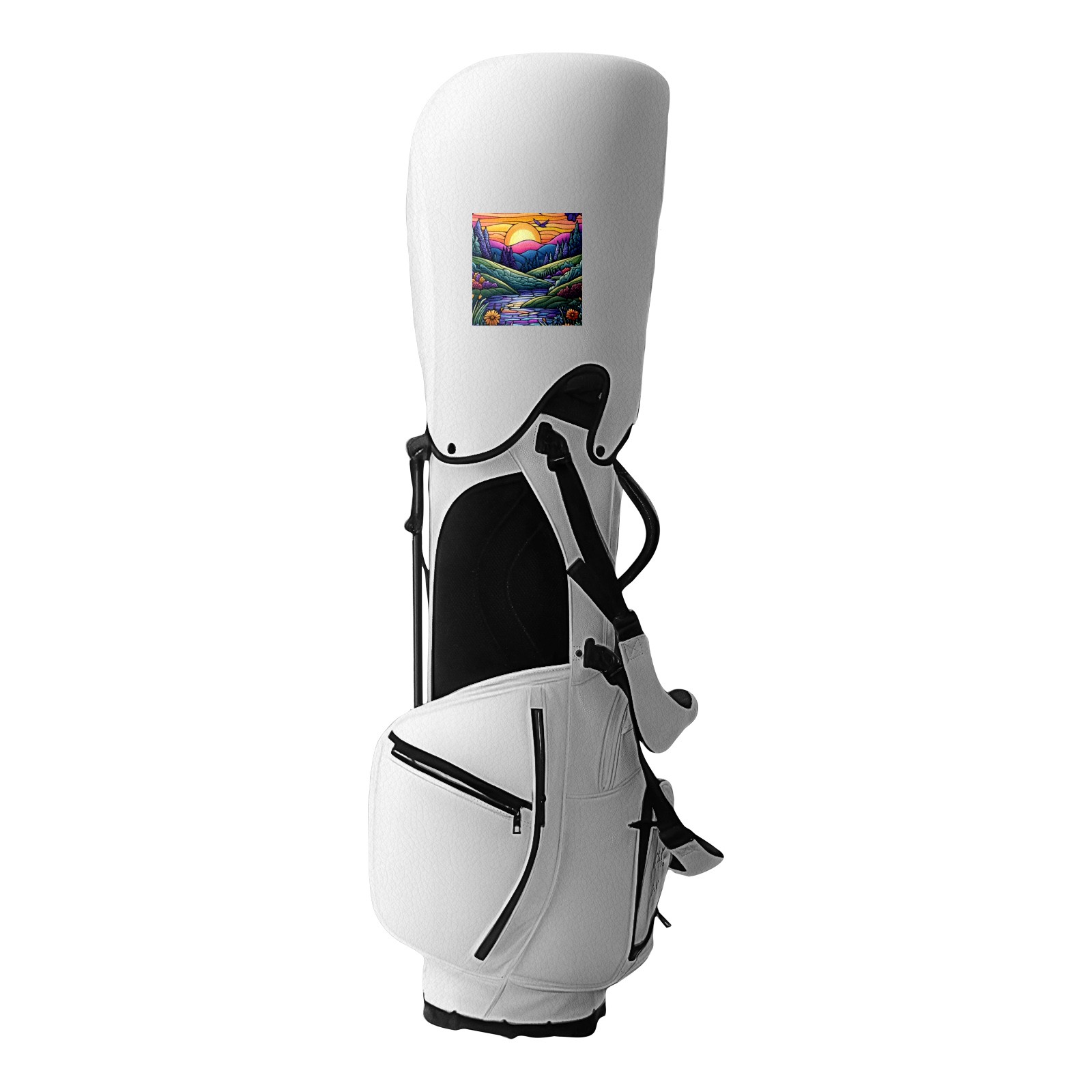 Golf Stand Bag - 14 Way Top Dividers, Ergonomic Backpack Strap, 8 Pockets with Cooler, Waterproof Lichee PU Leather, Customizable 15x15cm, Black/White, Includes Rain Cover & Dust Bag Purple And Blue Sunset