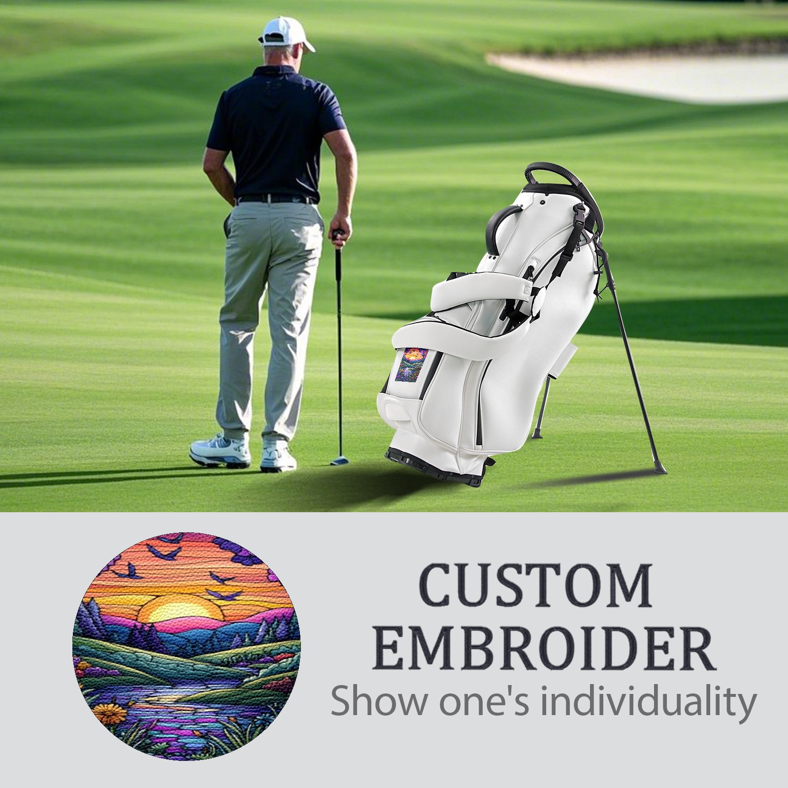 <p>The Golf Stand Bag, designed specifically for golf enthusiasts, offers a choice of 5 - way and 14 - way top dividers. Its 5/14 - compartment design with independent full - size club compartments safeguards clubs from collisions. Equipped with a rain cover, waterproof zippered pockets (tested to resist moderate to heavy rain), and a high - performance cooler pouch that can keep drinks cold for hours, it ensures a convenient golfing experience. The bag features thickened, breathable neoprene shoulder straps and an adjustable chest buckle, reducing shoulder fatigue by 35% compared to regular bags, and its automatic aluminum alloy stand provides stable support on various terrains. Crafted from top - tier, water - resistant litchi - grain PU leather, with double - stitched edges, reliable zippers tested for over 15,000 cycles, and anti - abrasion bottom studs, it guarantees durability. You can personalize it with embroidery on the front pocket and rain cover side (15*15cm area), and it comes in classic black and white, with a matte finish and litchi - grain texture that combines business and leisure styles. Measuring 130 cm in height, 37 cm in width, and 31 cm in depth (including rain cover) and 90 cm x 31 cm x 37 cm (excluding rain cover), it strikes a balance between storage and portability, capable of holding 14 standard - sized clubs and other essentials, and it also includes a dust cover. It's truly the perfect choice for golfers.<br></p>