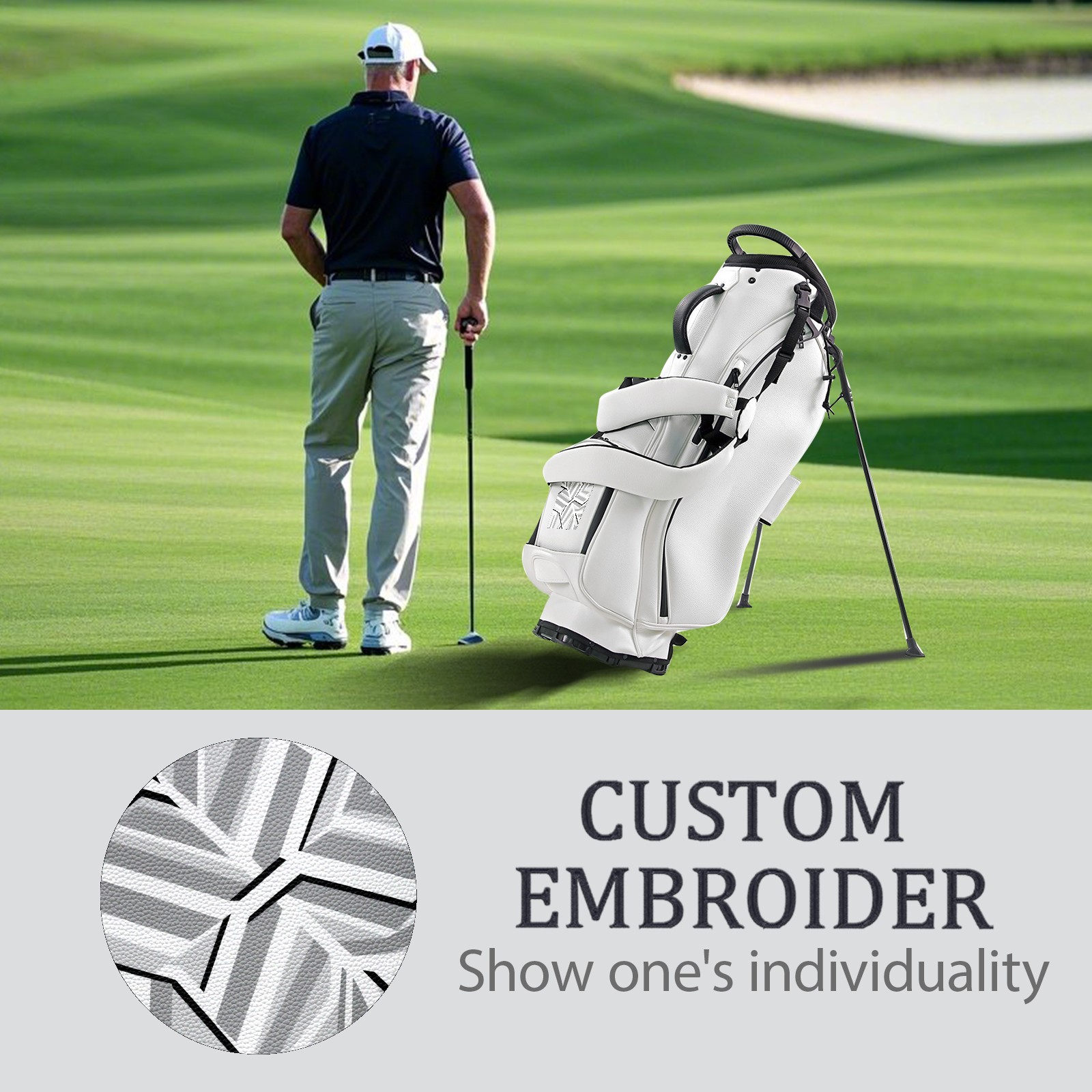 <p>The Golf Stand Bag, designed specifically for golf enthusiasts, offers a choice of 5 - way and 14 - way top dividers. Its 5/14 - compartment design with independent full - size club compartments safeguards clubs from collisions. Equipped with a rain cover, waterproof zippered pockets (tested to resist moderate to heavy rain), and a high - performance cooler pouch that can keep drinks cold for hours, it ensures a convenient golfing experience. The bag features thickened, breathable neoprene shoulder straps and an adjustable chest buckle, reducing shoulder fatigue by 35% compared to regular bags, and its automatic aluminum alloy stand provides stable support on various terrains. Crafted from top - tier, water - resistant litchi - grain PU leather, with double - stitched edges, reliable zippers tested for over 15,000 cycles, and anti - abrasion bottom studs, it guarantees durability. You can personalize it with embroidery on the front pocket and rain cover side (15*15cm area), and it comes in classic black and white, with a matte finish and litchi - grain texture that combines business and leisure styles. Measuring 130 cm in height, 37 cm in width, and 31 cm in depth (including rain cover) and 90 cm x 31 cm x 37 cm (excluding rain cover), it strikes a balance between storage and portability, capable of holding 14 standard - sized clubs and other essentials, and it also includes a dust cover. It's truly the perfect choice for golfers.<br></p>