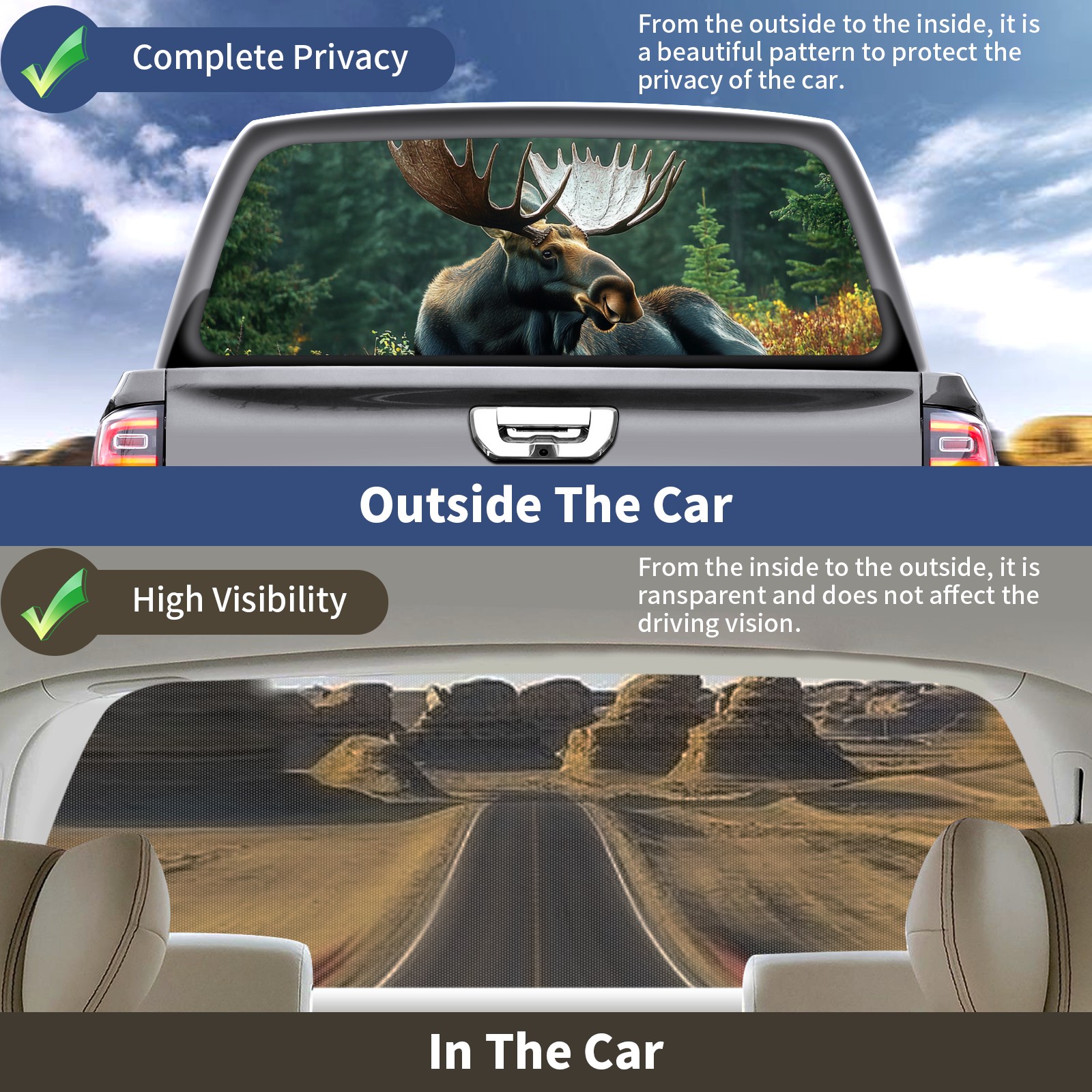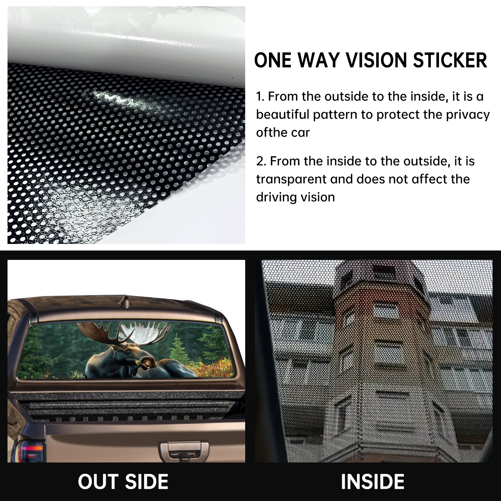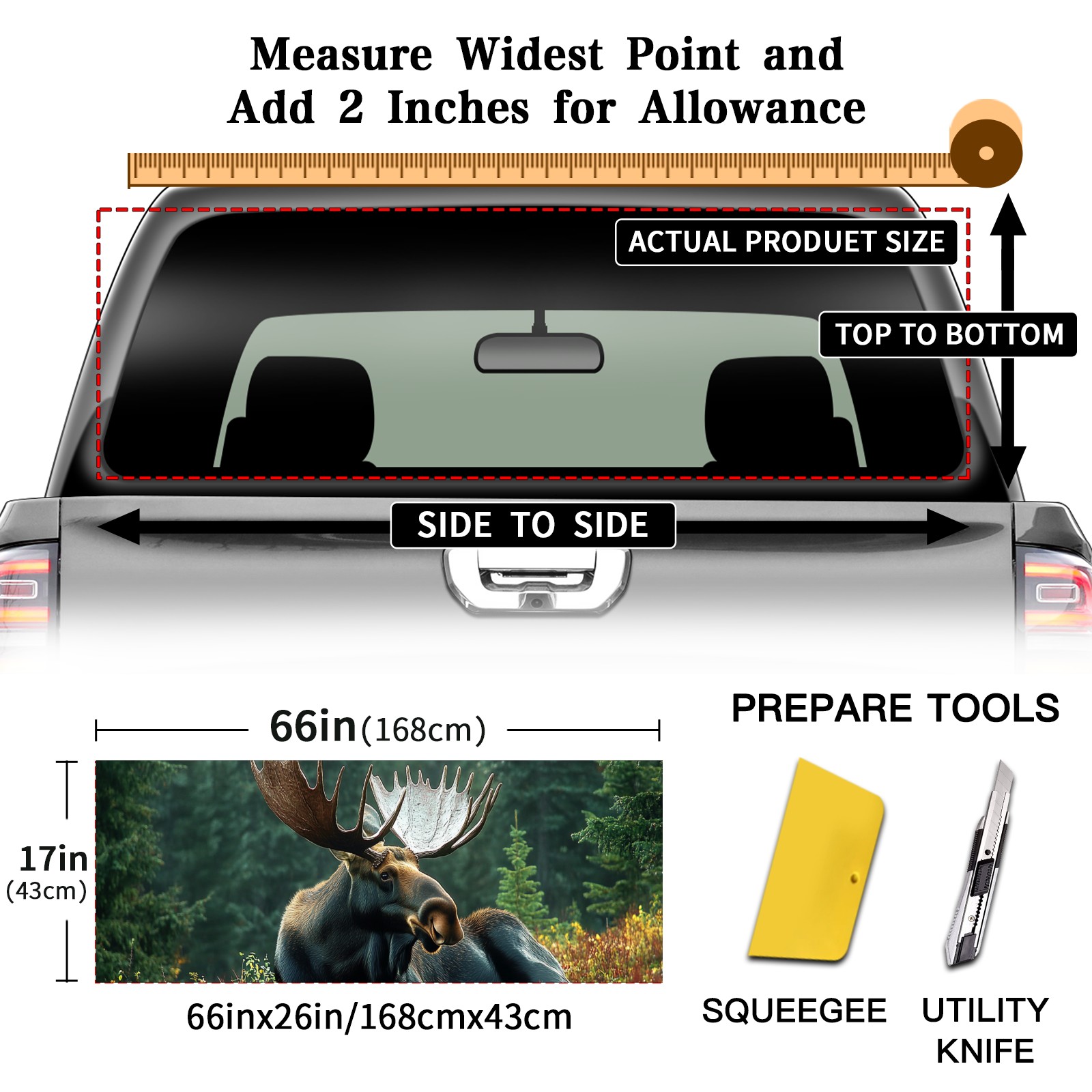 <p><strong>Truck Rear Window Graphics Decals Pickup Trucks Back Window Film Stickers 66" x 22" Perforated Vinyl Wrap Stickers Decorations for Car Rear Window</strong></p><p><strong><br /></strong></p><p><strong>Features :</strong></p><p>- Size of the rear window decals for trucks is 66x22 Inches (168x56cm).</p><p>- High quality perforated vinyl window film, one way vision sticker.</p><p>- Perforated is see through from the inside but not from outside.</p><p>- Clear printing, waterproof and durable.</p><p>- The car back window graphics stickers fits most truck and makes your vehicle more beautiful. </p><p><br /></p><p><strong>【Installation Instructions】</strong></p><p><strong>1. CLEAN SURFACE -</strong> Clean the rear window thoroughly and make sure the surface clean.</p><p><strong>2. STICK THE DECALS -</strong> Tear off the paper on the back and stick the decal on the window.</p><p><strong>3. SCRAPE OFF AIR BUBBLES -</strong> Use a squeegee or other card to scrape off the excess air bubbles.</p><p><strong>4. TRIM THE EXCESS -</strong> Use a knife to cut off the excess stickers of the window, finally complete.</p><p><br /></p><p>1. Please measure the size before purchasing, back window graphics decal for truck can be cut to your desired size.</p><p>2.The graphics stickers for truck back window is a great gift for yourself also can as a birthday / halloween / christmas gift for your friends and family.</p>