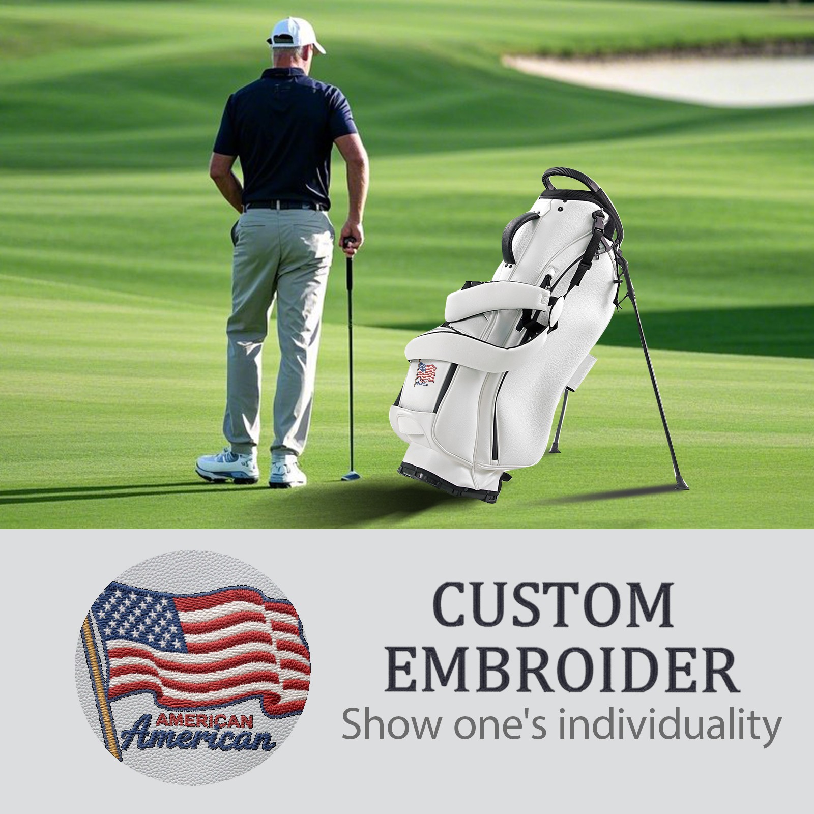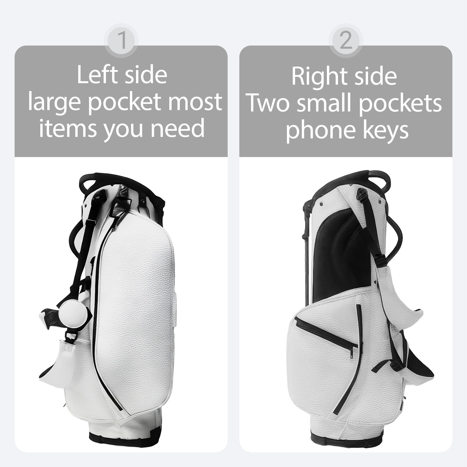 <p>Golf bag | Waterproof PU leather | Customizable embroidery</p> <p>Logistics: Due to customs policies, only sea transportation is available. 18 days of transportation time</p> <p>Dimensions: 130*37*31cm (including rain cover) 90*31*37 (excluding rain cover)</p> <p>5/14 partition layer large-capacity design, full-size golf club insertion and separation.</p> <p>The whole body is lightweight and the rain cover is detachable.</p> <p>Equipped with an ice pack pocket, it has an excellent heat preservation effect.</p> <p>Waterproof and durable, suitable for all-weather golf.</p> <p>Customizable design: Personalized front pocket (embroidery/print) or the side part of the rain cover (15x15cm area).</p> <p>Practical pocket: The large left pocket is for towels/accessories; The two small pockets on the right are for mobile phones/keys (the waterproof zipper is safer).</p> <p>Ergonomic comfort: Add shoulder pads, adjustable chest straps, evenly distribute weight, and reduce shoulder pressure during long walks.</p> <p>The details are durable: the edges are reinforced with double stitching, the zipper is smooth and durable, and the bottom is designed with anti-scratch nails, suitable for placement in various terrains.</p> <p>Multi-functional aesthetics: Classic (lychee texture) matte finish, seamlessly blends into business environments.</p> <p>Two eternal colors: black is noble and white is modern.</p>