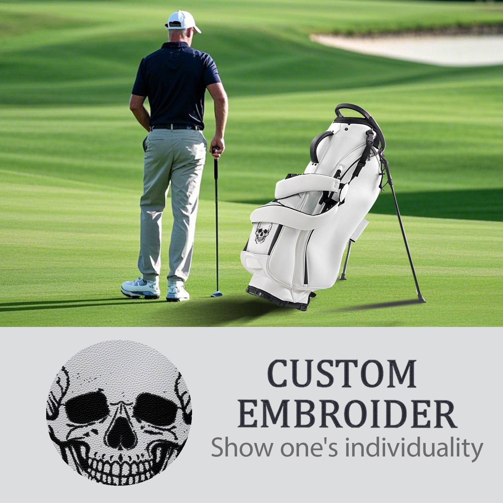 Customizable Lightweight Golf Stand Bag for Men Women 5 Way Top Dividers Waterproof PU Leather Golf Bag with Rain Cover Ergonomic Shoulder Strap White White Skull2