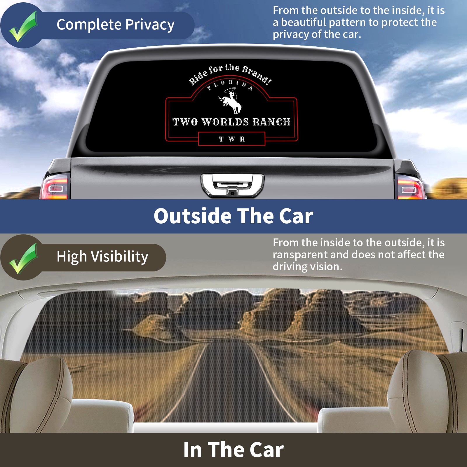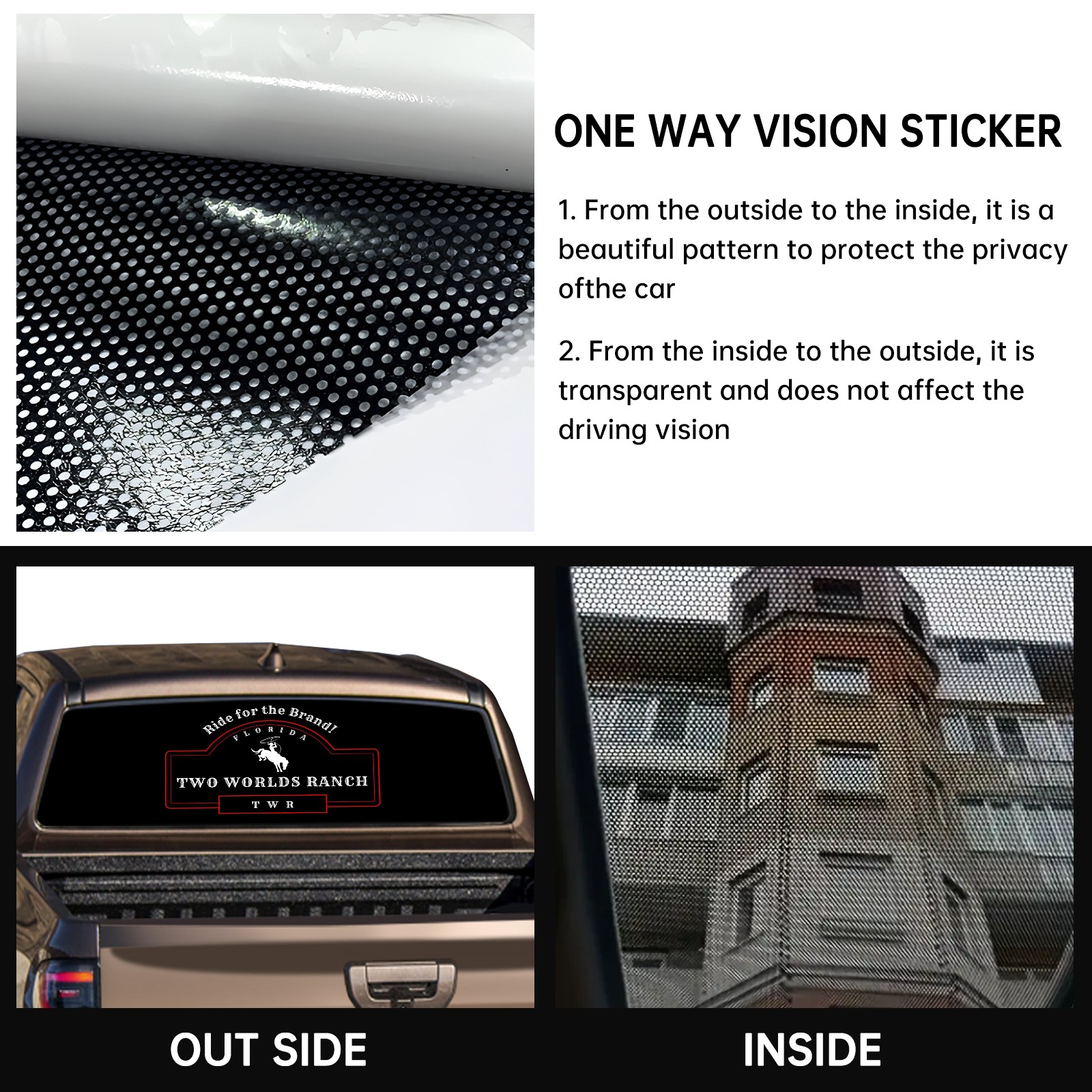 <p><strong>Truck Rear Window Graphics Decals Pickup Trucks Back Window Film Stickers 66" x 22" Perforated Vinyl Wrap Stickers Decorations for Car Rear Window</strong></p><p><strong><br /></strong></p><p><strong>Features :</strong></p><p>- Size of the rear window decals for trucks is 66x22 Inches (168x56cm).</p><p>- High quality perforated vinyl window film, one way vision sticker.</p><p>- Perforated is see through from the inside but not from outside.</p><p>- Clear printing, waterproof and durable.</p><p>- The car back window graphics stickers fits most truck and makes your vehicle more beautiful.&nbsp;</p><p><br /></p><p><strong>【Installation Instructions】</strong></p><p><strong>1. CLEAN SURFACE -</strong> Clean the rear window thoroughly and make sure the surface clean.</p><p><strong>2. STICK THE DECALS -</strong> Tear off the paper on the back and stick the decal on the window.</p><p><strong>3. SCRAPE OFF AIR BUBBLES -</strong> Use a squeegee or other card to scrape off the excess air bubbles.</p><p><strong>4. TRIM THE EXCESS -</strong> Use a knife to cut off the excess stickers of the window, finally complete.</p><p><br /></p><p>1. Please measure the size before purchasing, back window graphics decal for truck can be cut to your desired size.</p><p>2.The graphics stickers for truck back window is a great gift for yourself also can as a birthday / halloween / christmas gift for your friends and family.</p>