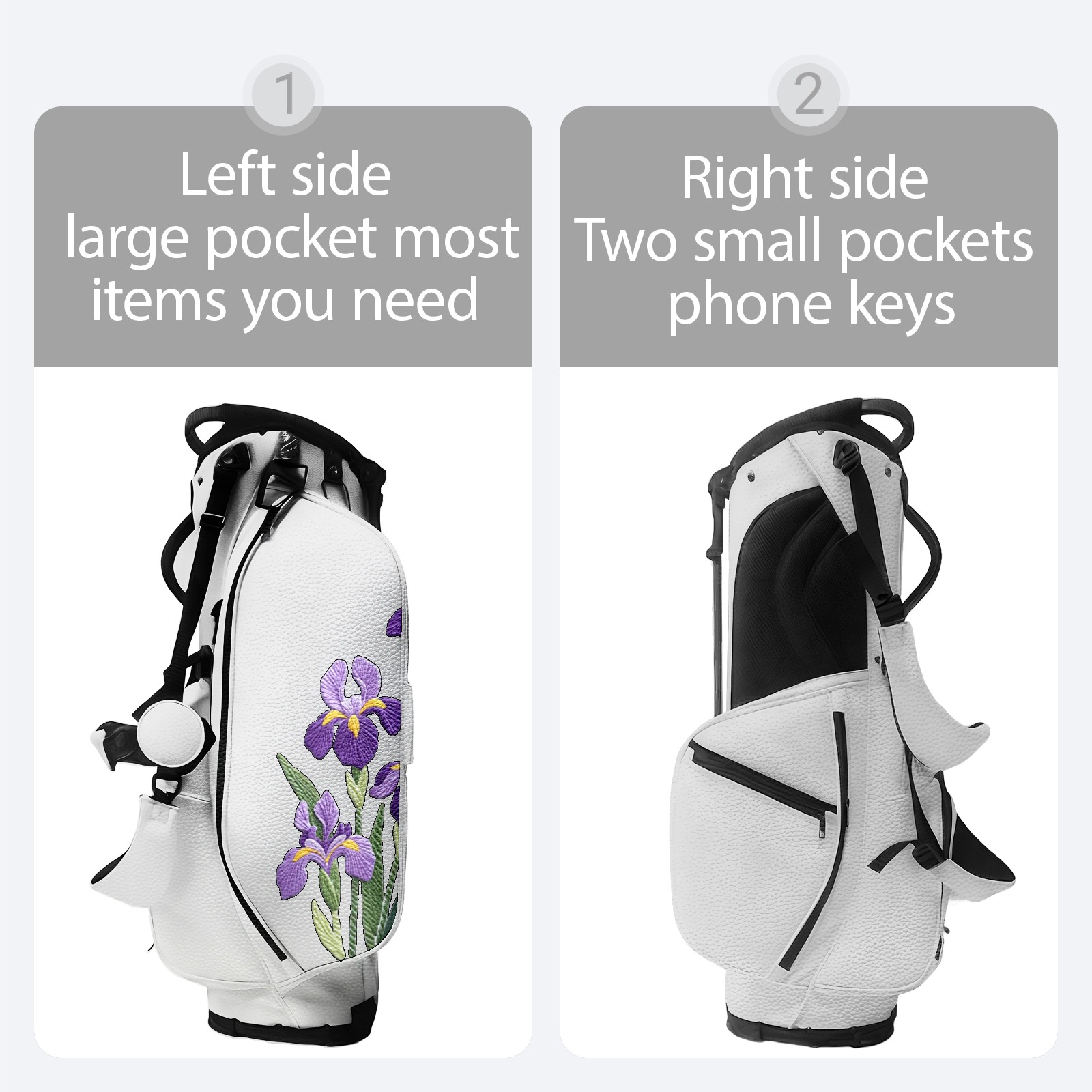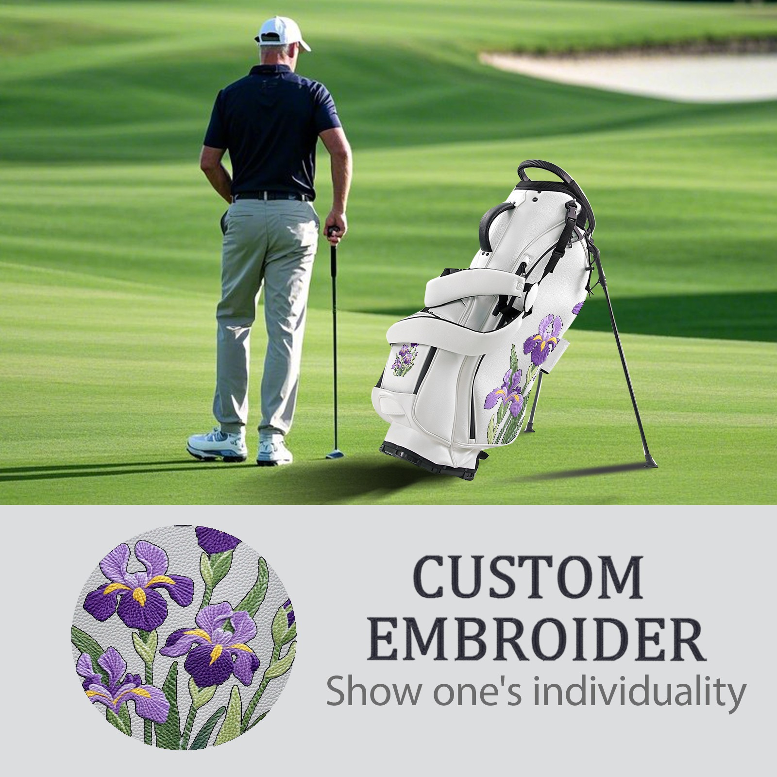 <p>Golf bag | Waterproof PU leather | Customizable embroidery</p> <p>Logistics: Due to customs policies, only sea transportation is available. 18 days of transportation time</p> <p>Dimensions: 130*37*31cm (including rain cover) 90*31*37 (excluding rain cover)</p> <p>5/14 partition layer large-capacity design, full-size golf club insertion and separation.</p> <p>The whole body is lightweight and the rain cover is detachable.</p> <p>Equipped with an ice pack pocket, it has an excellent heat preservation effect.</p> <p>Waterproof and durable, suitable for all-weather golf.</p> <p>Customizable design: Personalized front pocket (embroidery/print) or the side part of the rain cover (15x15cm area).</p> <p>Practical pocket: The large left pocket is for towels/accessories; The two small pockets on the right are for mobile phones/keys (the waterproof zipper is safer).</p> <p>Ergonomic comfort: Add shoulder pads, adjustable chest straps, evenly distribute weight, and reduce shoulder pressure during long walks.</p> <p>The details are durable: the edges are reinforced with double stitching, the zipper is smooth and durable, and the bottom is designed with anti-scratch nails, suitable for placement in various terrains.</p> <p>Multi-functional aesthetics: Classic (lychee texture) matte finish, seamlessly blends into business environments.</p> <p>Two eternal colors: black is noble and white is modern.</p>