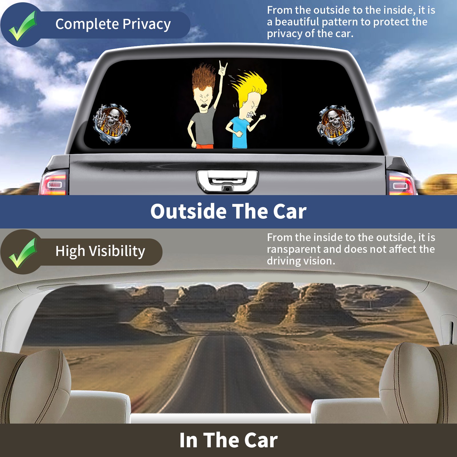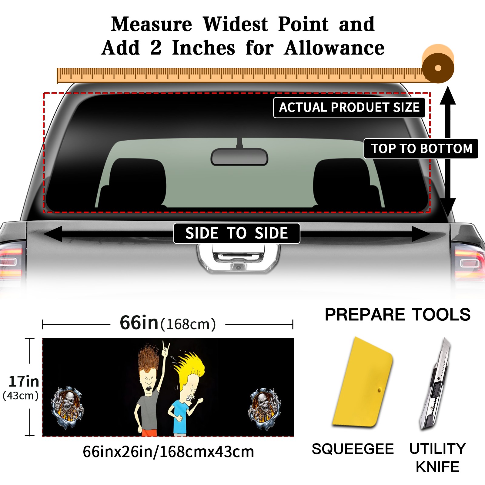 <p><strong>Truck Rear Window Graphics Decals Pickup Trucks Back Window Film Stickers 66" x 22" Perforated Vinyl Wrap Stickers Decorations for Car Rear Window</strong></p><p><strong><br /></strong></p><p><strong>Features :</strong></p><p>- Size of the rear window decals for trucks is 66x22 Inches (168x56cm).</p><p>- High quality perforated vinyl window film, one way vision sticker.</p><p>- Perforated is see through from the inside but not from outside.</p><p>- Clear printing, waterproof and durable.</p><p>- The car back window graphics stickers fits most truck and makes your vehicle more beautiful.&nbsp;</p><p><br /></p><p><strong>【Installation Instructions】</strong></p><p><strong>1. CLEAN SURFACE -</strong> Clean the rear window thoroughly and make sure the surface clean.</p><p><strong>2. STICK THE DECALS -</strong> Tear off the paper on the back and stick the decal on the window.</p><p><strong>3. SCRAPE OFF AIR BUBBLES -</strong> Use a squeegee or other card to scrape off the excess air bubbles.</p><p><strong>4. TRIM THE EXCESS -</strong> Use a knife to cut off the excess stickers of the window, finally complete.</p><p><br /></p><p>1. Please measure the size before purchasing, back window graphics decal for truck can be cut to your desired size.</p><p>2.The graphics stickers for truck back window is a great gift for yourself also can as a birthday / halloween / christmas gift for your friends and family.</p>