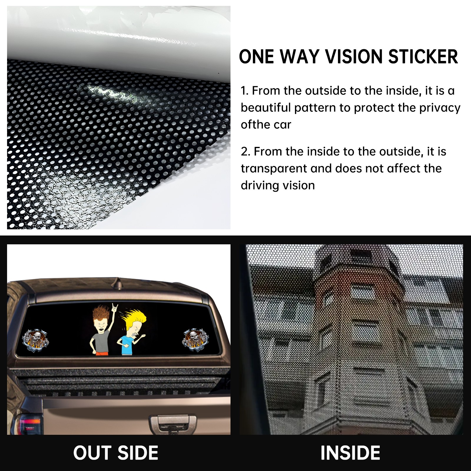 • <p><strong>Truck Rear Window Graphics Decals Pickup Trucks Back Window Film Stickers 66" x 22" Perforated Vinyl Wrap Stickers Decorations for Car Rear Window</strong></p><p><strong><br /></strong></p><p><strong>Features :</strong></p><p>- Size of the rear window decals for trucks is 66x22 Inches (168x56cm).</p><p>- High quality perforated vinyl window film, one way vision sticker.</p><p>- Perforated is see through from the inside but not from outside.</p><p>- Clear printing, waterproof and durable.</p><p>- The car back window graphics stickers fits most truck and makes your vehicle more beautiful.&nbsp;</p><p><br /></p><p><strong>【Installation Instructions】</strong></p><p><strong>1. CLEAN SURFACE -</strong> Clean the rear window thoroughly and make sure the surface clean.</p><p><strong>2. STICK THE DECALS -</strong> Tear off the paper on the back and stick the decal on the window.</p><p><strong>3. SCRAPE OFF AIR BUBBLES -</strong> Use a squeegee or other card to scrape off the excess air bubbles.</p><p><strong>4. TRIM THE EXCESS -</strong> Use a knife to cut off the excess stickers of the window, finally complete.</p><p><br /></p><p>1. Please measure the size before purchasing, back window graphics decal for truck can be cut to your desired size.</p><p>2.The graphics stickers for truck back window is a great gift for yourself also can as a birthday / halloween / christmas gift for your friends and family.</p>