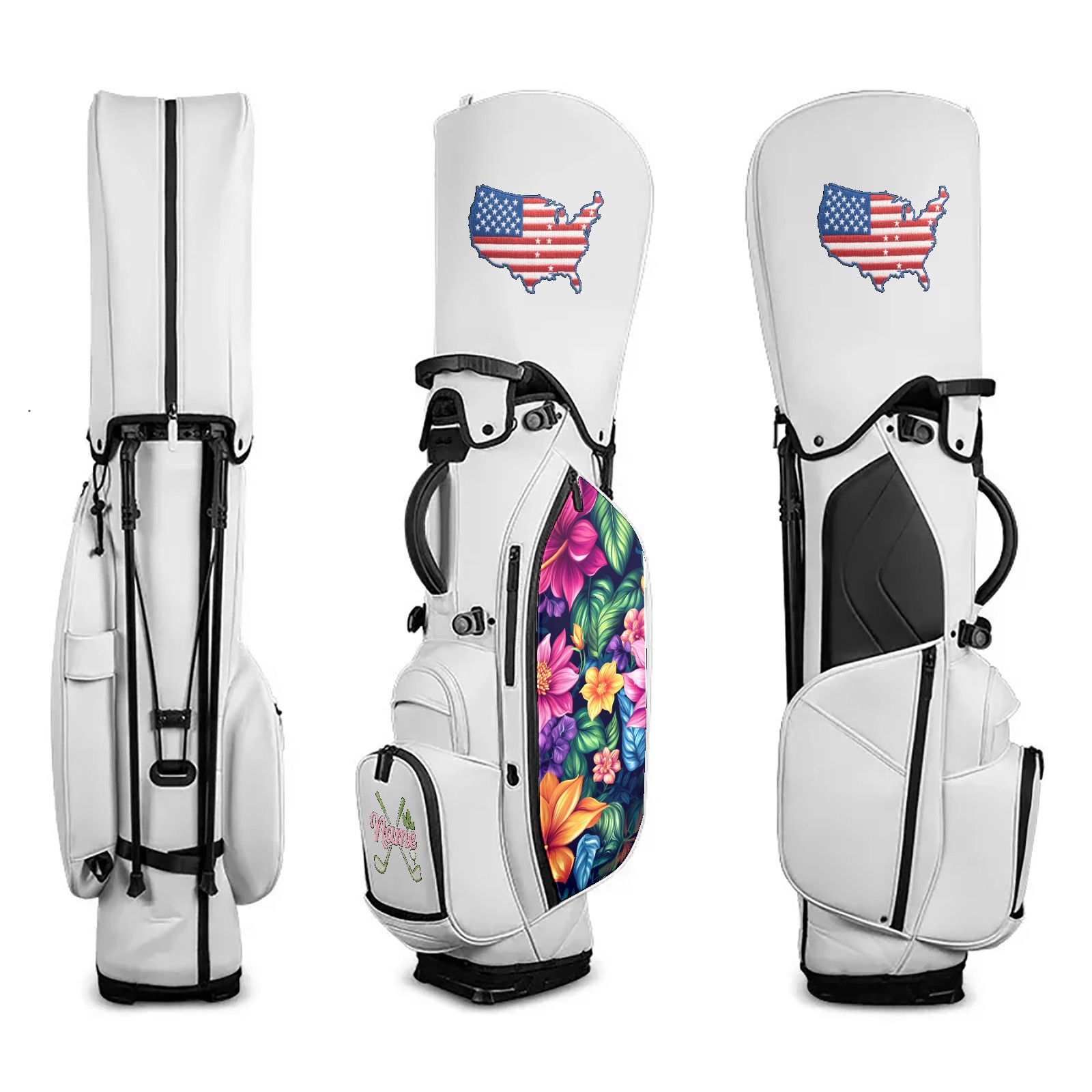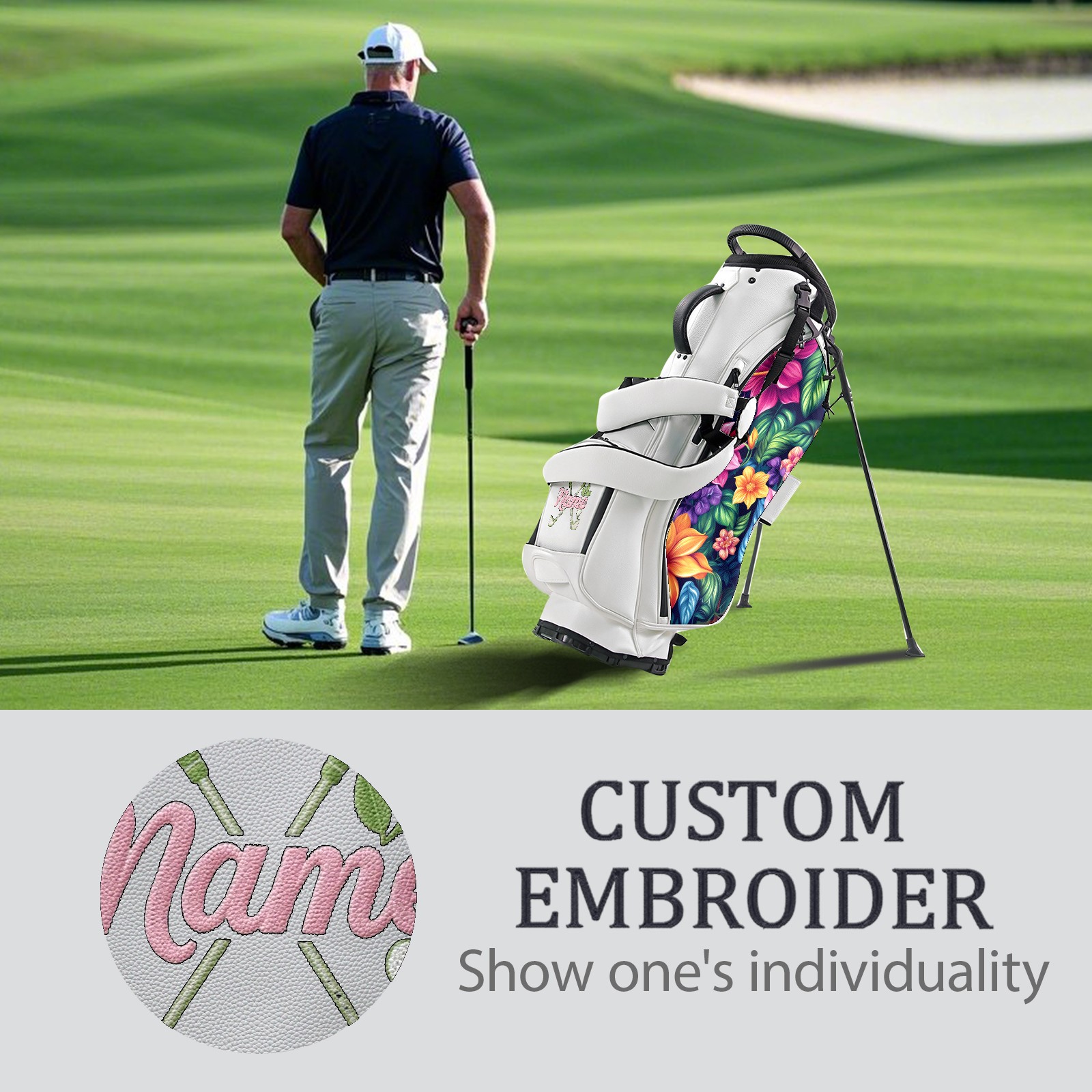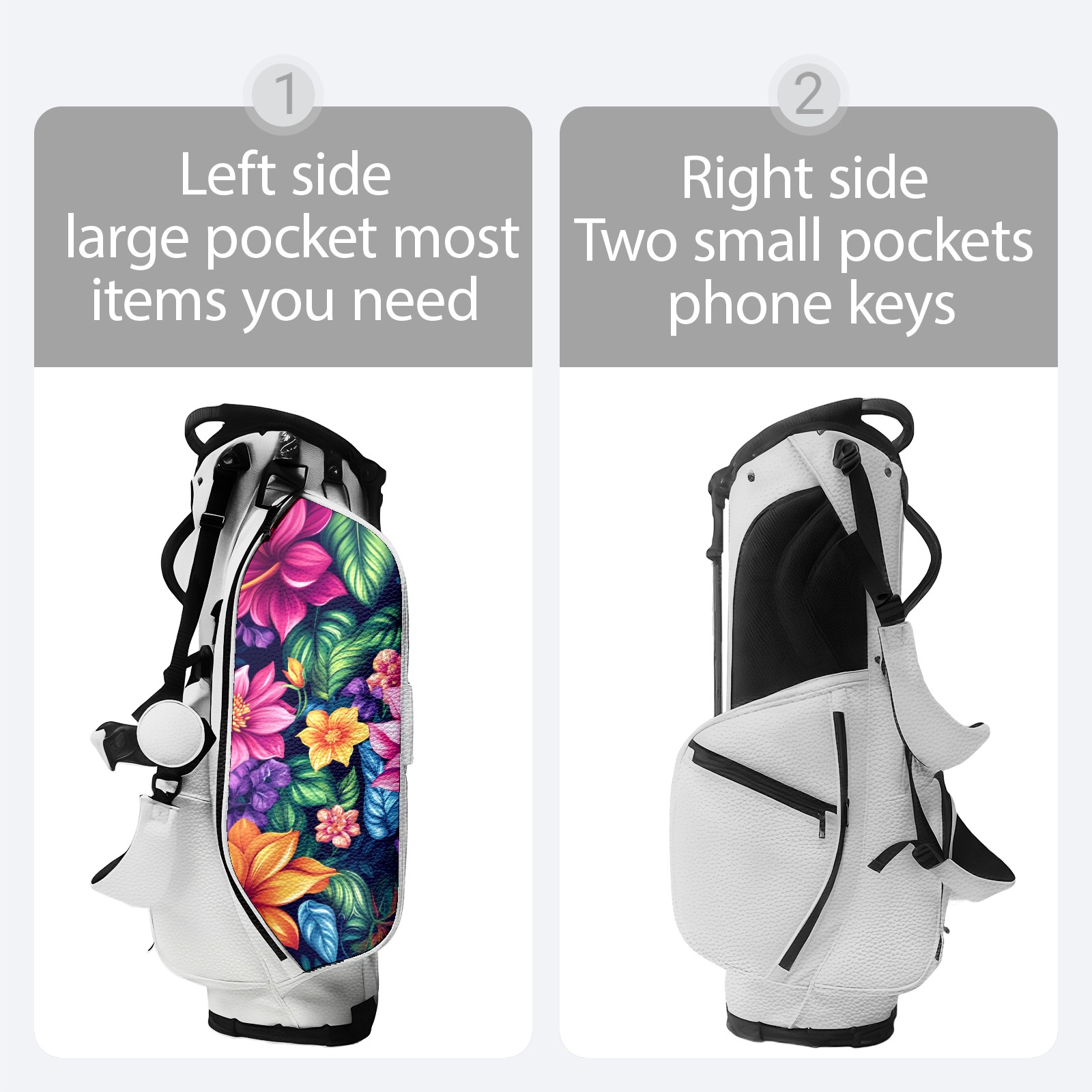 Golf Stand Bag 5-Way Dividers, Lightweight Golf Bag with Stand for Men Women, Waterproof PU Leather Golf Bag with Cooler & 7 Pockets, Adjustable Dual Straps (Tropical Flowes)
