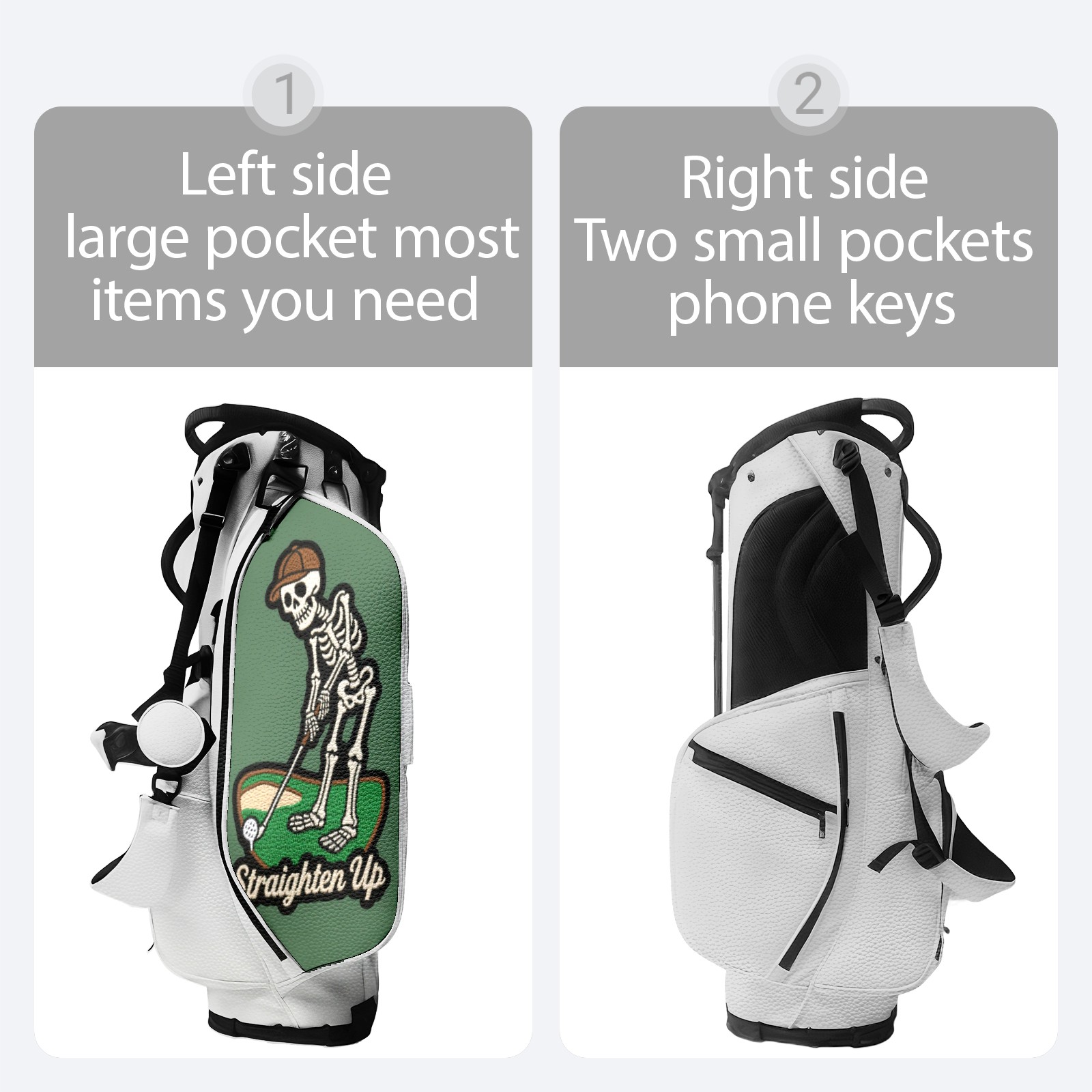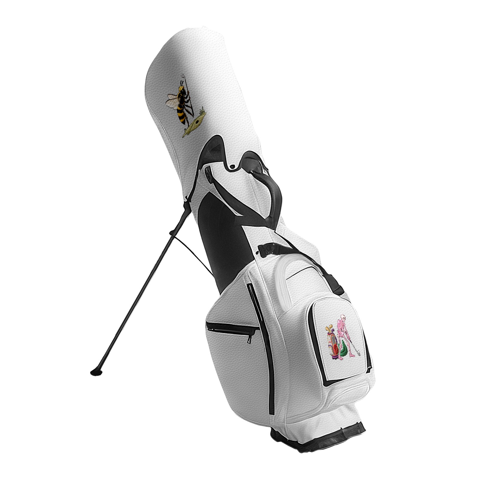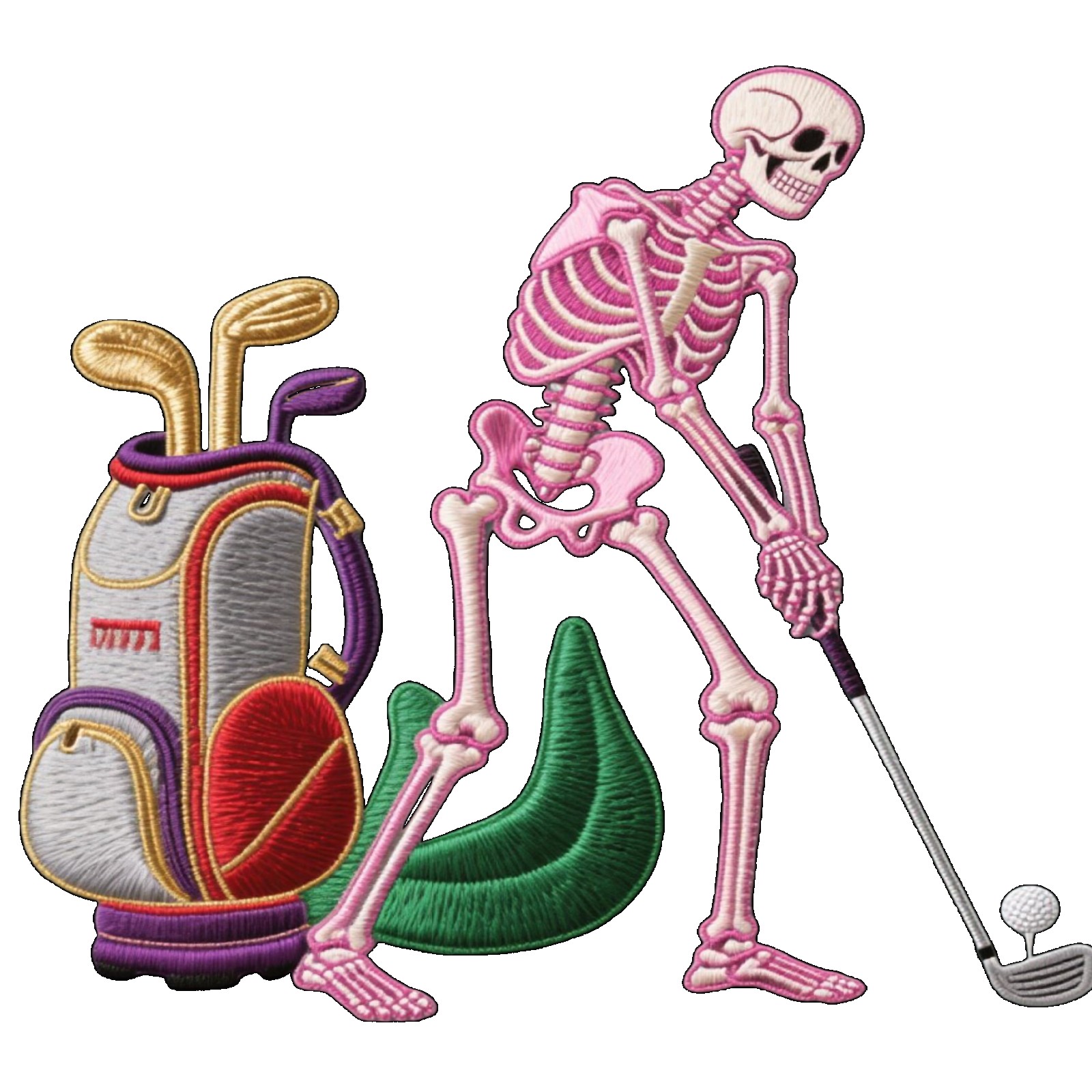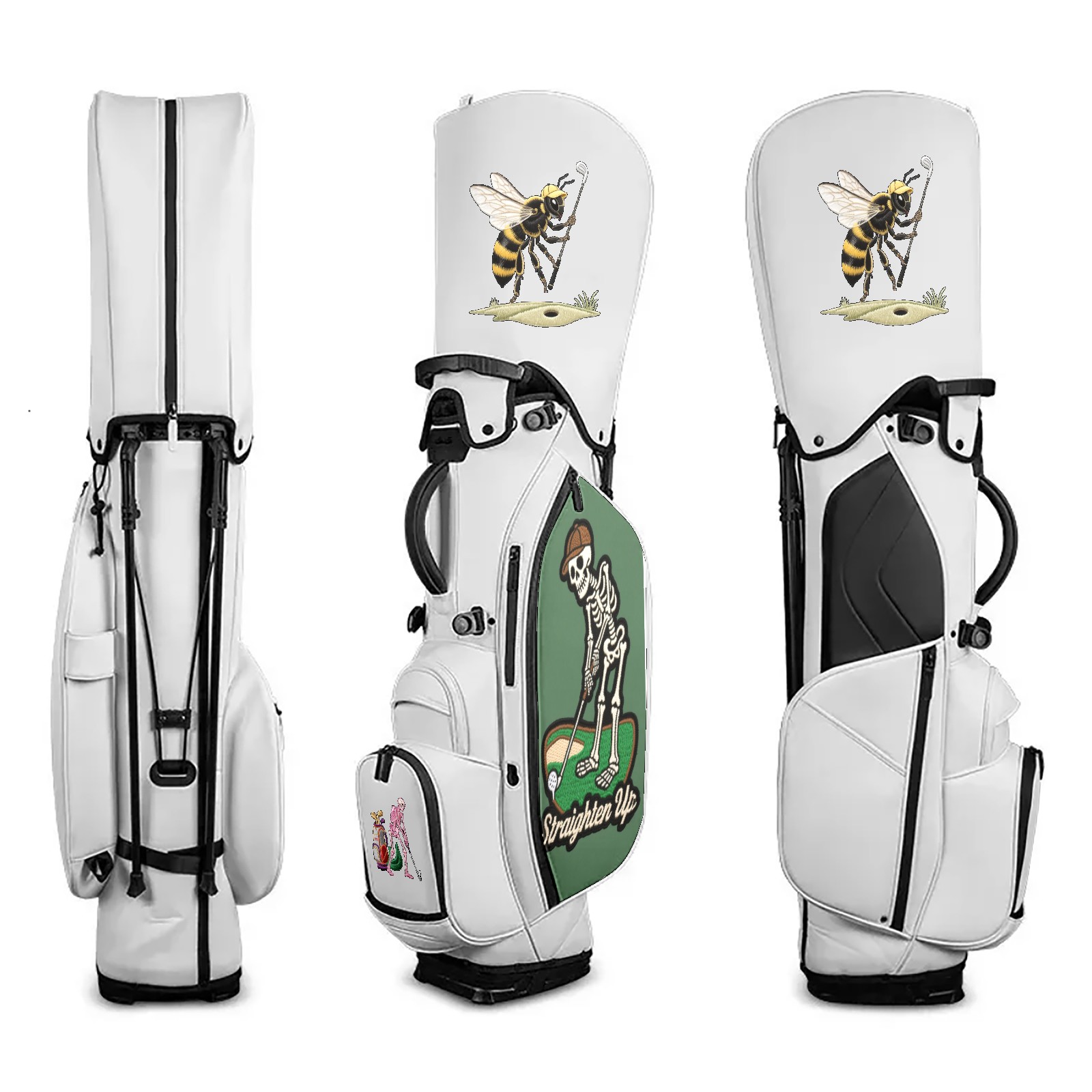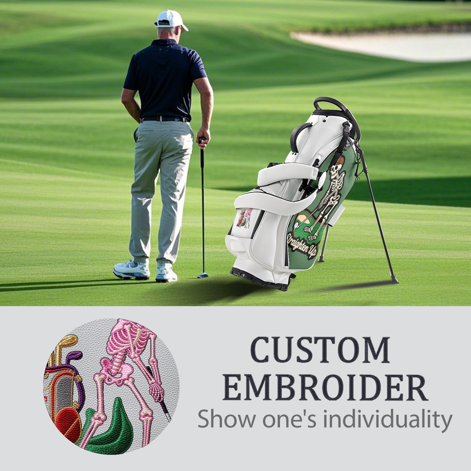 Golf Stand Bag 5-Way Dividers, Lightweight Golf Bag with Stand for Men Women, Waterproof PU Leather Golf Bag with Cooler & 7 Pockets, Adjustable Dual Straps (Jimeng-2025-05-09-432-刺绣风格设计,主体是一个骷髅头,骷髅头戴着一顶高尔夫帽,手持高尔夫球杆,正做出击球的动作。骷髅头的骨骼细节清晰,眼窝深邃,整体风格带有幽默和神秘感。背景是简...)