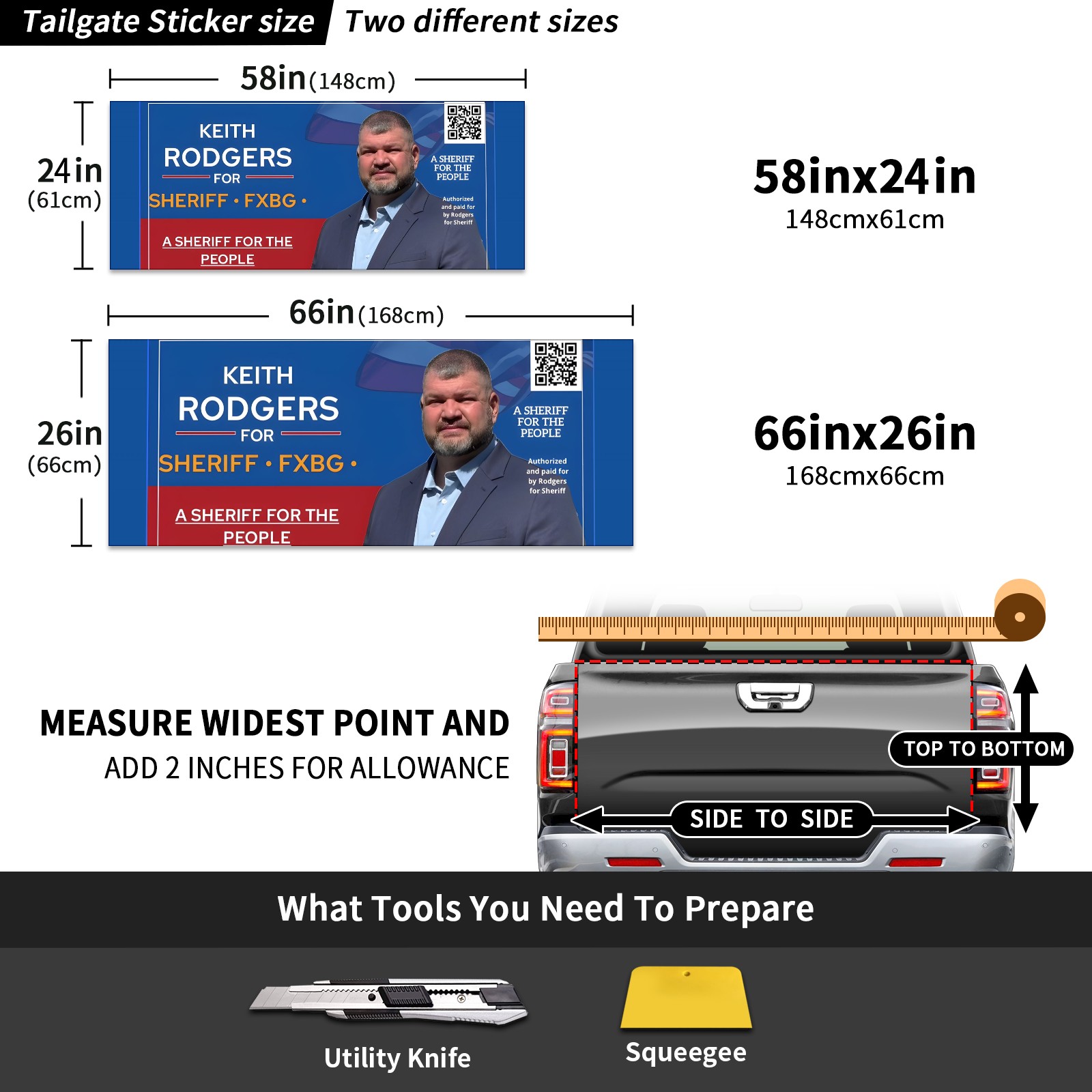 <p><strong>Truck Tailgate Wraps Vinyl Graphic Decal Sticker Pickup Rear Tailgate Graphics Wrap for Truck Pickup Car Camper for Men and Women</strong></p><p>Size:</p><p>66″(L) x 26″(W) (168cm x 66cm)</p><p>58″(L) x 24″(W) (148cm x 61cm)</p><p>Material: PVC Vinyl</p><p>Applicable Places: Truck Tailgate</p><p>Shape: Banner</p><p>Package Includes: 1* Vinyl Decal.</p><p>Please measure your tailgate before ordering to make sure the provided size will fit correctly.</p><p><br /></p><p>- Our pickup tailgate wraps are trimmable so you can fit them to your size by trimming them according to the measurements. Our tailgate stickers are digitally printed on professinoal high quality vinyls, give an impressive HD look and vibrant, long lasting colors.</p><p>- This graphic decals for the truck tailgate is made of PVC vinyl material to provide durability against weather and dust. Waterproof and weather-resistant. It can last up for a long time without fading.</p><p>- The funny and cute tailgates graphics stickers made to fit most pickup trucks camper, you can put it on the front of vehicle or tailgate.</p><p>- Truck tailgates graphics wraps are the perfect spot to add character look to your drive vehilcle, get a lot of attention. Easy peel and stick installation. Place on the front, left, lower, rear, right, upper of the truck.</p>