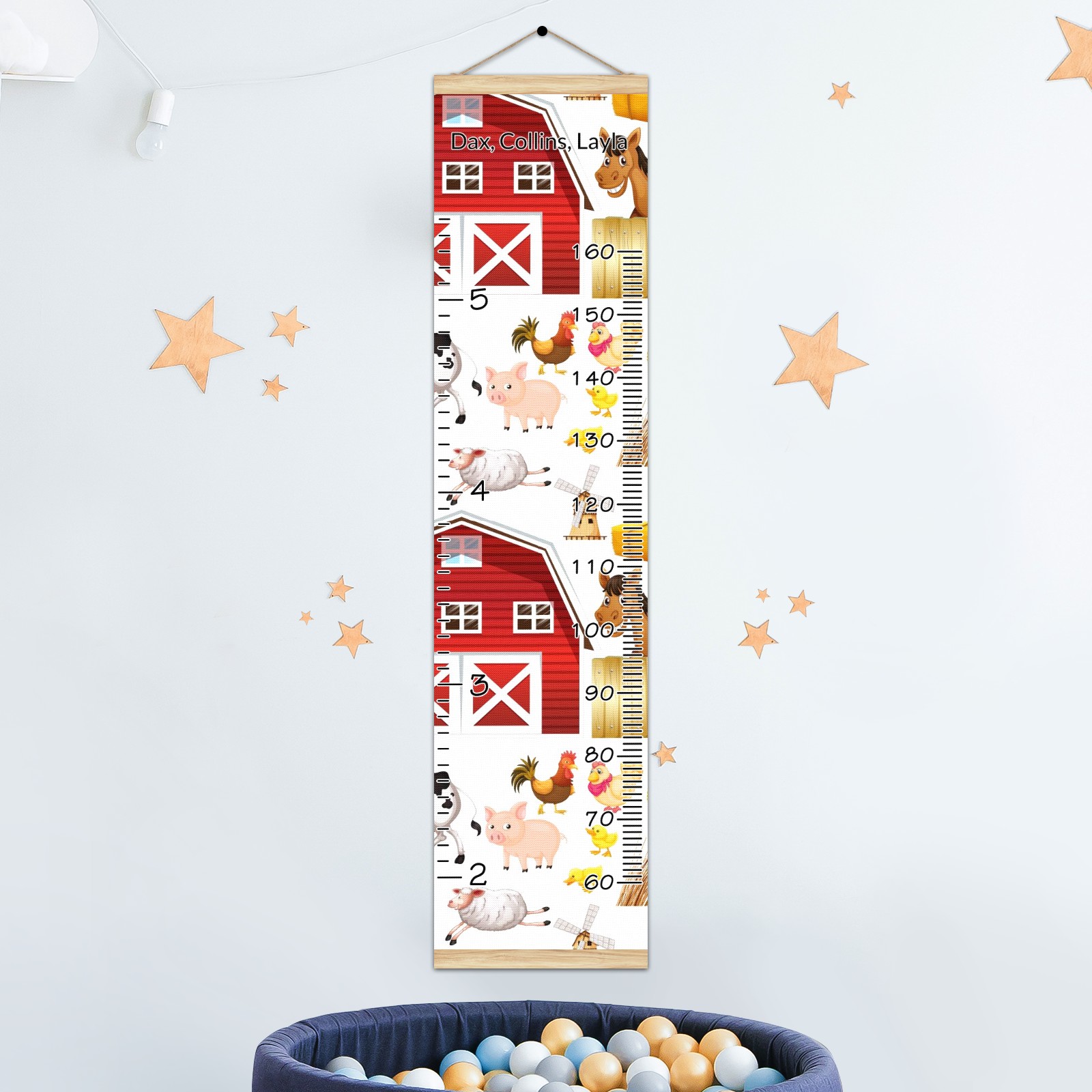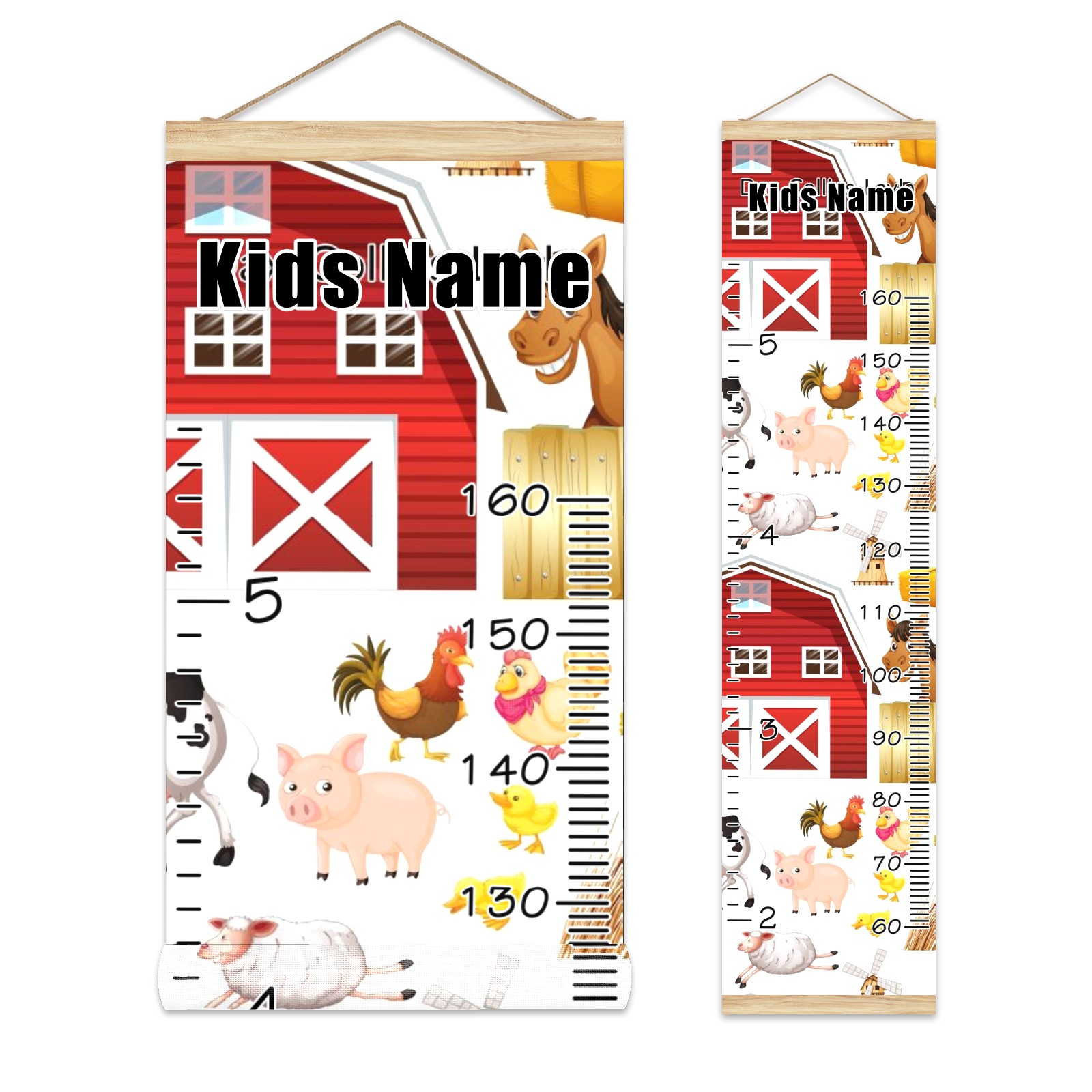 Personalized Kids Name Growth Chart Ruler for Wall Wood Frame Canvas Height Measure Chart 13.4x56 in Hanging Growth Chart Farm Animals Horse Red Barn5.13 Boys Girls Room Decor