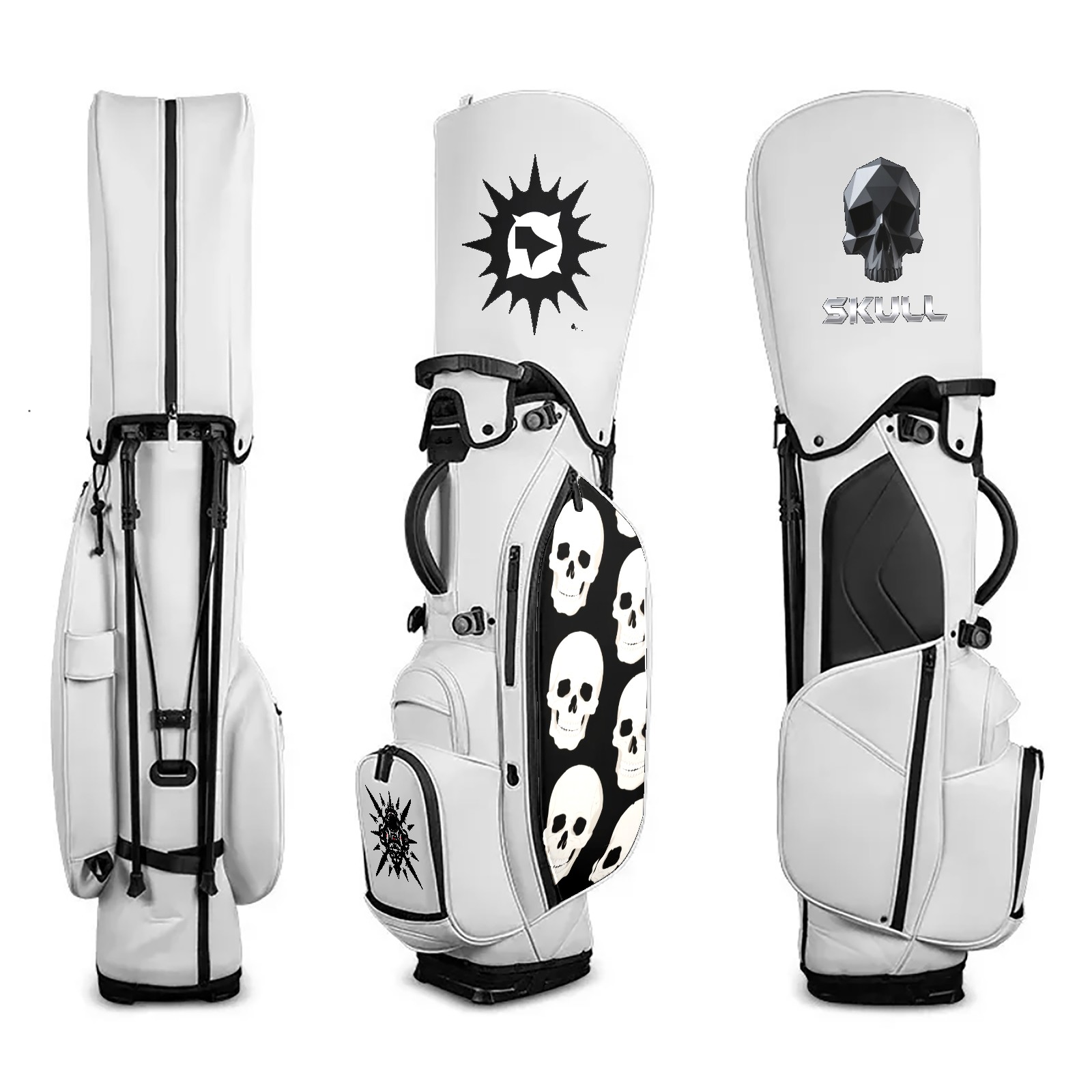 • <p>The Golf Stand Bag, designed specifically for golf enthusiasts, offers a choice of 5 - way and 14 - way top dividers. Its 5/14 - compartment design with independent full - size club compartments safeguards clubs from collisions. Equipped with a rain cover, waterproof zippered pockets (tested to resist moderate to heavy rain), and a high - performance cooler pouch that can keep drinks cold for hours, it ensures a convenient golfing experience. The bag features thickened, breathable neoprene shoulder straps and an adjustable chest buckle, reducing shoulder fatigue by 35% compared to regular bags, and its automatic aluminum alloy stand provides stable support on various terrains. Crafted from top - tier, water - resistant litchi - grain PU leather, with double - stitched edges, reliable zippers tested for over 15,000 cycles, and anti - abrasion bottom studs, it guarantees durability. You can personalize it with embroidery on the front pocket and rain cover side (15*15cm area), and it comes in classic black and white, with a matte finish and litchi - grain texture that combines business and leisure styles. Measuring 130 cm in height, 37 cm in width, and 31 cm in depth (including rain cover) and 90 cm x 31 cm x 37 cm (excluding rain cover), it strikes a balance between storage and portability, capable of holding 14 standard - sized clubs and other essentials, and it also includes a dust cover. It's truly the perfect choice for golfers.<br></p>