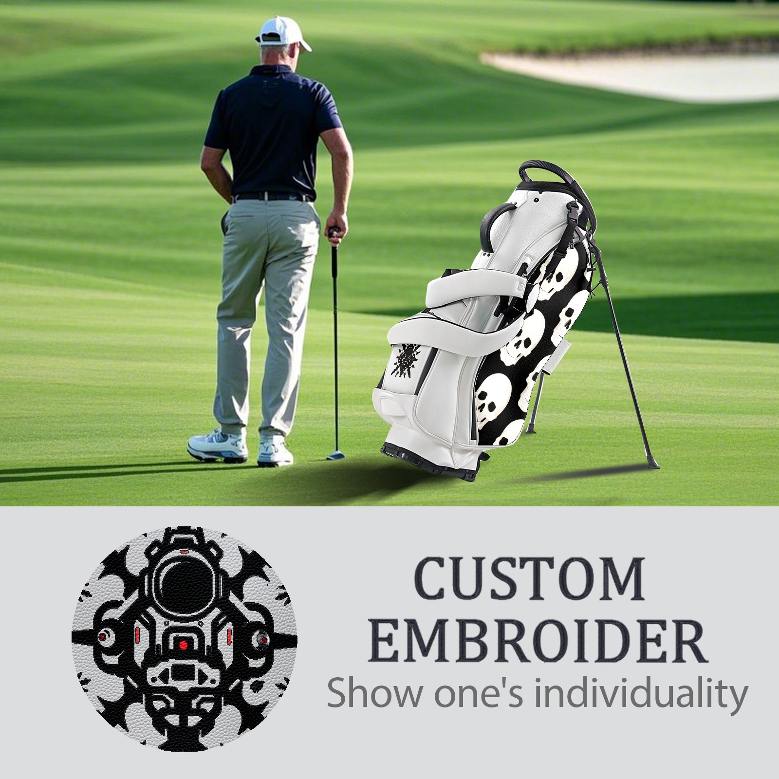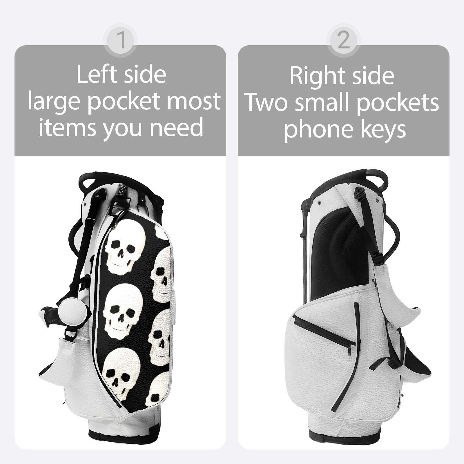 <p>The Golf Stand Bag, designed specifically for golf enthusiasts, offers a choice of 5 - way and 14 - way top dividers. Its 5/14 - compartment design with independent full - size club compartments safeguards clubs from collisions. Equipped with a rain cover, waterproof zippered pockets (tested to resist moderate to heavy rain), and a high - performance cooler pouch that can keep drinks cold for hours, it ensures a convenient golfing experience. The bag features thickened, breathable neoprene shoulder straps and an adjustable chest buckle, reducing shoulder fatigue by 35% compared to regular bags, and its automatic aluminum alloy stand provides stable support on various terrains. Crafted from top - tier, water - resistant litchi - grain PU leather, with double - stitched edges, reliable zippers tested for over 15,000 cycles, and anti - abrasion bottom studs, it guarantees durability. You can personalize it with embroidery on the front pocket and rain cover side (15*15cm area), and it comes in classic black and white, with a matte finish and litchi - grain texture that combines business and leisure styles. Measuring 130 cm in height, 37 cm in width, and 31 cm in depth (including rain cover) and 90 cm x 31 cm x 37 cm (excluding rain cover), it strikes a balance between storage and portability, capable of holding 14 standard - sized clubs and other essentials, and it also includes a dust cover. It's truly the perfect choice for golfers.<br></p>