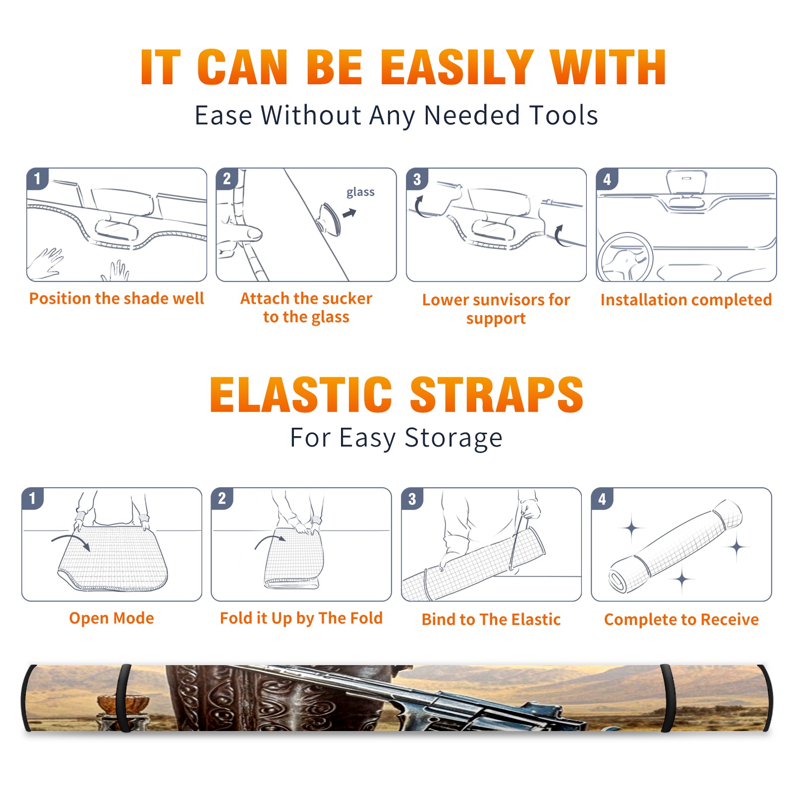 <p><b>Foldable Car Sun Shade for Windshield | UV Protection &amp; Heat Blocking | Universal Windshield Sun Shade Fit for Cars,Trucks,SUVs</b></p> <p><b>Reflective Aluminum Core</b></p> <p>The 3-layer construction (aluminum foil + double-layer bubble + 420D polyester) blocks UV rays and keeps the temperature of the car down compared to exposed vehicles on hot days.</p> <p><b>Electronics &amp; Interior Safeguard</b></p> <p>This car sunshade for windshield offers excellent reflection, preventing LCD screen glare, GPS malfunctions, and leather upholstery cracks caused by prolonged solar exposure.</p> <p><b>Wide Compatibility for Various Vehicle Types</b></p> <p>Crafted at 55"L x 30"W (140x76 cm), this windshield sunshade is designed to fit most cars, SUVs, and trucks, ensuring full coverage without adding bulk. Our UV-resistant and tear-resistant car sunshade is easy to install without tools. Its foldable design makes it convenient to adjust and store, taking up minimal space in your vehicle.</p> <p><b>Ideal For</b></p> <p>Daily commuters needing heat reduction from a car sunshade for windshield.</p> <p>RV and overlanding enthusiasts requiring sturdy&nbsp;front windshield sunshades.</p> <p>Luxury car owners need to prevent the fading of the car's interior.</p>