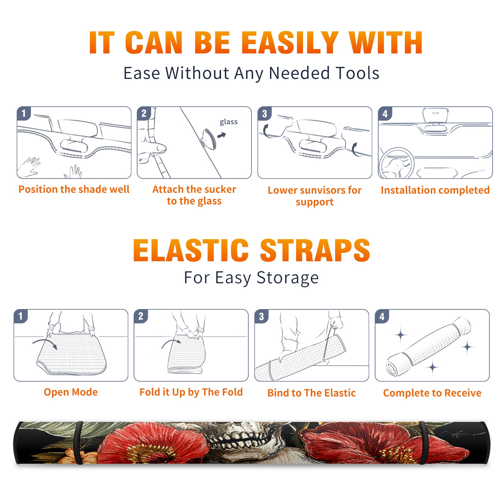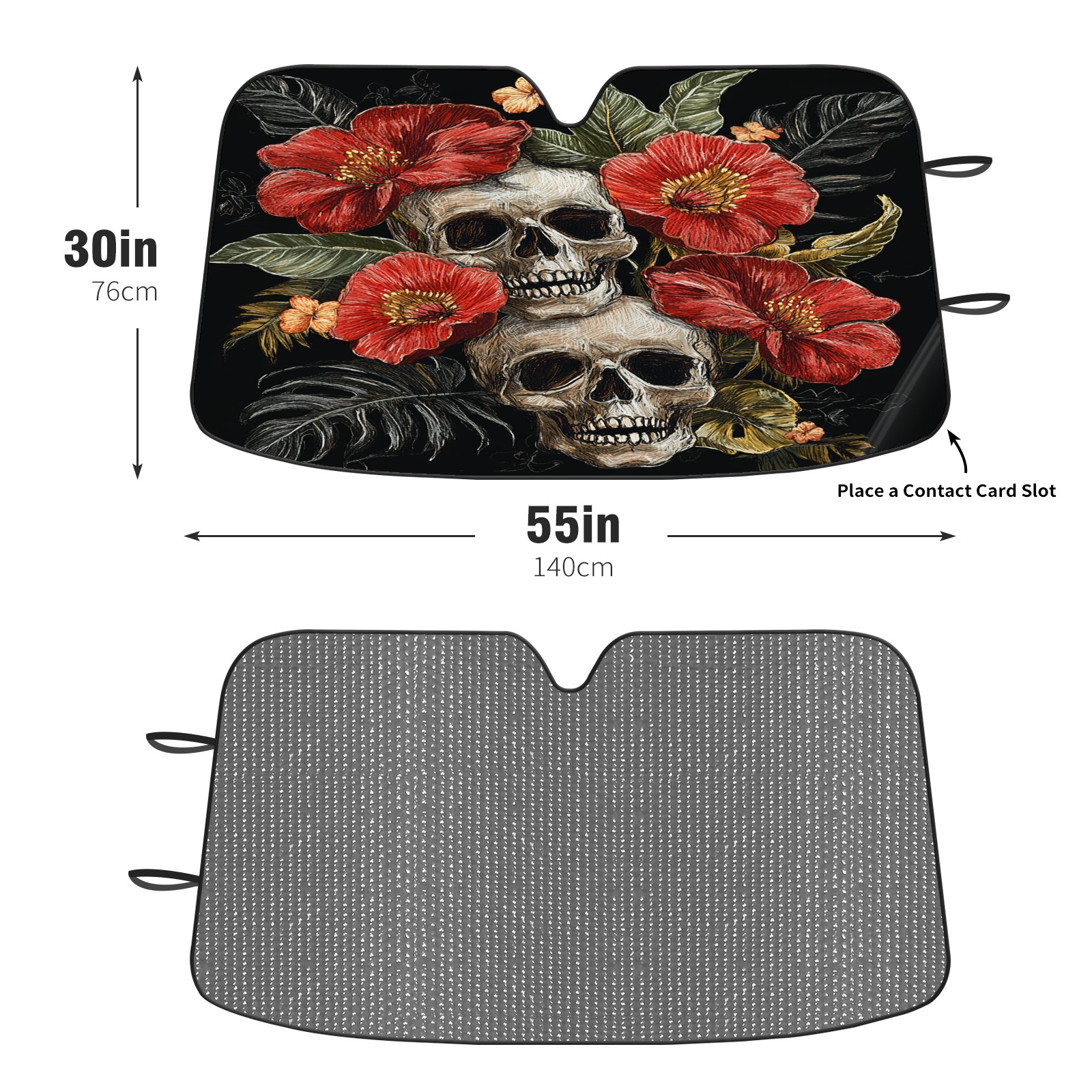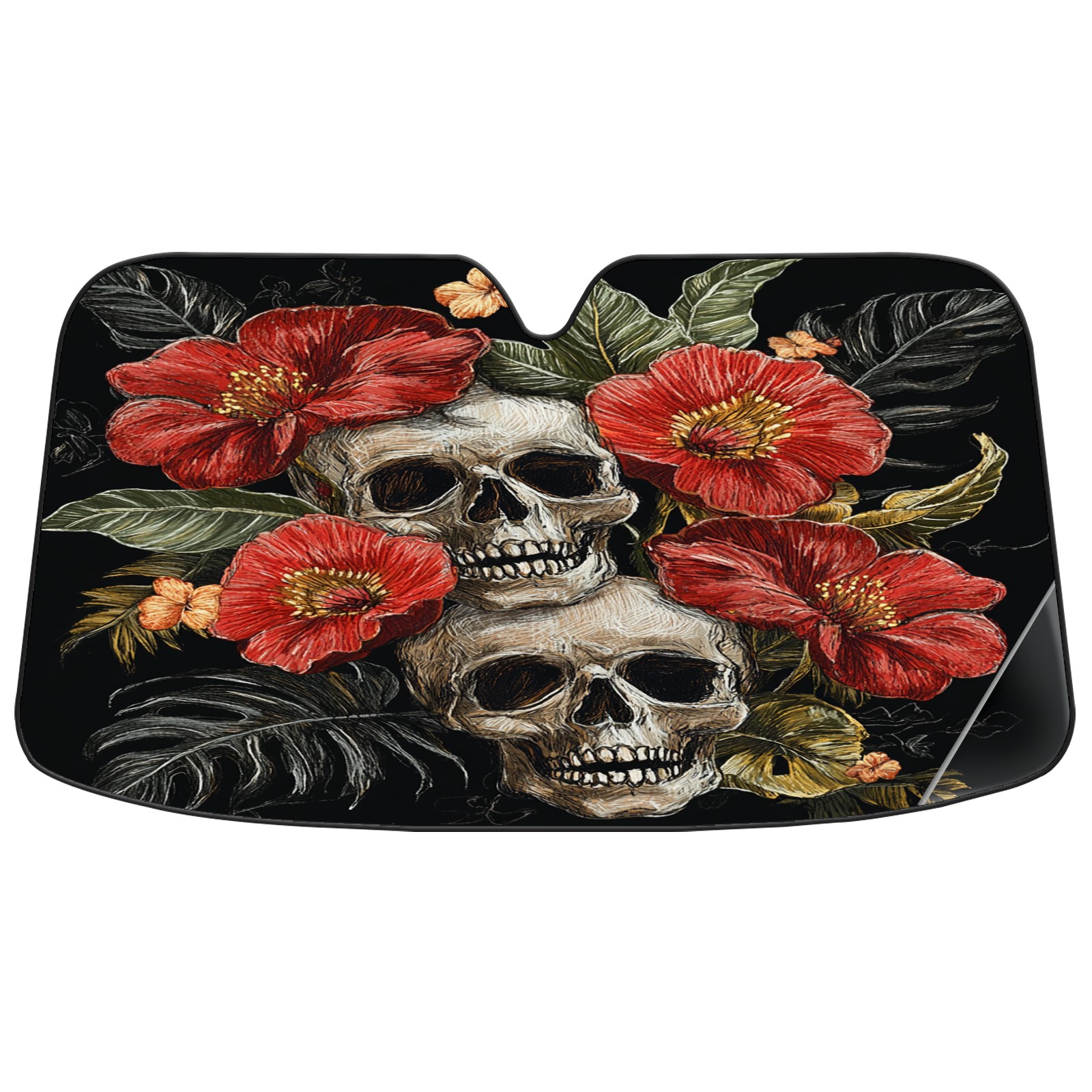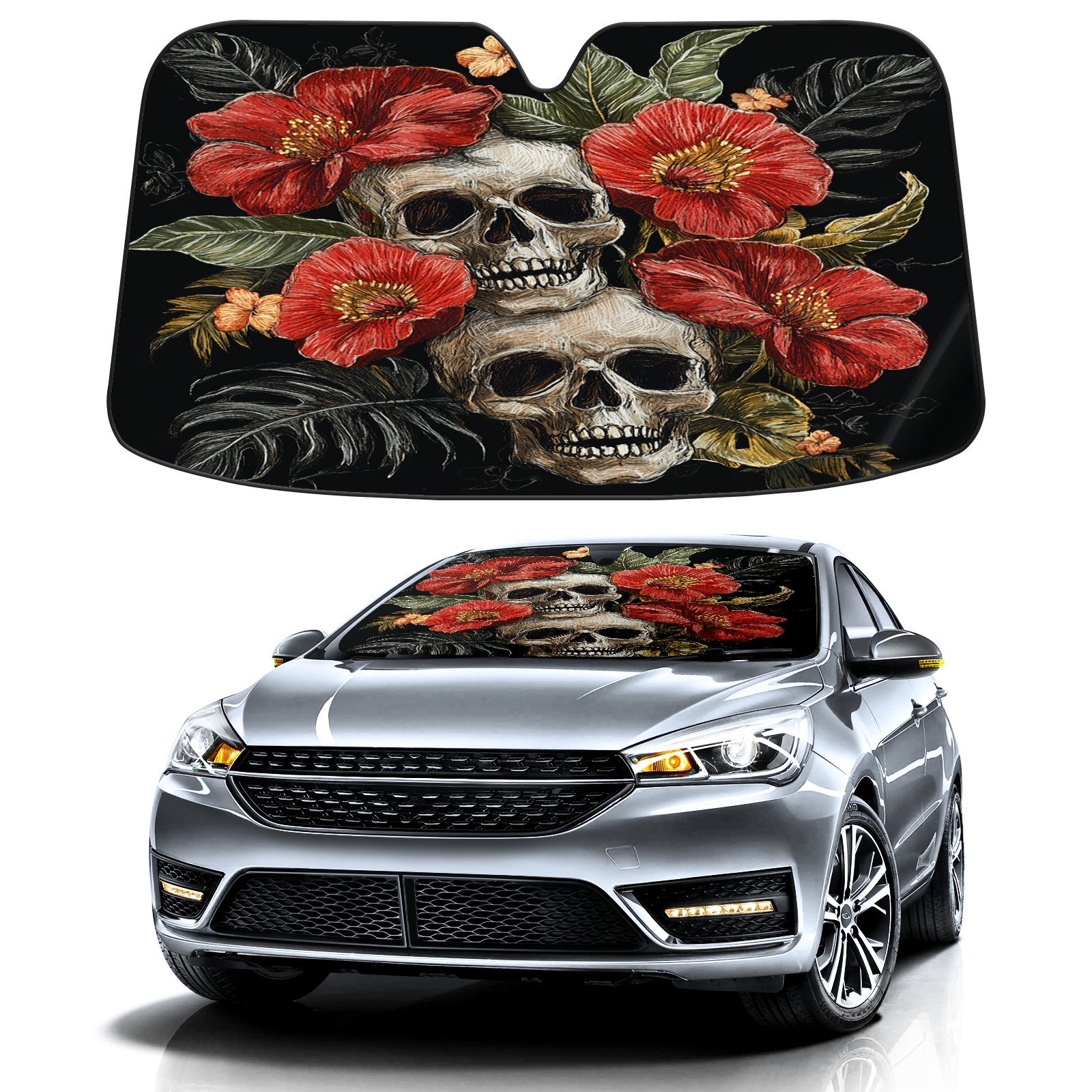 SAVHOQIR Car Sun Shade Foldable Skull Flowers Windshield Sun Shade 55''x30'' Vehicle Front Window Shade Protector for SUV Truck Car Sun Visor Blocks UV Rays