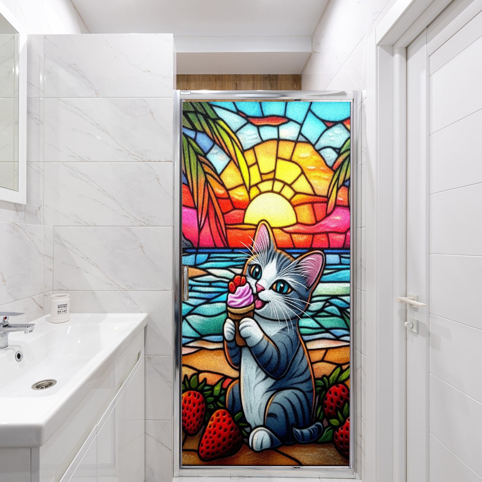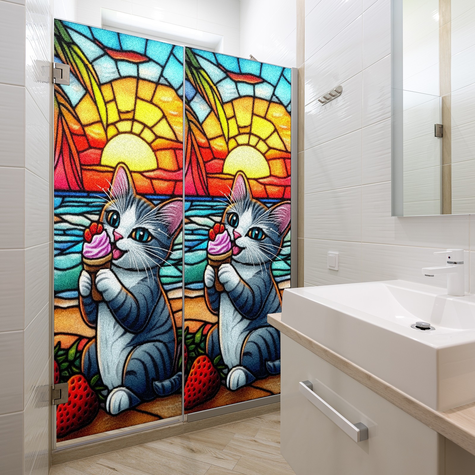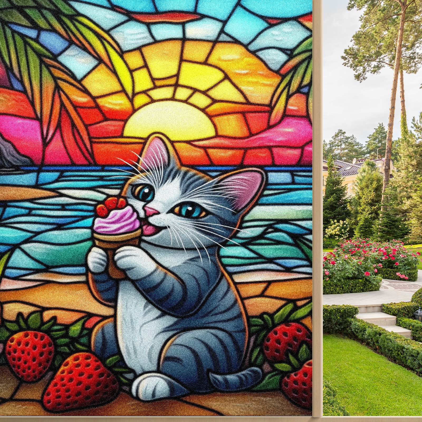 Stained Glass Window Film - Decorative Privacy Film for Windows, Peel and Stick Window Film for Bathroom/Office/Shower, Reusable and Easy to Cut 17.7"x23.6" (Cat Eating Ice Cream)