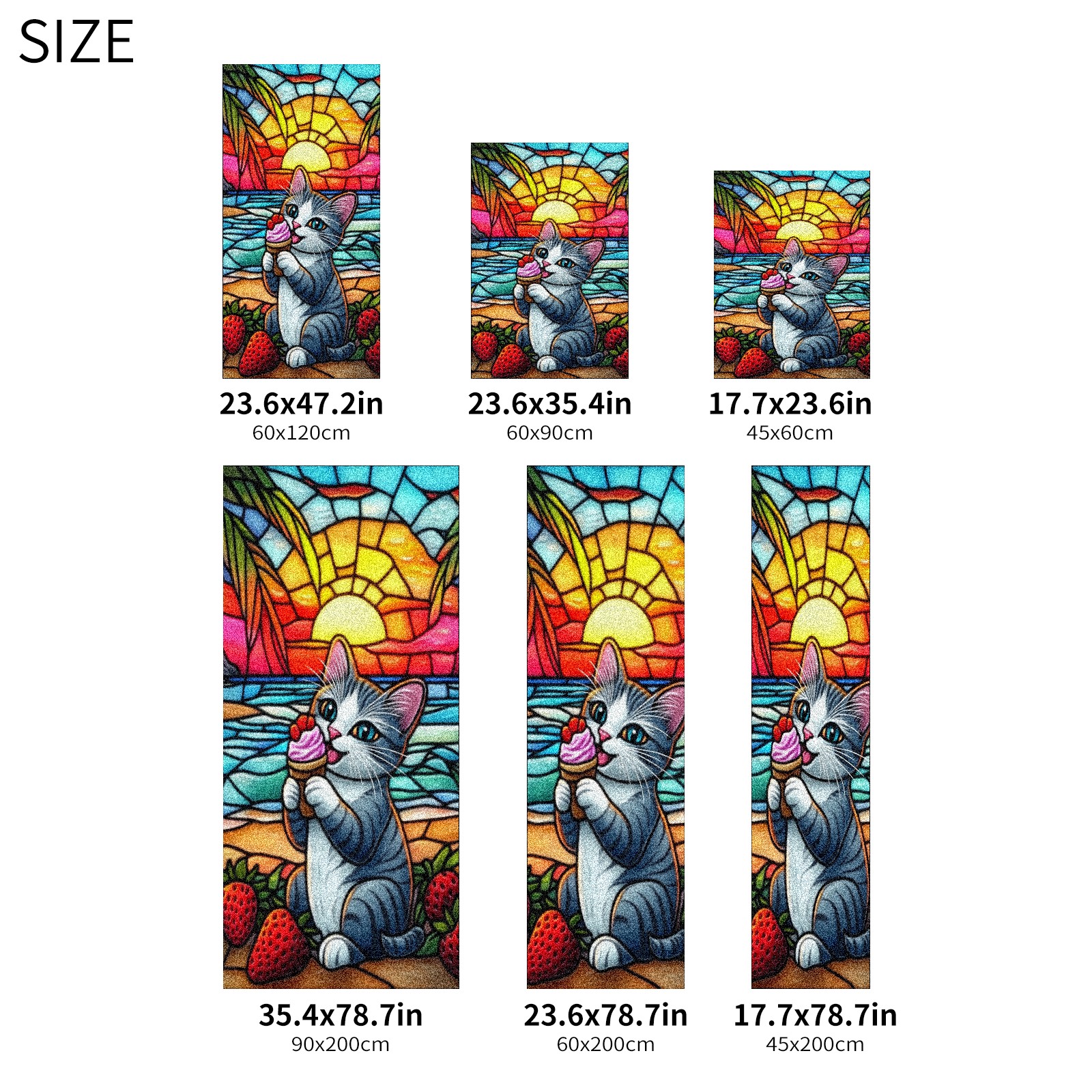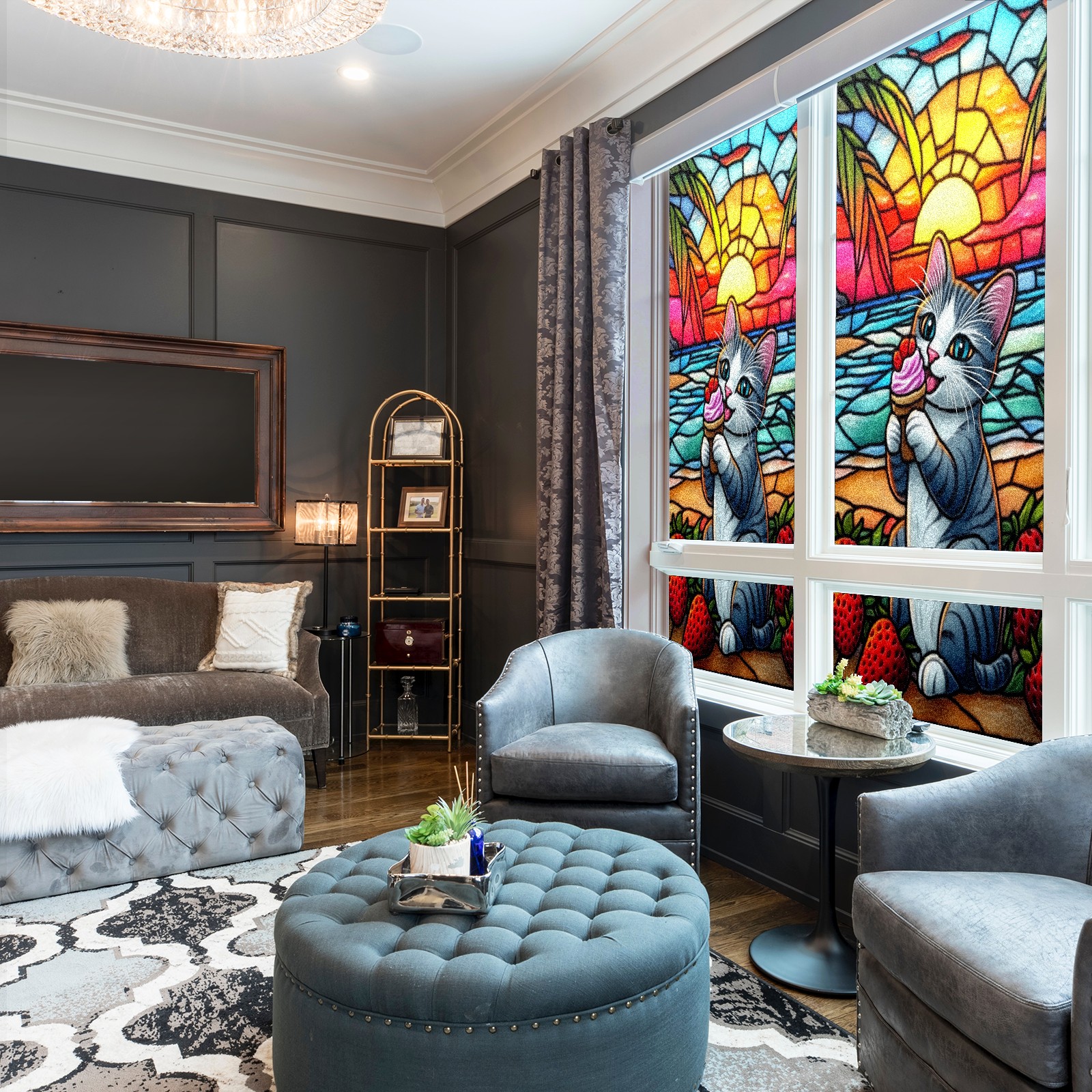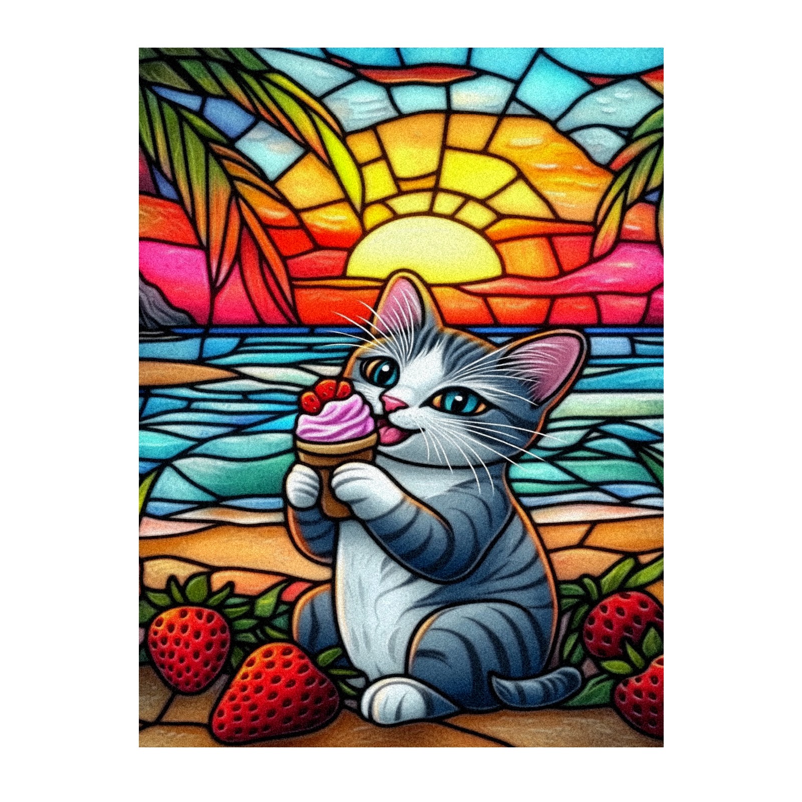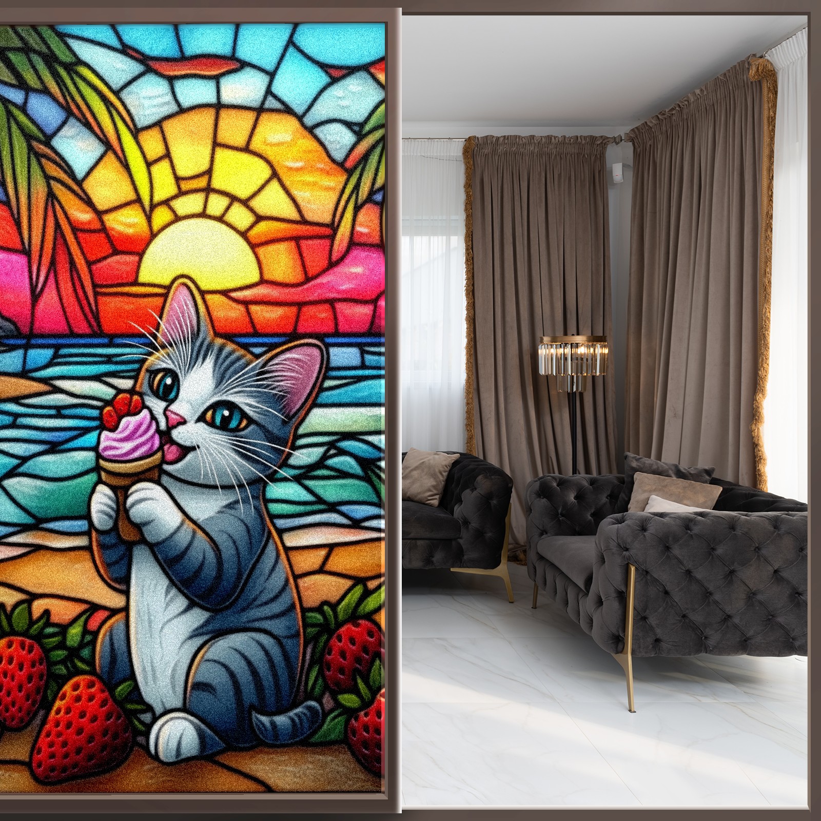 Stained Glass Window Film - Decorative Privacy Film for Windows, Peel and Stick Window Film for Bathroom/Office/Shower, Reusable and Easy to Cut 17.7"x23.6" (Cat Eating Ice Cream)